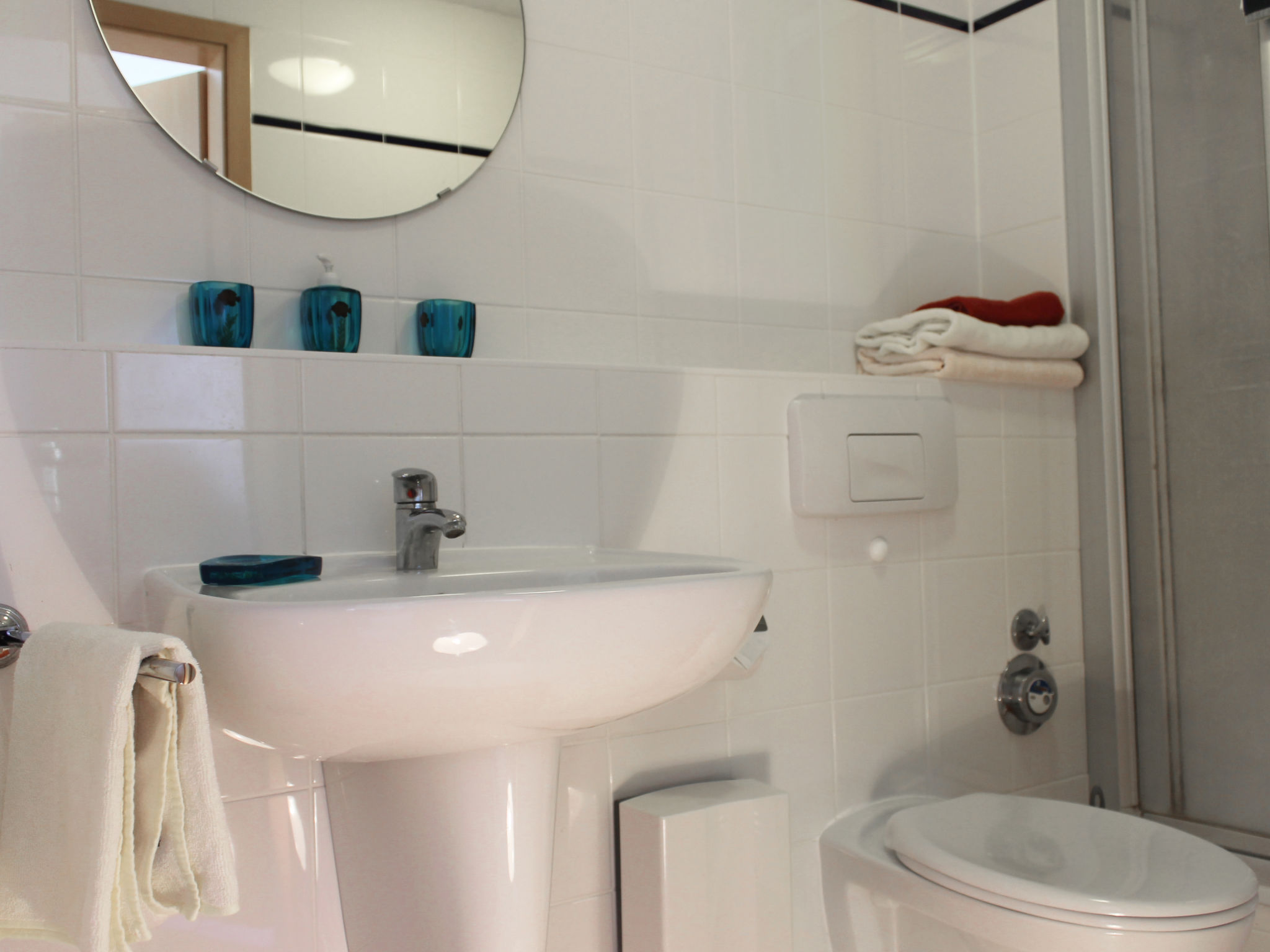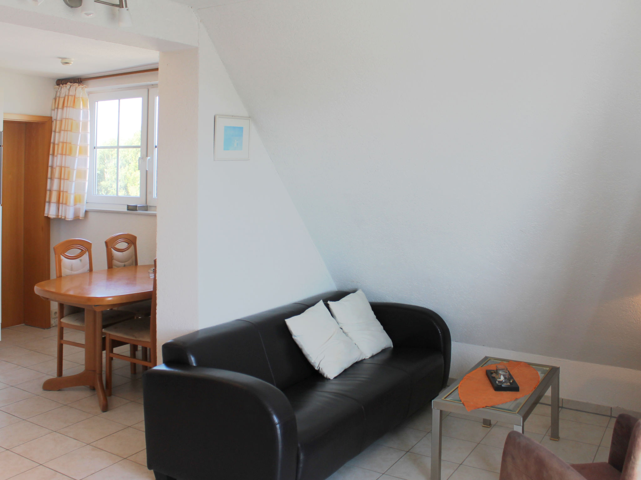3-Zimmer-Wohnung 53 m2 im 3. Stock. Wohn-/Esszimmer mit Sat-TV (Flachbildschirm), CD. Ausgang zum Balkon. 1 Zimmer mit 1 Doppelbett (180 cm, Länge 200 cm). Kochnische (Backofen, Geschirrspüler, 4 Glaskeramikherd Platten, elektrische Kaffeemaschine). Dusche/WC. Dachgeschoss: (steile Treppe) 1 abgeschrägtes, offenes Zimmer mit 1 Doppelbett (180 cm, Länge 200 cm). E-Heizung. Kleiner Balkon 3 m2. Balkonmöbel. Sicht auf das Meer. Bitte beachten: Nichtraucher-Unterkunft. Rauchmelder, kein Fahrstuhl. Die Wohnung befindet sich auf zwei Ebenen mit Raumspartreppe zum stark abgeschrägten Dachgeschoss (Spitzboden).