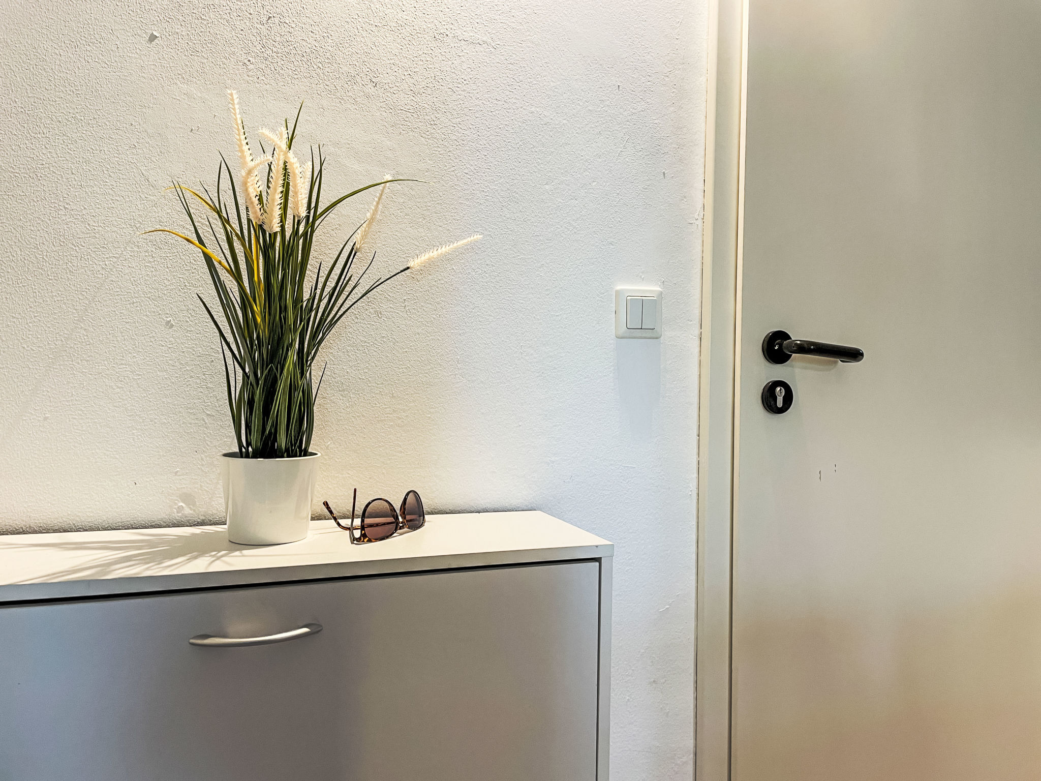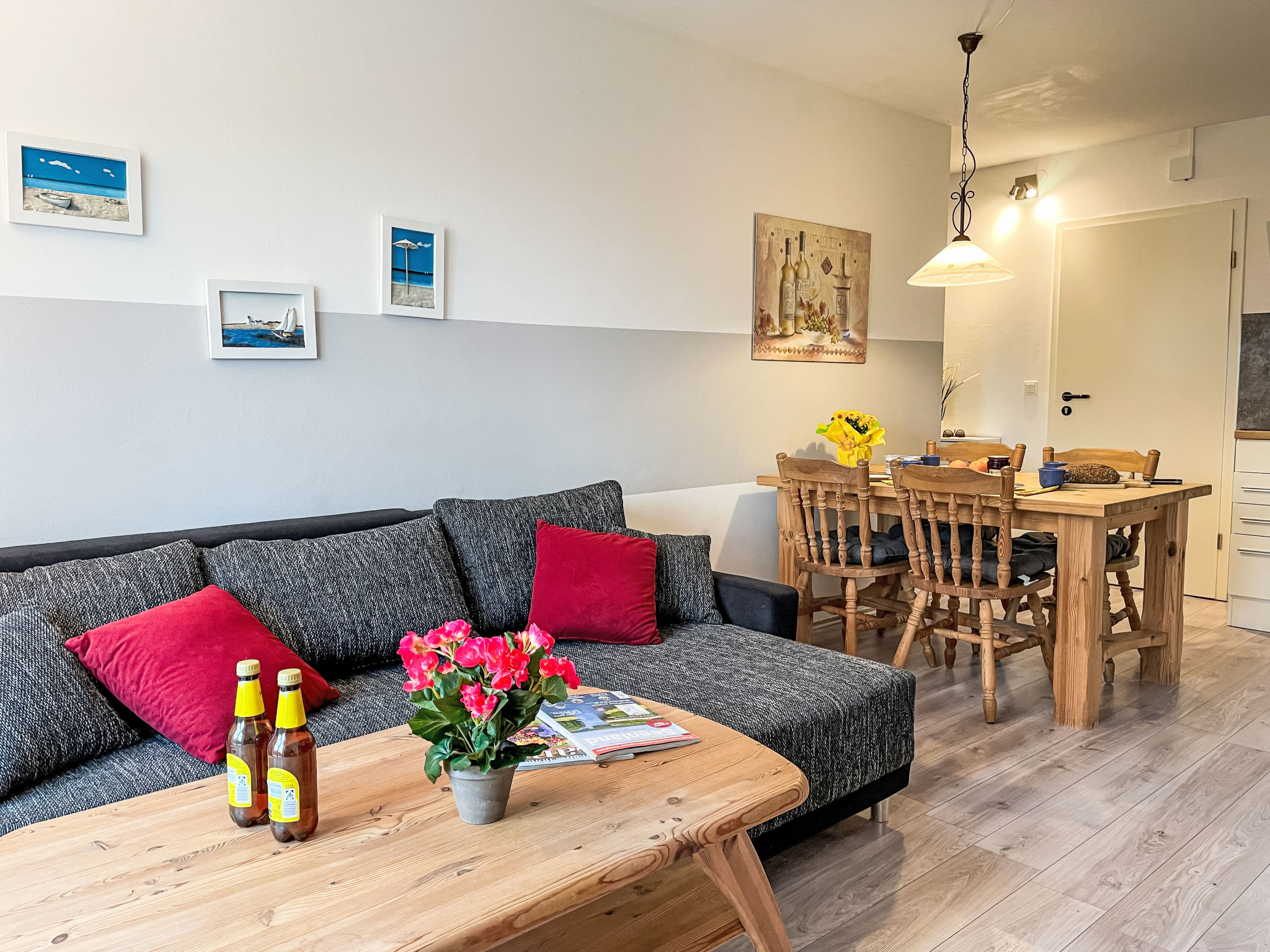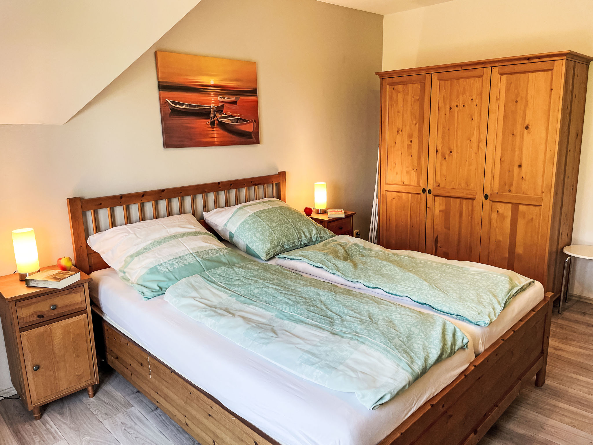 2-Zimmer-Wohnung 46 m2 im 1. Stock. Objekt geeignet für 2 Erwachsene + 2 Kinder. Wohn-/Schlafzimmer mit 1 Doppeldiwanbett (140 cm, Länge 200 cm), Sat-TV (Flachbildschirm), DVD. Ausgang zum Balkon. 1 Zimmer mit 1 Doppelbett (180 cm, Länge 200 cm). Ausgang zum Balkon. Kochnische (2 Kochplatten, Mini-Backofen, elektrische Kaffeemaschine). Dusche/WC. E-Heizung. Balkon 8 m2. Balkonmöbel. Bitte beachten: Nichtraucher-Unterkunft. Rauchmelder.