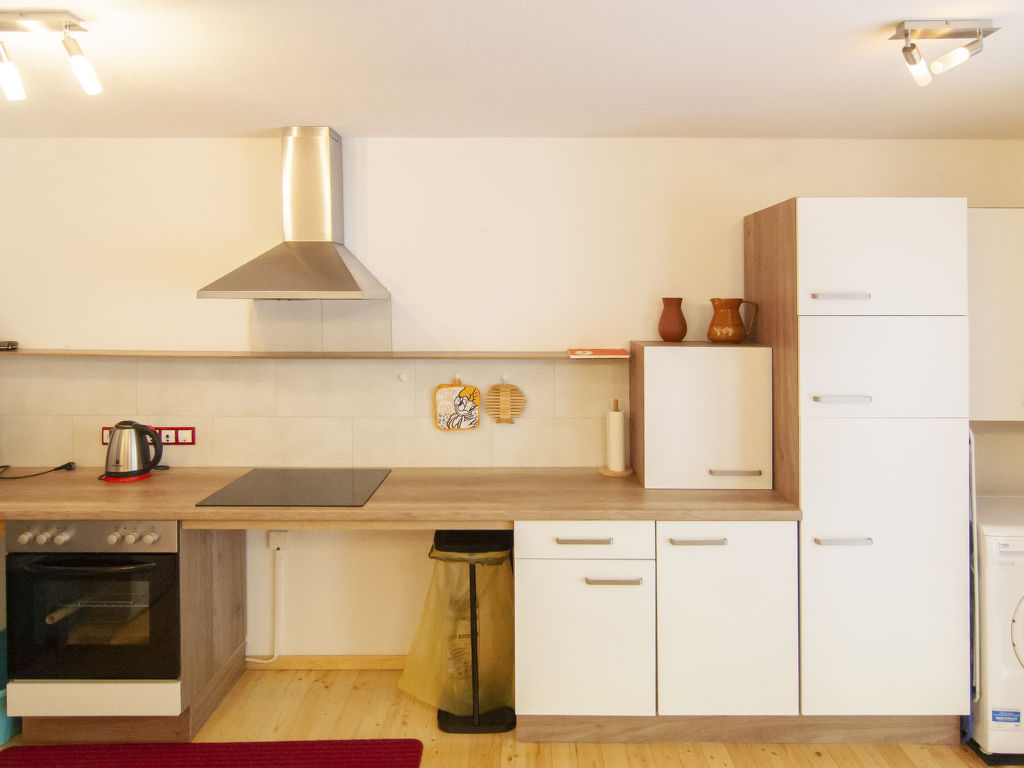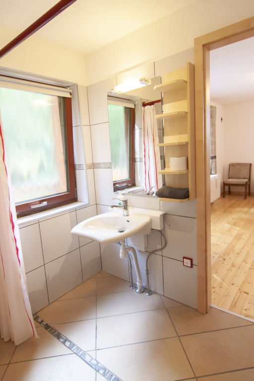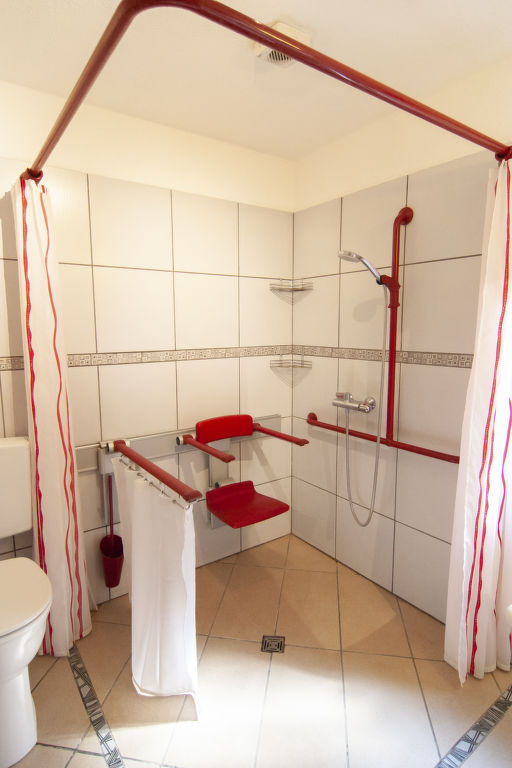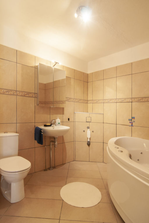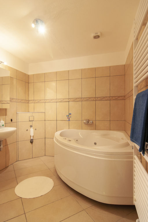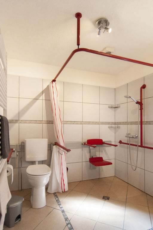 2-Zimmer-Wohnung 90 m2, im Erdgeschoss. Geschmackvoll und gemütlich eingerichtet: Wohn-/Schlafzimmer 39 m2 mit 1 Doppeldiwanbett (140 cm, Länge 200 cm), 1 Wandklappbett (90 cm, Länge 200 cm), Sat-TV (Flachbildschirm), DVD. Ausgang zum Balkon, zur Terrasse. 1 Zimmer 23 m2 mit 1 Doppelbett (180 cm, Länge 200 cm), 1 Wandschrankbett (90 cm, Länge 200 cm), Sat-TV (Flachbildschirm). Ausgang zum Balkon. Kochnische (Backofen, Geschirrspüler, 4 Glaskeramikherd Platten, Toaster, Wasserkocher, elektrische Kaffeemaschine). 2 Bäder/WC, Whirlbadewanne. Balkon 12 m2, Terrasse 6 m2, überdacht. Terrassenmöbel, Balkonmöbel. Zur Verfügung: Waschmaschine. Internet (Wireless LAN, gratis). Bitte beachten: Nichtraucher-Unterkunft. Maximal 2 Haustiere/Hunde erlaubt. Rauchmelder, Feuerlöscher. Balkon und Terrasse sind nicht von den anderen Wohnungen abgetrennt. Optimale Barrierefreiheit: der Zugang zu Wohnung, Balkon am Bach und zur Dachterrasse, die Fenster und Türen sowie ein Badezimmer sind vollständig barrierefrei ausgelegt.