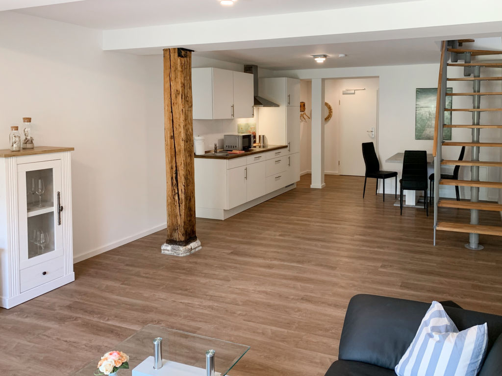 "Langeoog", 2-Zimmer-Wohnung 70 m2 auf 2 Stockwerken, im Erdgeschoss. Geschmackvoll und gemütlich eingerichtet: Wohn-/Esszimmer mit Sat-TV (Flachbildschirm). Ausgang zur Terrasse. Kochnische (Geschirrspüler, 4 Glaskeramikherd Platten, Toaster, Wasserkocher, Mikrowelle, elektrische Kaffeemaschine). Sep. WC. Obergeschoss: 1 abgeschrägtes, offenes Zimmer mit 1 Bett (80 cm, Länge 200 cm), 1 Doppelbett (2 x 90 cm, Länge 200 cm). Dusche/WC. Terrassenmöbel. Zur Verfügung: Kinderhochstuhl (extra). Internet (Wireless LAN, gratis). Bitte beachten: Nichtraucher-Unterkunft. Maximal 1 kleines Haustier/Hund erlaubt.