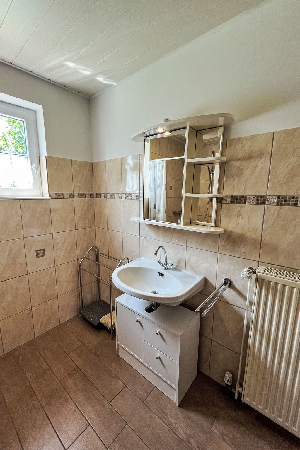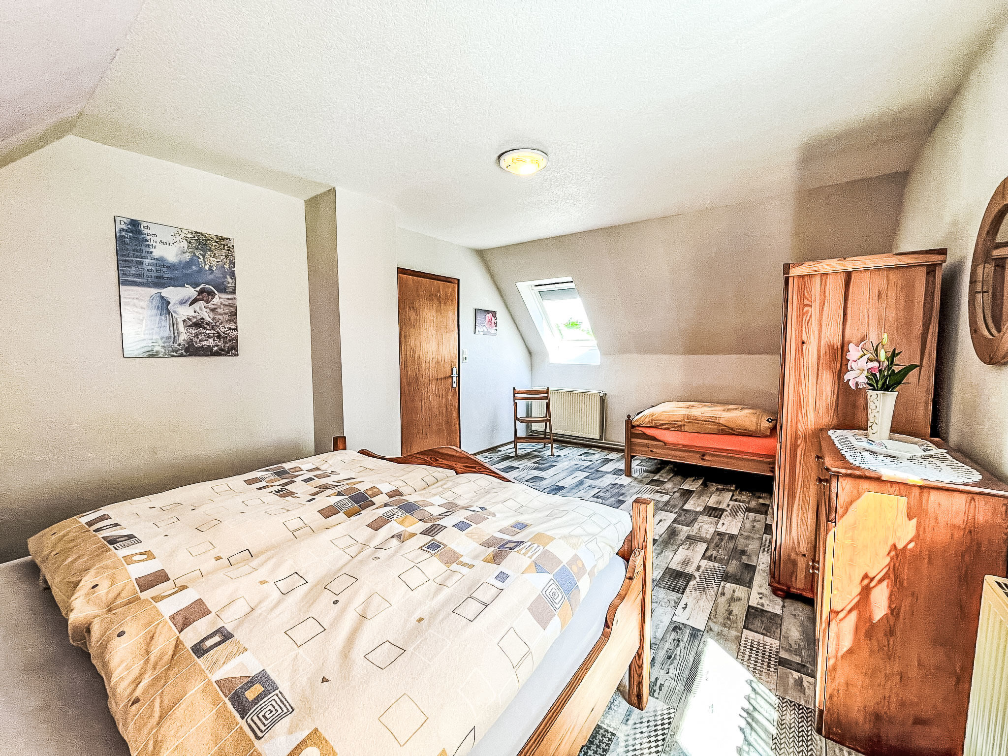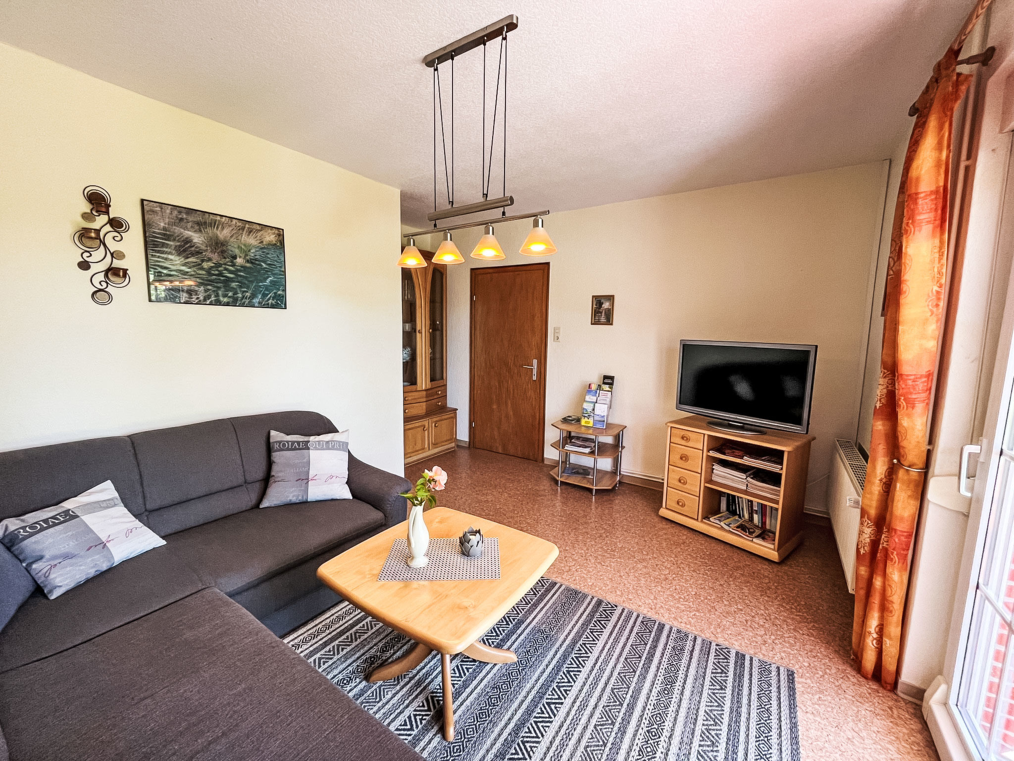 3-Zimmer-Wohnung 70 m2 auf 2 Stockwerken, im Erdgeschoss. Gemütlich eingerichtet: Wohnzimmer mit Sat-TV (Flachbildschirm). Ausgang zur Terrasse. 1 Zimmer mit 1 x 2 Etagenbetten (90 cm, Länge 200 cm). Grosse Küche (Backofen, Geschirrspüler, 4 Glaskeramikherd Platten, Toaster, Wasserkocher, Mikrowelle, elektrische Kaffeemaschine) mit Essecke. Dusche/WC. Obergeschoss: 1 Zimmer mit 1 Bett (90 cm, Länge 200 cm), 1 Doppelbett (2 x 90 cm, Länge 200 cm). Terrassenmöbel, Gartengrill (mobil). Zur Verfügung: Kinderhochstuhl. Bitte beachten: Nichtraucher-Unterkunft. Rauchmelder.
