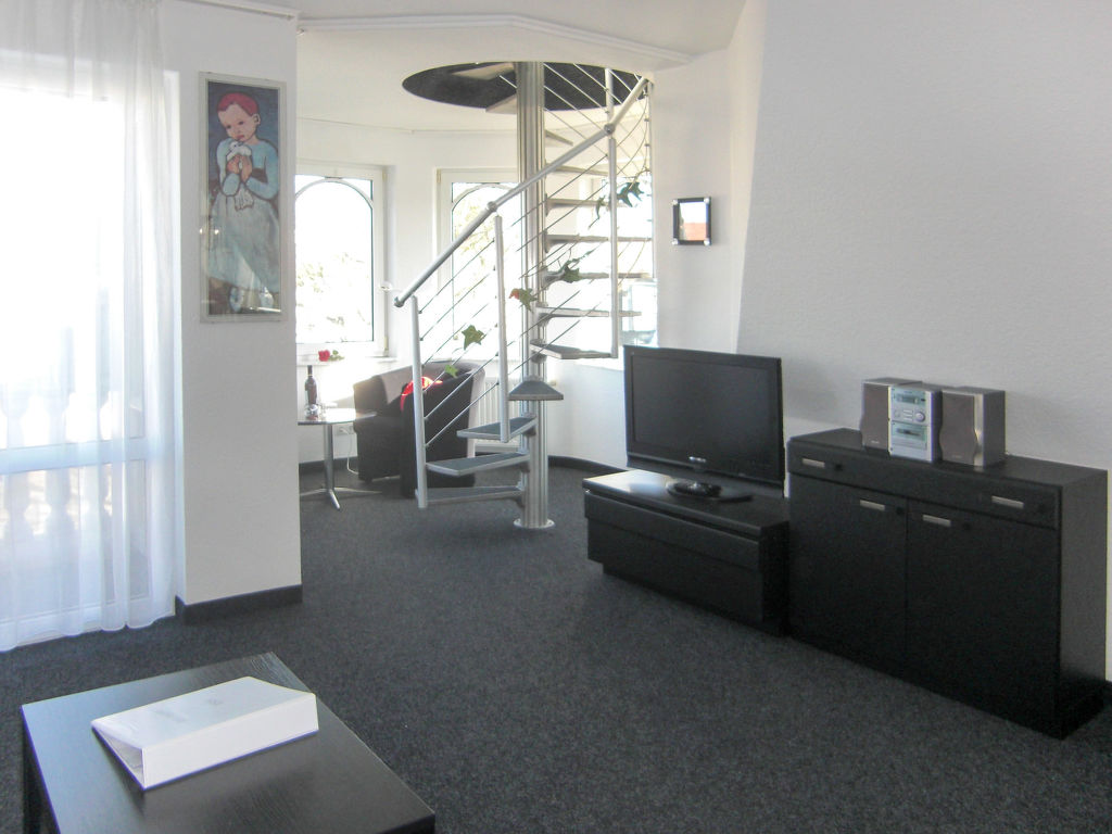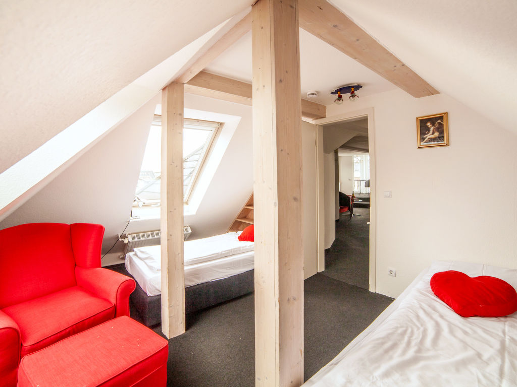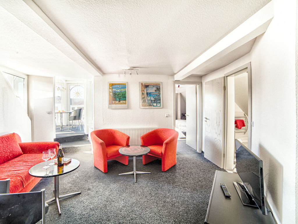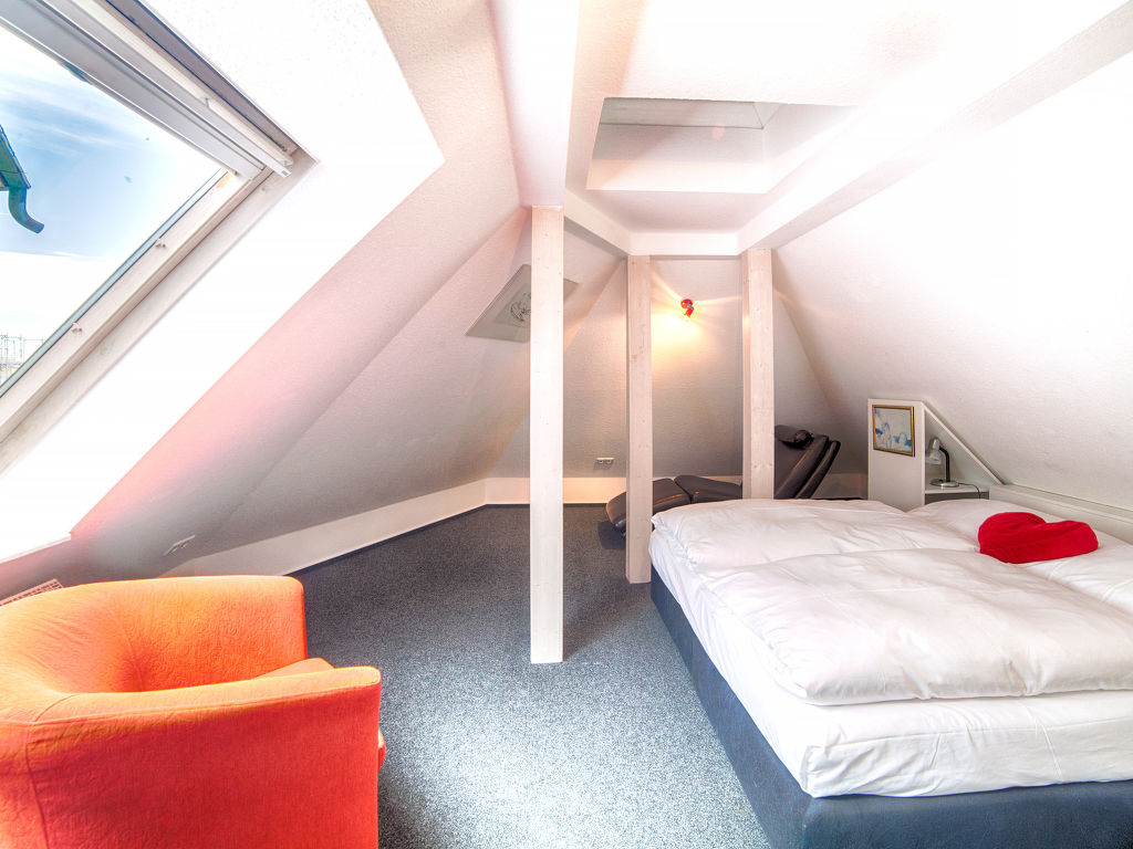 3-Zimmer-Wohnung 60 m2, im Obergeschoss. Stilvoll und gemütlich eingerichtet: abgeschrägtes Wohnzimmer mit Sat-TV und Radio. Ausgang zum Balkon. Abgeschrägt 1 Zimmer mit 1 Doppelbett. Abgeschrägt 1 Zimmer mit 2 Betten. Offene Küche (4 Kochplatten, Backofen, Geschirrspüler, Toaster, Wasserkocher, Mikrowelle, elektrische Kaffeemaschine) mit Esstisch. Bad/WC. Dachgeschoss: Galerie mit Panoramafenster. Balkonmöbel. Zur Verfügung: Kinderhochstuhl, Babybett. Internet (Wireless LAN, gratis). Bitte beachten: Nichtraucher-Unterkunft. Maximal 1 Haustier/Hund erlaubt.