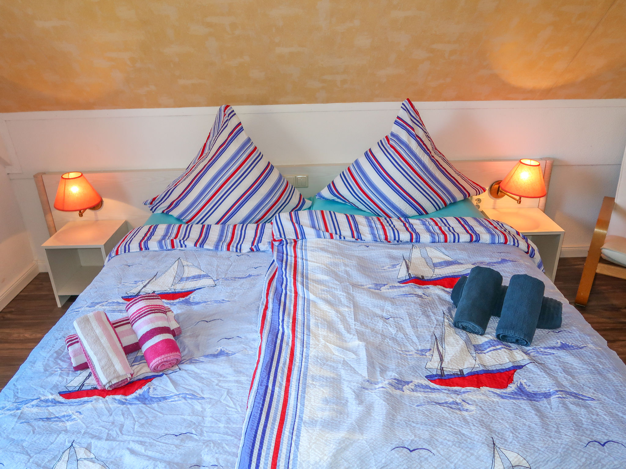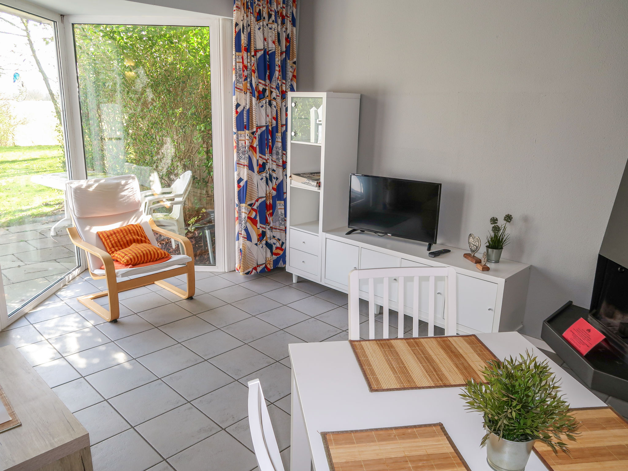 3-Zimmer-Doppelhaushälfte 65 m2 auf 2 Stockwerken. Hell, zweckmässig und gemütlich eingerichtet: Wohn-/Esszimmer mit offenem Kamin und Kabel-TV. Ausgang zur Terrasse. Offene Küche (4 Kochplatten, Toaster, Wasserkocher, Mikrowelle, elektrische Kaffeemaschine). Dusche/WC. Obergeschoss: abgeschrägt 1 Zimmer mit 1 Doppelbett. Abgeschrägt 1 Zimmer mit 2 Betten. Rasen. Terrassenmöbel. Zur Verfügung: Kinderhochstuhl, Babybett.
