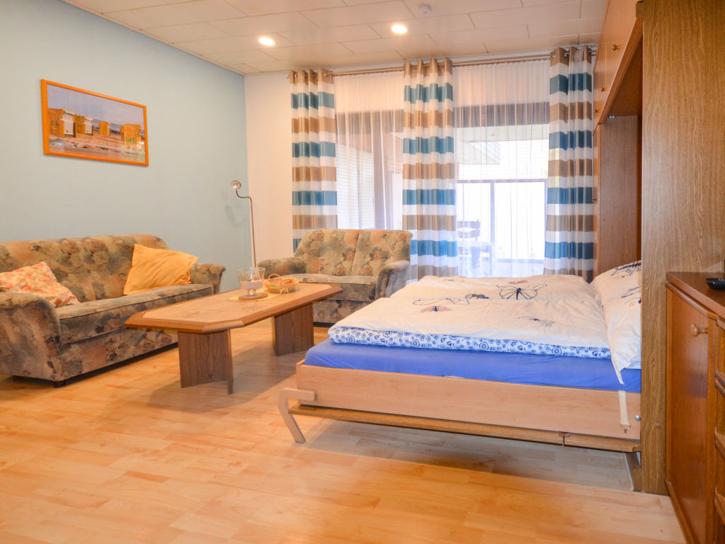 1-Zimmer-Wohnung 30 m2, im Erdgeschoss. Gemütlich eingerichtet: Wohn-/Schlafzimmer mit 1 Doppelwandklappbett, Sat-TV, Radio und CD. Kochnische (Backofen, Mikrowelle, elektrische Kaffeemaschine). Dusche/WC. Kleine Terrasse. Bitte beachten: Nichtraucher-Unterkunft. 1 Haustier auf Anfrage möglich (EUR 20.00/Aufenthalt).