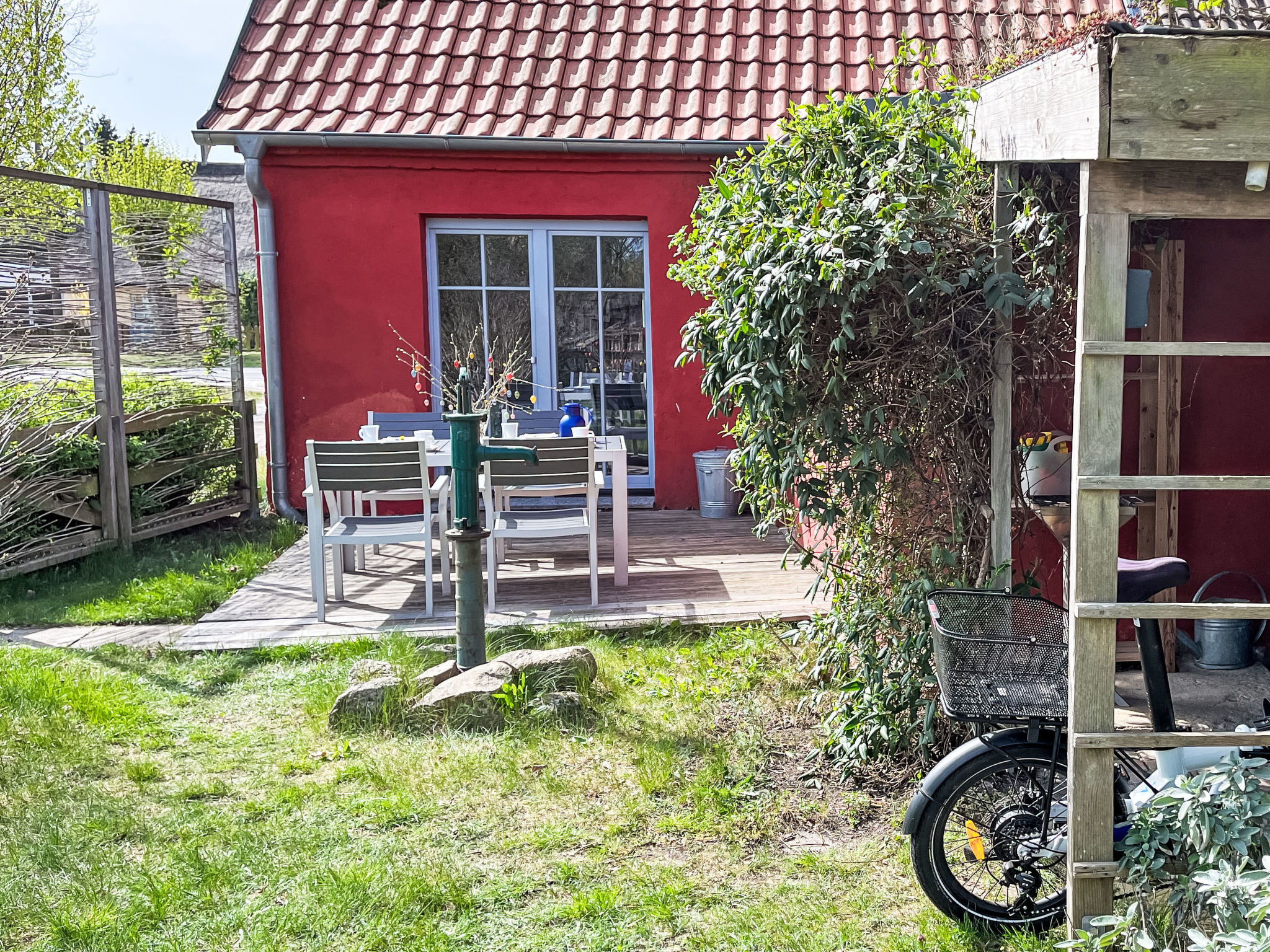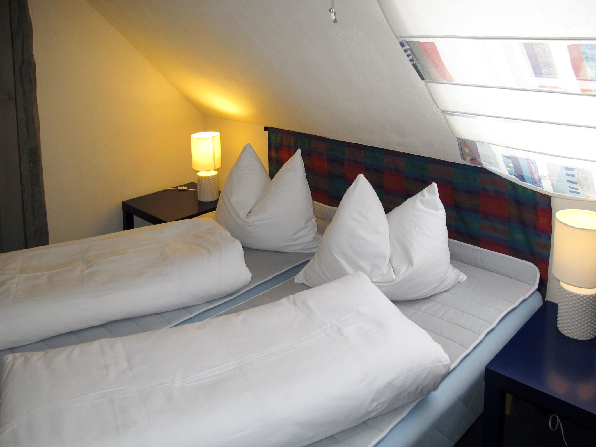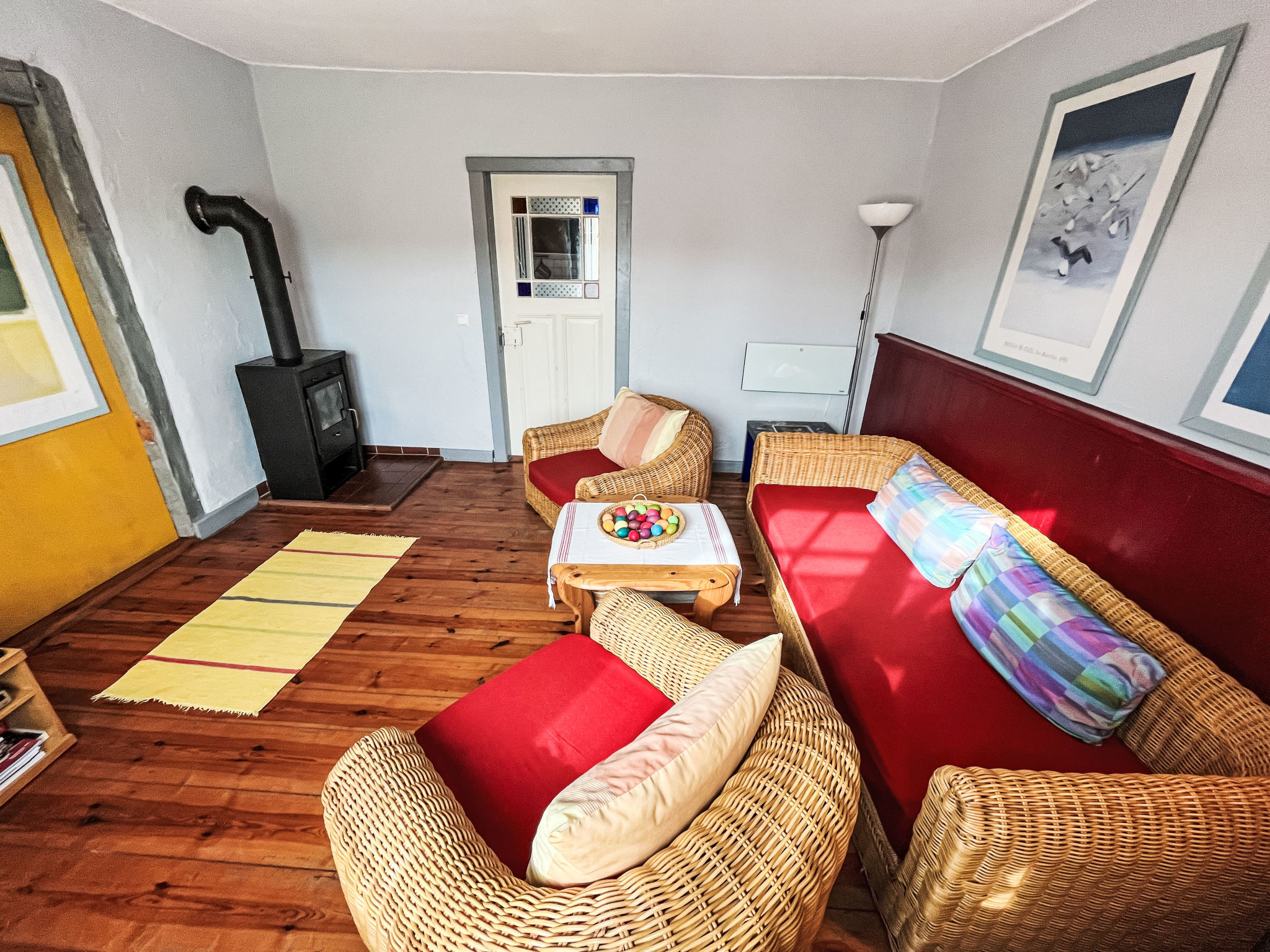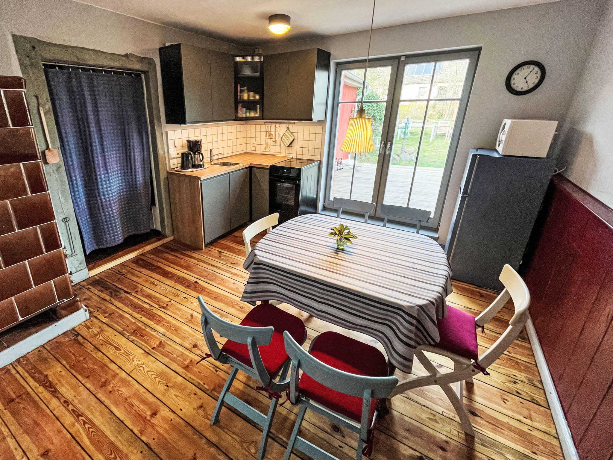 3-Zimmer-Doppelhaushälfte 70 m2 auf 2 Stockwerken. Schön und gemütlich eingerichtet: Wohnzimmer mit Schwedenofen, Sat-TV und CD. Küche (Backofen, Geschirrspüler, 4 Glaskeramikherd Platten, Wasserkocher, Mikrowelle, Tiefkühler, elektrische Kaffeemaschine) mit Esstisch, Kachelofen. Ausgang zur Terrasse. Dusche/WC, Sauna. Obergeschoss: 1 abgeschrägtes Zimmer mit 1 Doppelbett. 1 abgeschrägtes Zimmer mit 1 Diwanbett und 1 Doppelbett. E-Heizung. Holzböden. Terrasse 10 m2. Terrassenmöbel. Zur Verfügung: Waschmaschine. Bitte beachten: Nichtraucher-Haus. Rauchmelder.