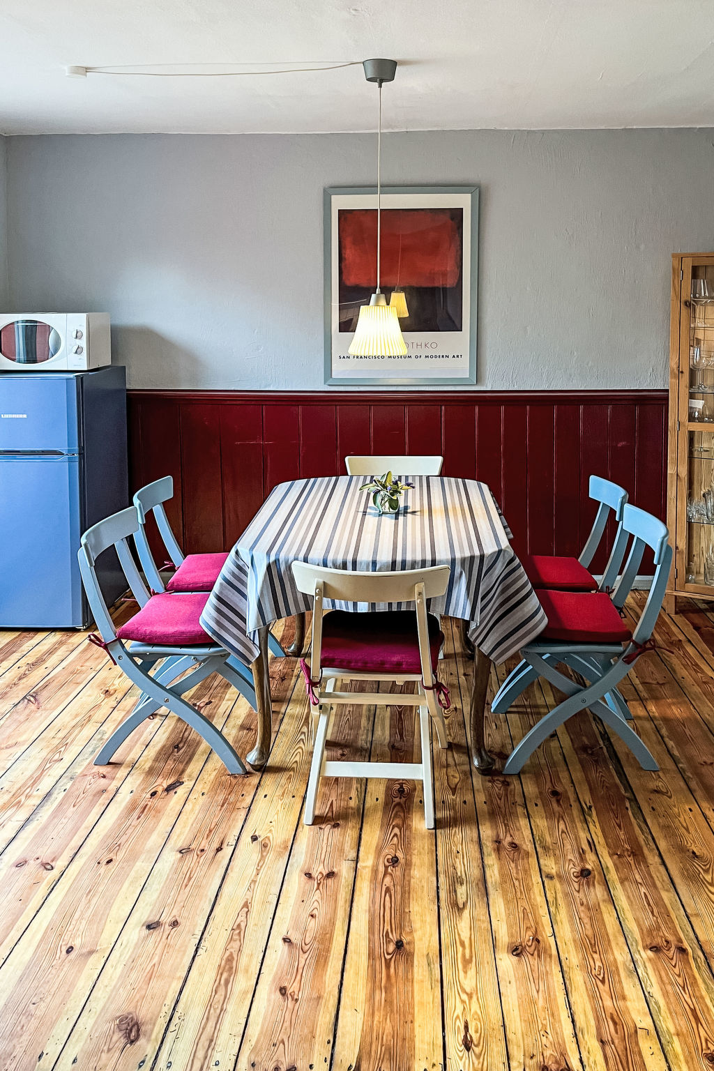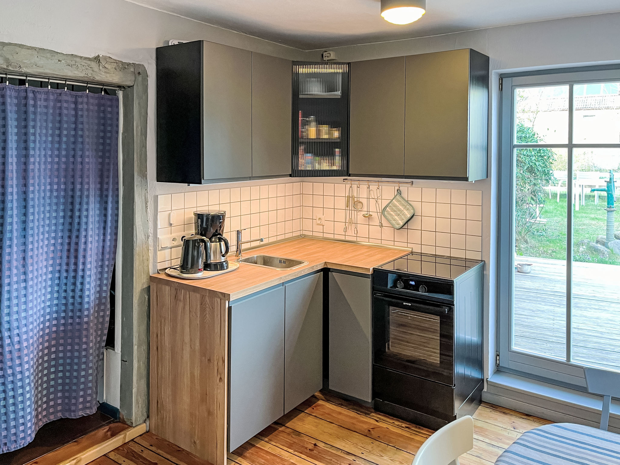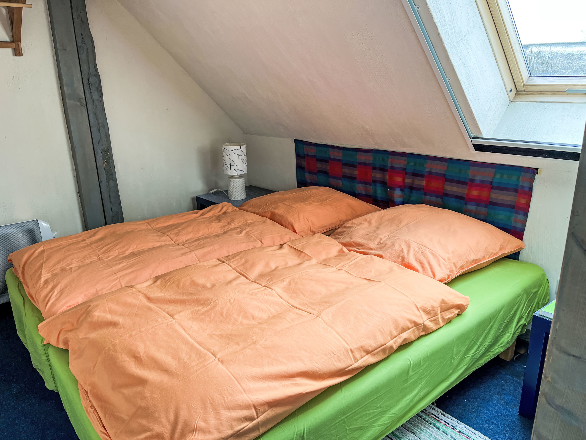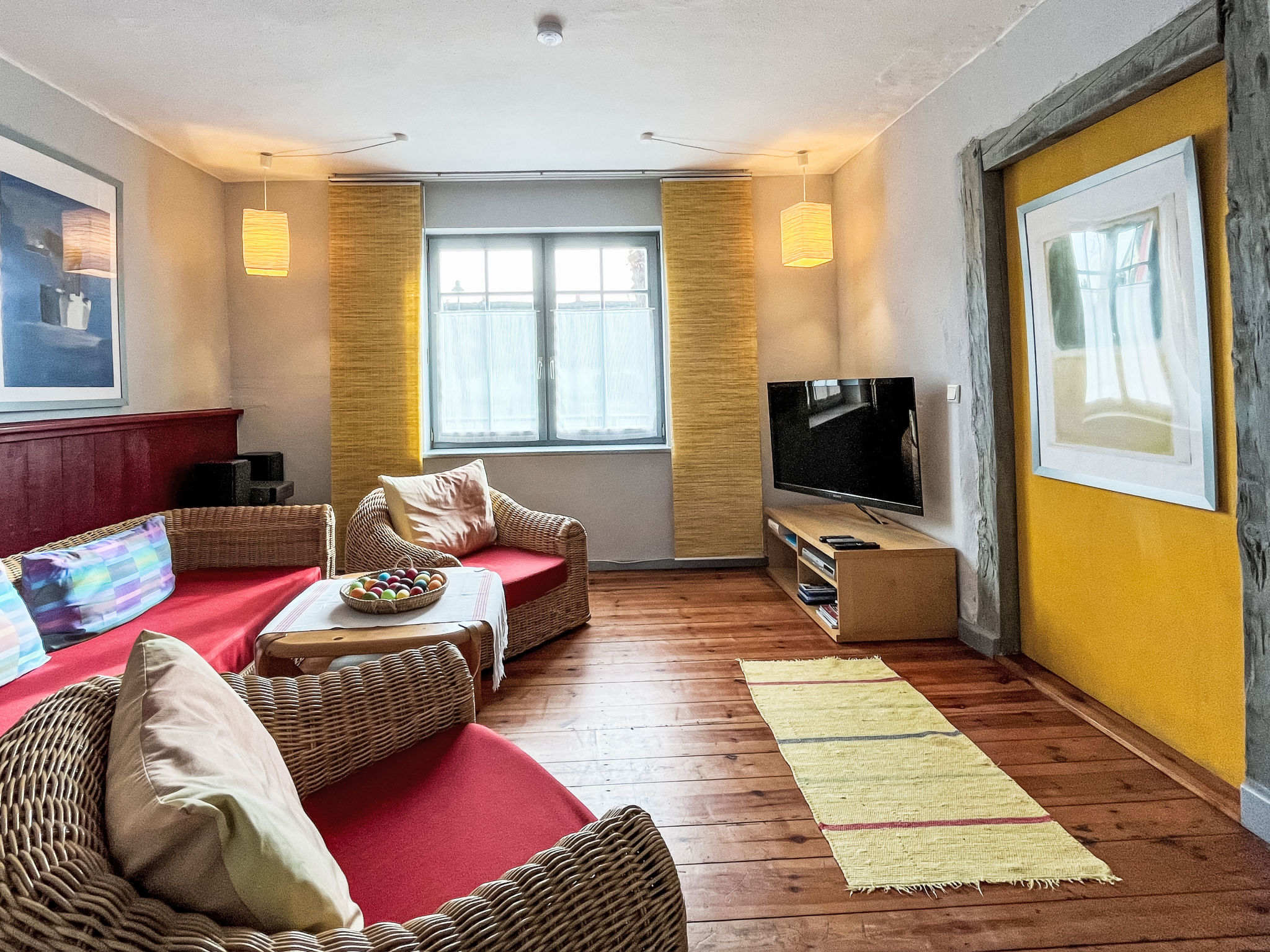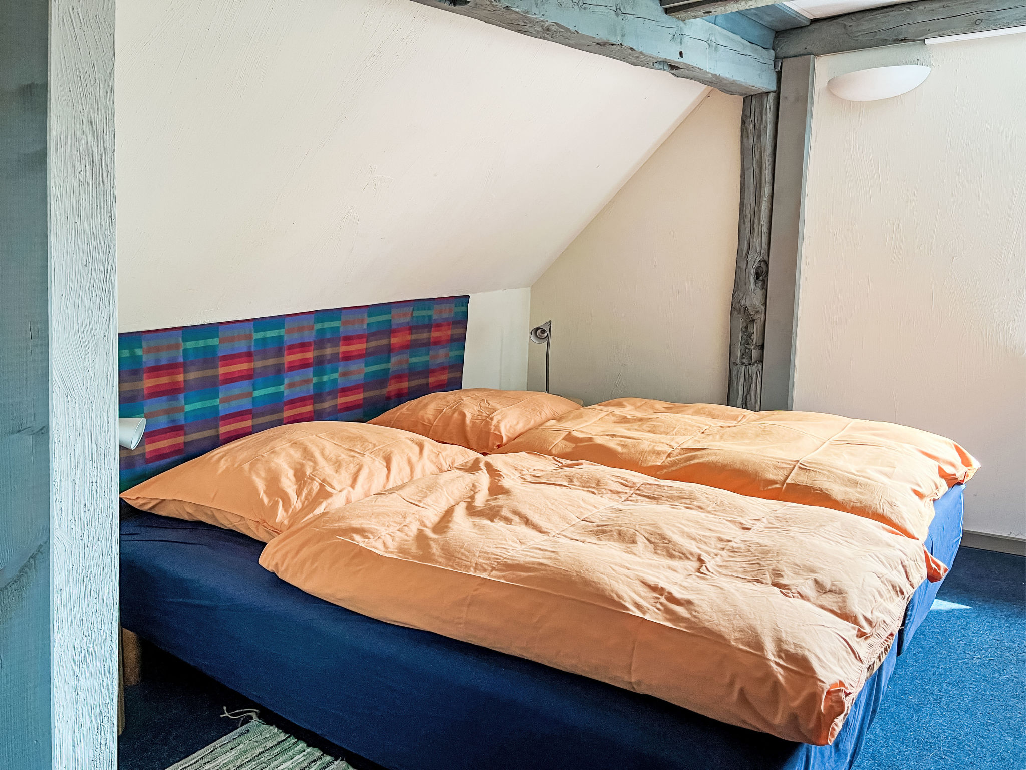 3-Zimmer-Doppelhaushälfte 70 m2 auf 2 Stockwerken. Schön und gemütlich eingerichtet: Wohnzimmer mit Schwedenofen, Sat-TV und CD. Küche (Backofen, Geschirrspüler, 4 Glaskeramikherd Platten, Wasserkocher, Mikrowelle, Tiefkühler, elektrische Kaffeemaschine) mit Esstisch, Kachelofen. Ausgang zur Terrasse. Dusche/WC, Sauna. Obergeschoss: 1 abgeschrägtes Zimmer mit 1 Doppelbett. 1 abgeschrägtes Zimmer mit 1 Diwanbett und 1 Doppelbett. E-Heizung. Holzböden. Terrasse 10 m2. Terrassenmöbel. Zur Verfügung: Waschmaschine. Bitte beachten: Nichtraucher-Haus. Rauchmelder.
