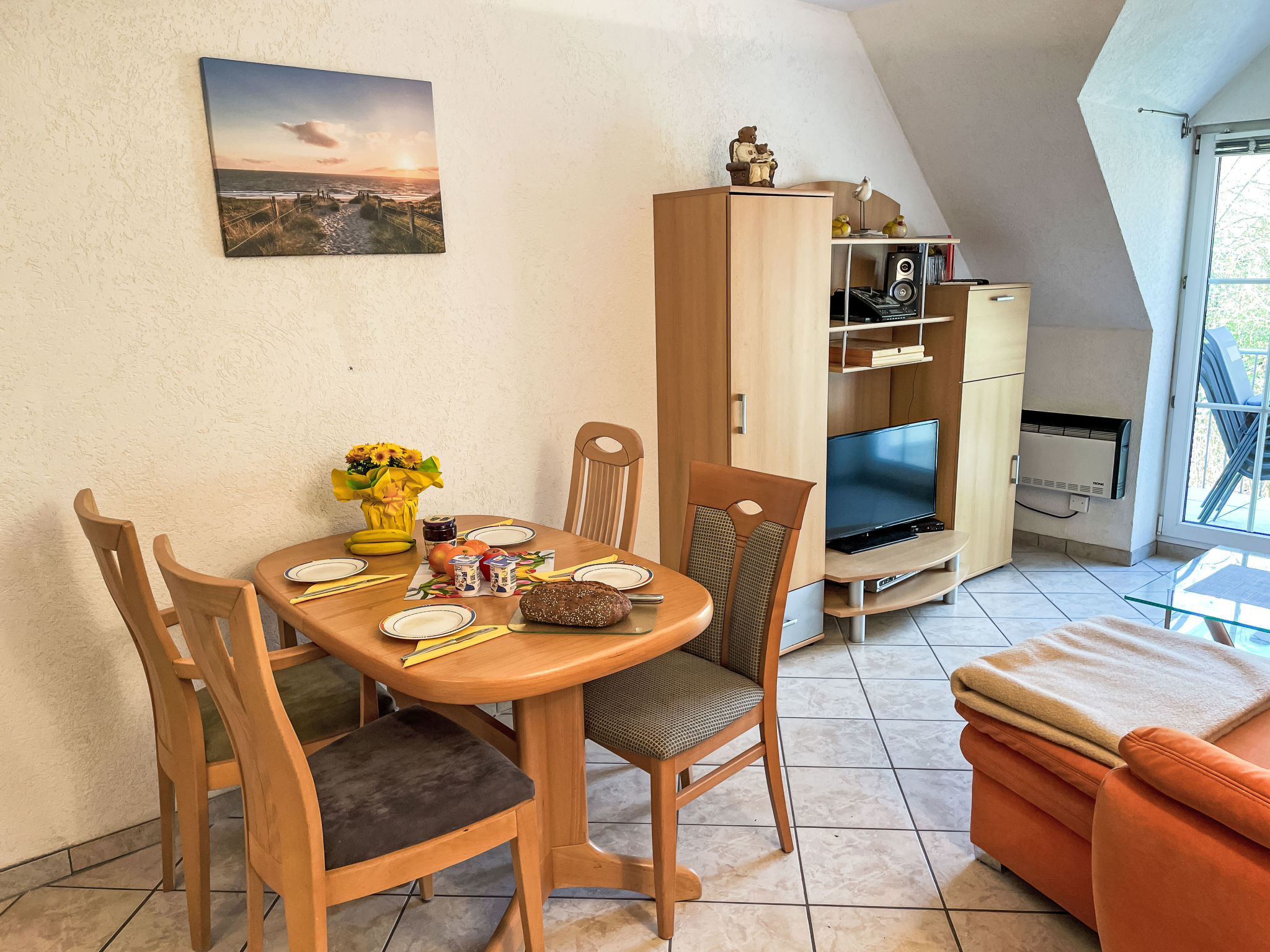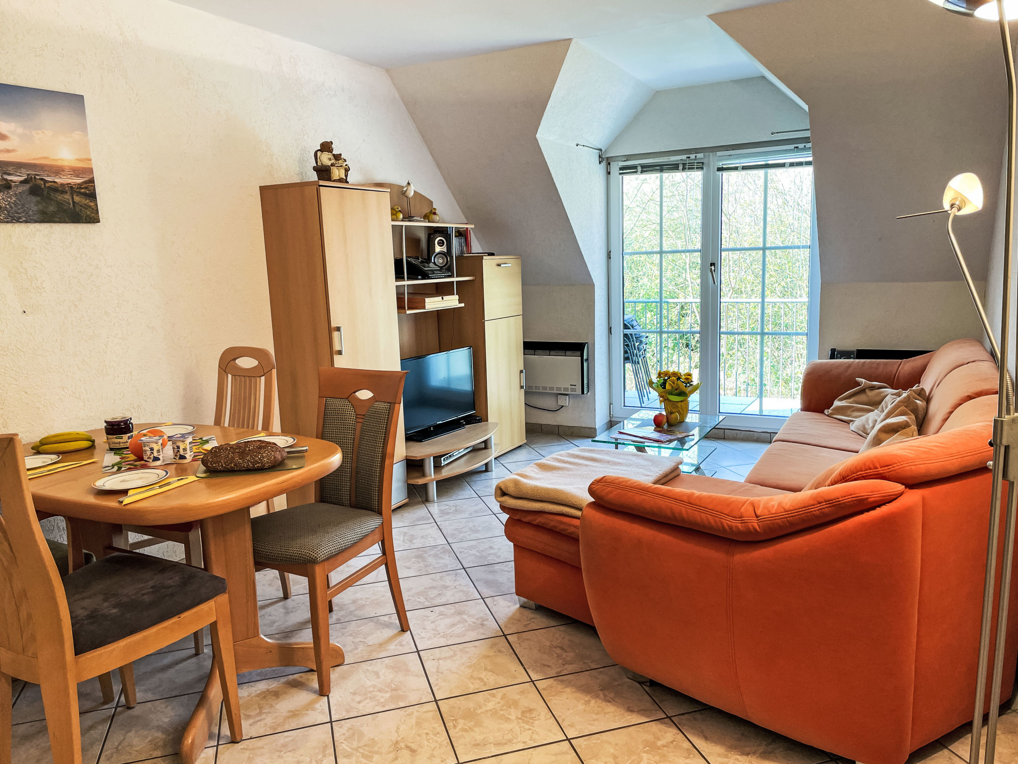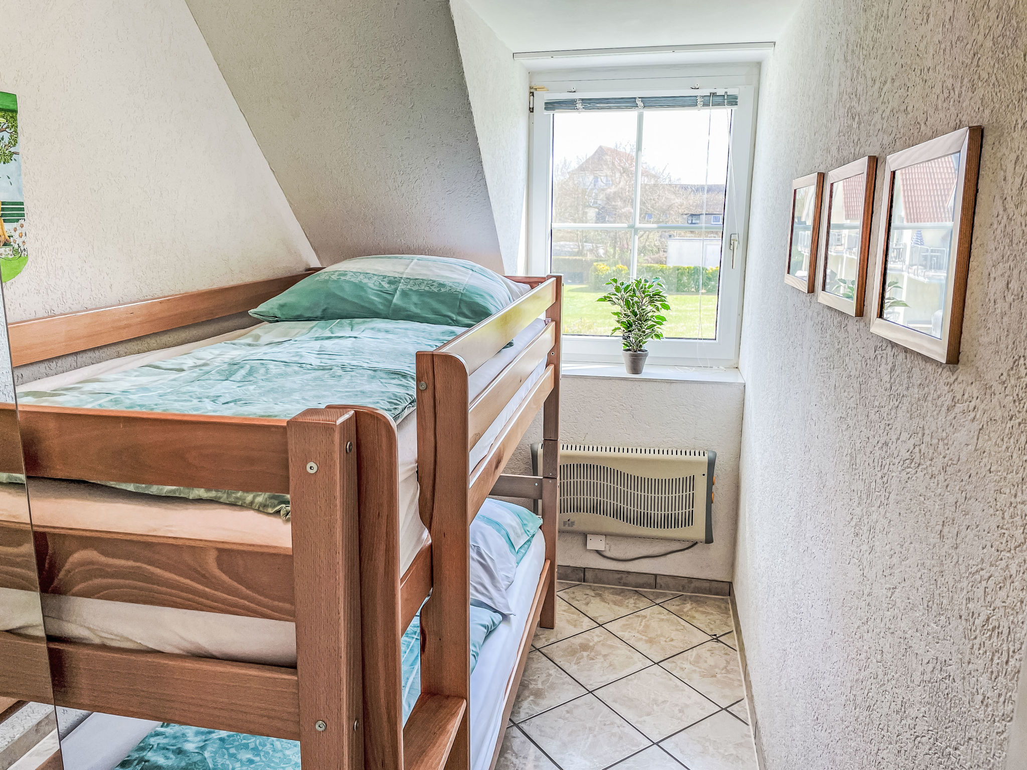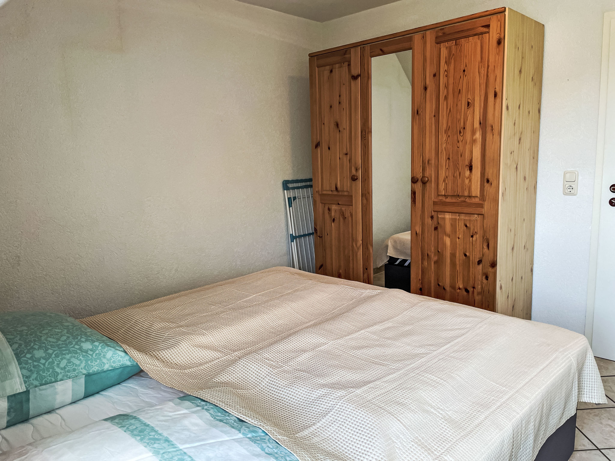 3-Zimmer-Wohnung 46 m2 im 1. Stock. Teilweise abgeschrägt: Wohn-/Esszimmer mit Sat-TV (Flachbildschirm), CD. Ausgang zum Balkon. 1 Zimmer mit 1 Doppelbett (180 cm, Länge 200 cm). 1 Kinderzimmer mit 1 Bett (80 cm, Länge 200 cm), 1 Schlafmöglichkeit (90 cm, Länge 200 cm). Kochnische (Backofen, Geschirrspüler, 4 Glaskeramikherd Platten, elektrische Kaffeemaschine). Dusche/WC. E-Heizung. Kleiner Balkon 5 m2, Südlage. Balkonmöbel. Bitte beachten: Nichtraucher-Unterkunft. Maximal 1 Haustier/Hund erlaubt. Rauchmelder. Die Schlafmöglichkeit im Kinderzimmer ist ein Ausziehbett (Tandembett).