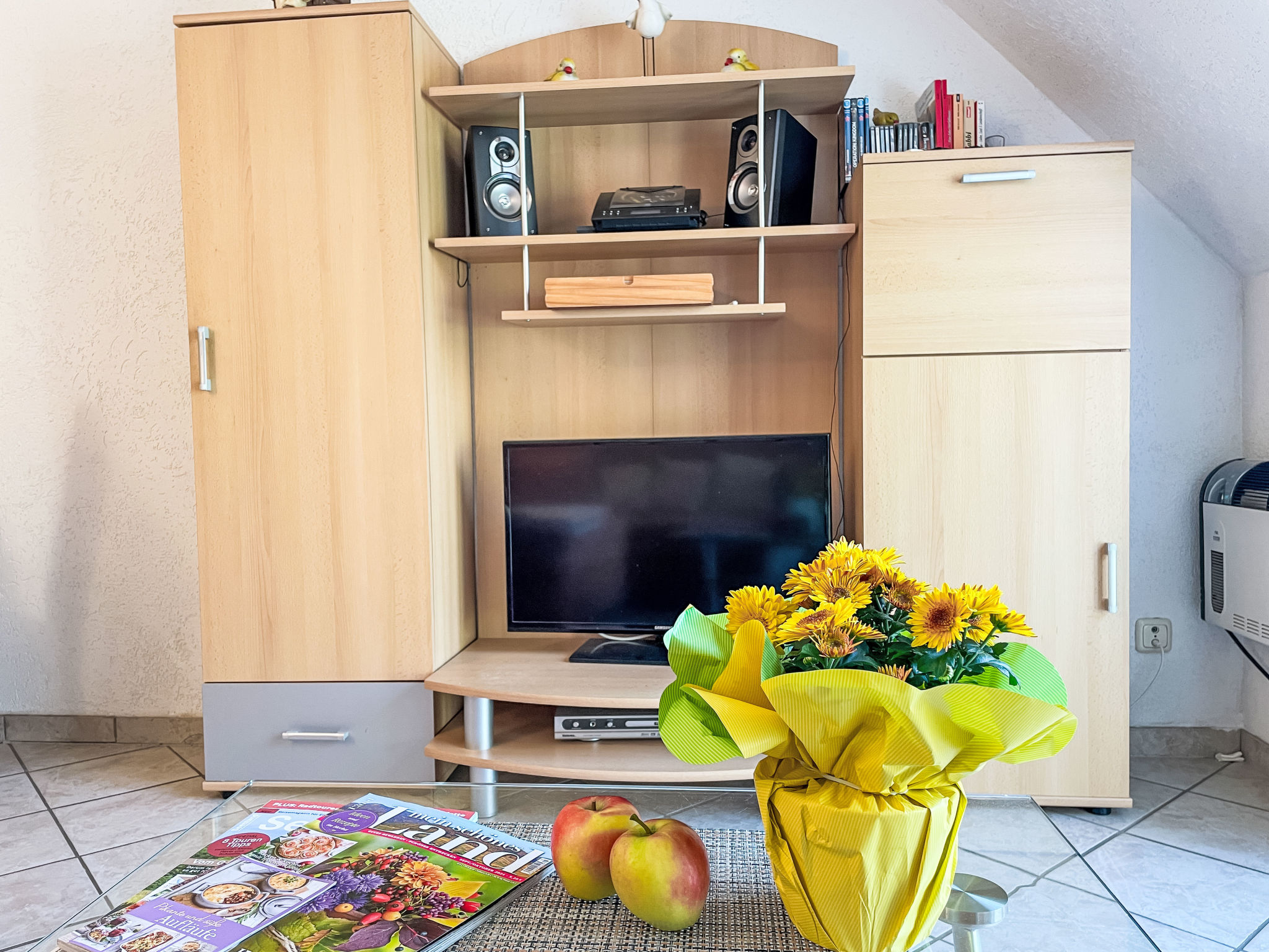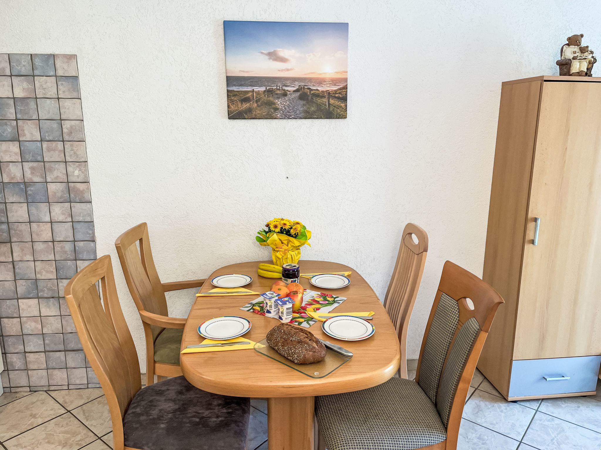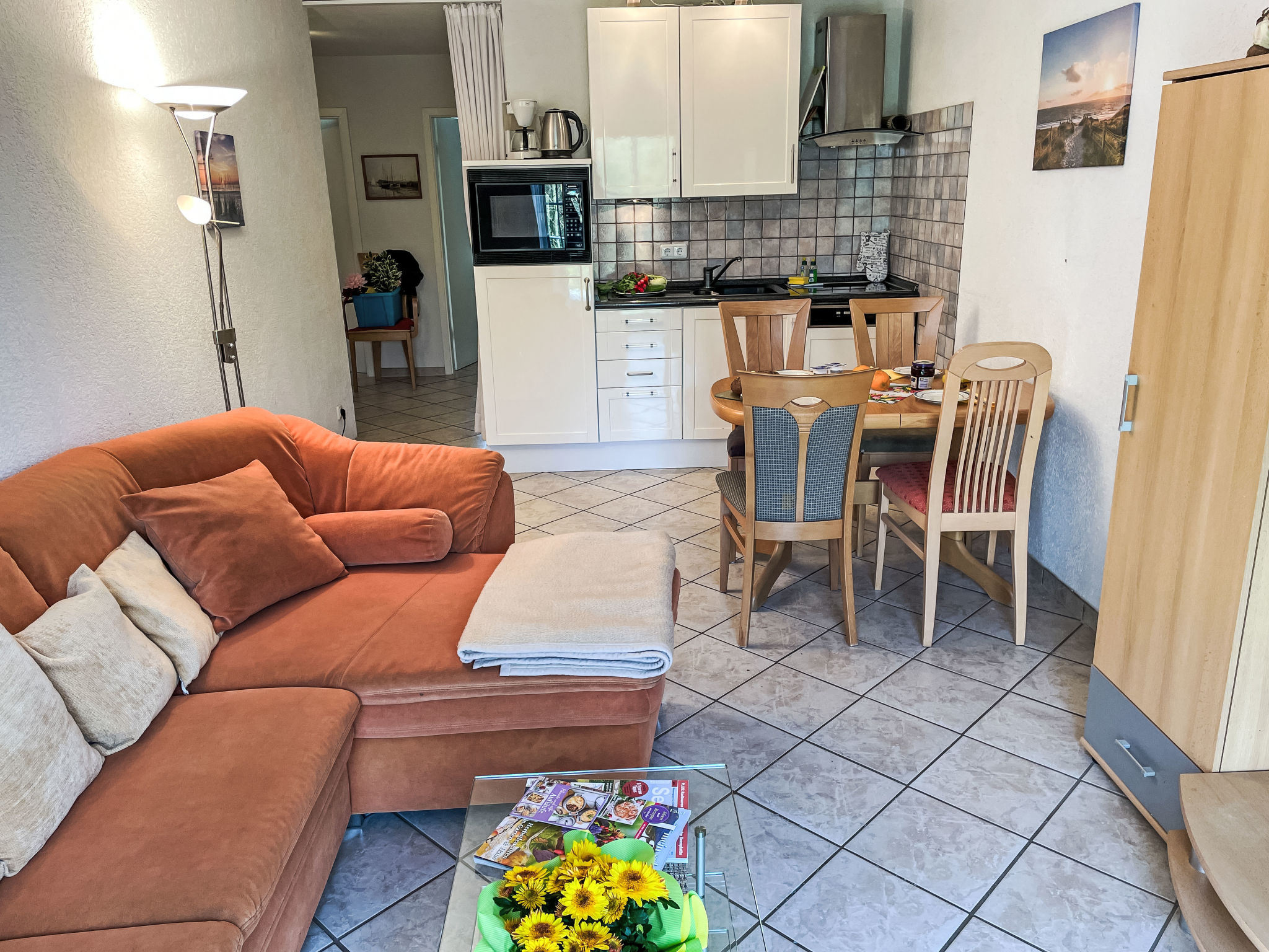 3-Zimmer-Wohnung 46 m2 im 1. Stock. Teilweise abgeschrägt: Wohn-/Esszimmer mit Sat-TV (Flachbildschirm), CD. Ausgang zum Balkon. 1 Zimmer mit 1 Doppelbett (180 cm, Länge 200 cm). 1 Kinderzimmer mit 1 Bett (80 cm, Länge 200 cm), 1 Schlafmöglichkeit (90 cm, Länge 200 cm). Kochnische (Backofen, Geschirrspüler, 4 Glaskeramikherd Platten, elektrische Kaffeemaschine). Dusche/WC. E-Heizung. Kleiner Balkon 5 m2, Südlage. Balkonmöbel. Bitte beachten: Nichtraucher-Unterkunft. Maximal 1 Haustier/Hund erlaubt. Rauchmelder. Die Schlafmöglichkeit im Kinderzimmer ist ein Ausziehbett (Tandembett).