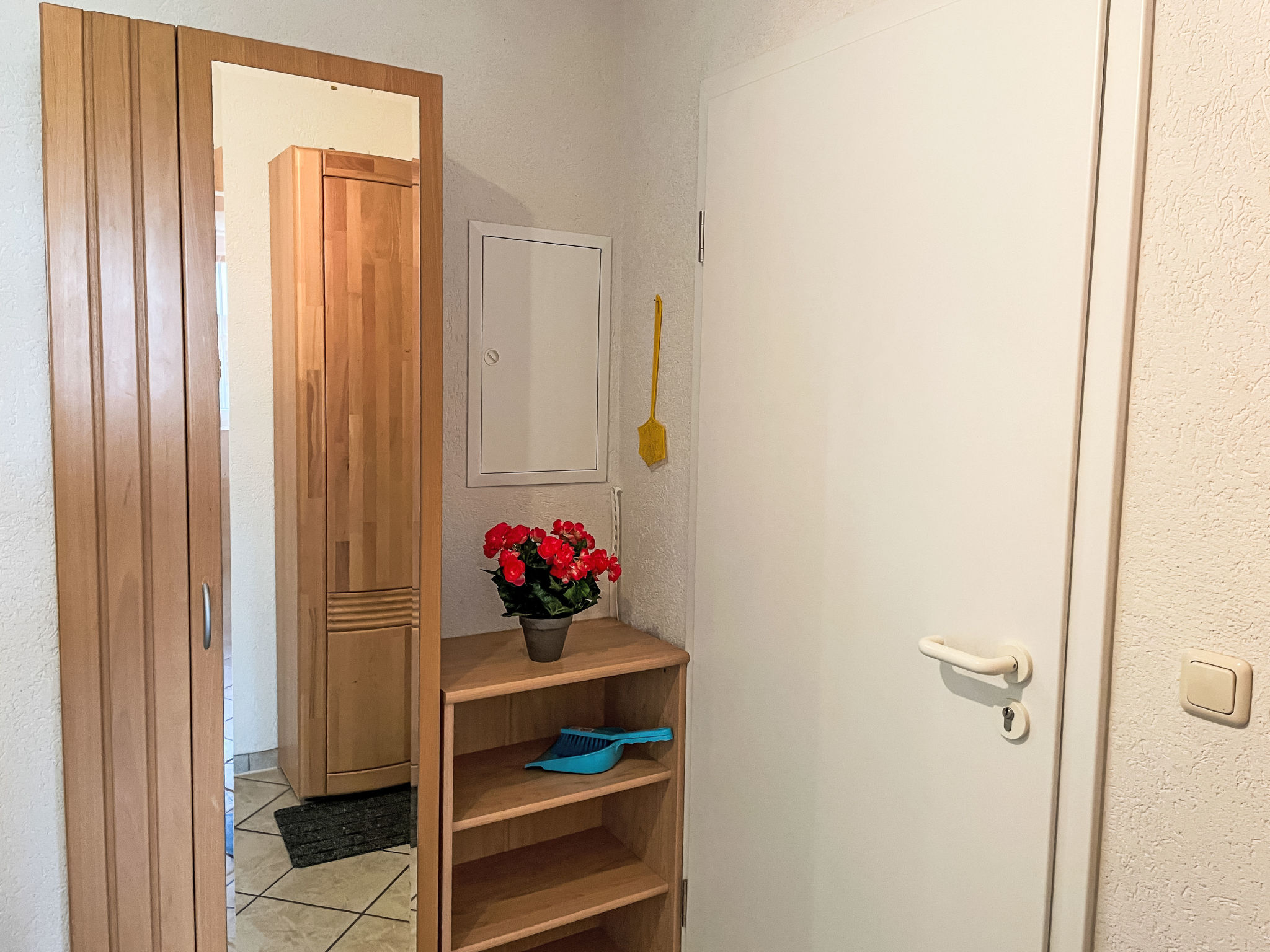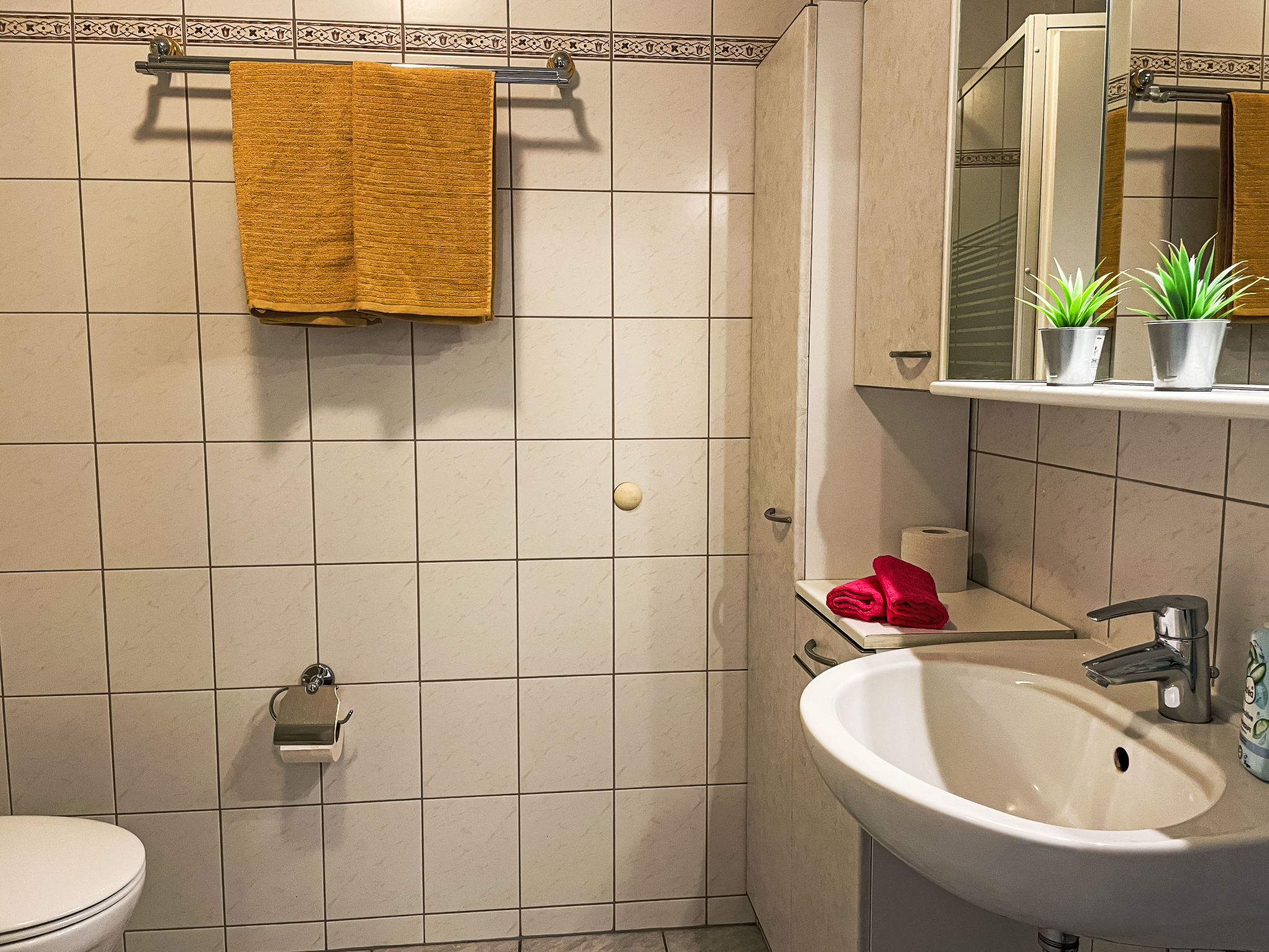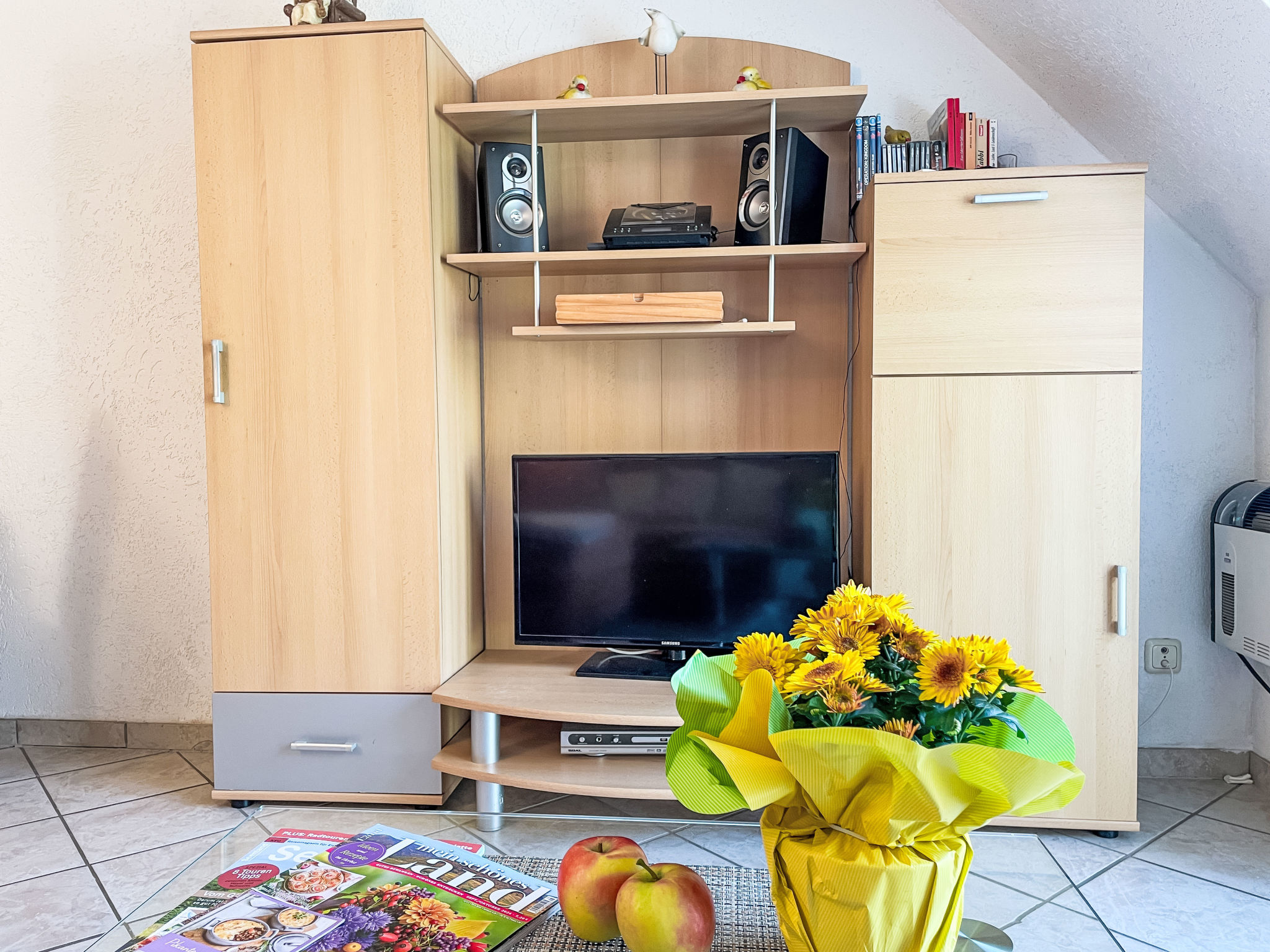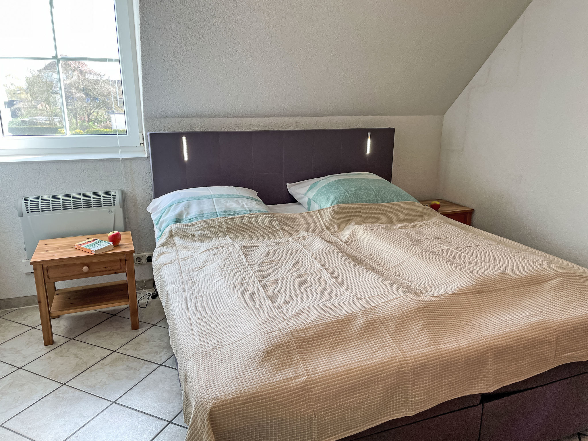 3-Zimmer-Wohnung 46 m2 im 1. Stock. Teilweise abgeschrägt: Wohn-/Esszimmer mit Sat-TV (Flachbildschirm), CD. Ausgang zum Balkon. 1 Zimmer mit 1 Doppelbett (180 cm, Länge 200 cm). 1 Kinderzimmer mit 1 Bett (80 cm, Länge 200 cm), 1 Schlafmöglichkeit (90 cm, Länge 200 cm). Kochnische (Backofen, Geschirrspüler, 4 Glaskeramikherd Platten, elektrische Kaffeemaschine). Dusche/WC. E-Heizung. Kleiner Balkon 5 m2, Südlage. Balkonmöbel. Bitte beachten: Nichtraucher-Unterkunft. Maximal 1 Haustier/Hund erlaubt. Rauchmelder. Die Schlafmöglichkeit im Kinderzimmer ist ein Ausziehbett (Tandembett).