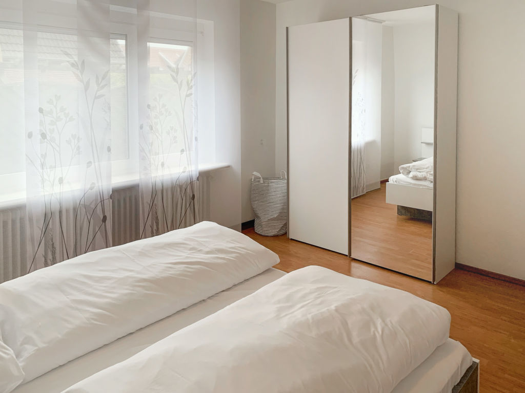3-Zimmer-Wohnung 70 m2, im Erdgeschoss. Geschmackvoll und gemütlich eingerichtet: Wohn-/Esszimmer 20 m2 mit Sat-TV (Flachbildschirm). Ausgang zur Terrasse. 1 Zimmer 15 m2 mit 1 Doppelbett (2 x 90 cm, Länge 200 cm). 1 Zimmer 11 m2 mit 2 Betten (90 cm, Länge 200 cm). Küche (Backofen, Geschirrspüler, 3 Glaskeramikherd Platten, Toaster, Wasserkocher, Mikrowelle, elektrische Kaffeemaschine). Dusche/WC. Terrasse überdacht. Terrassenmöbel. Zur Verfügung: Kinderhochstuhl (extra), Haartrockner. Internet (Wireless LAN, gratis). Bitte beachten: Nichtraucher-Unterkunft.
