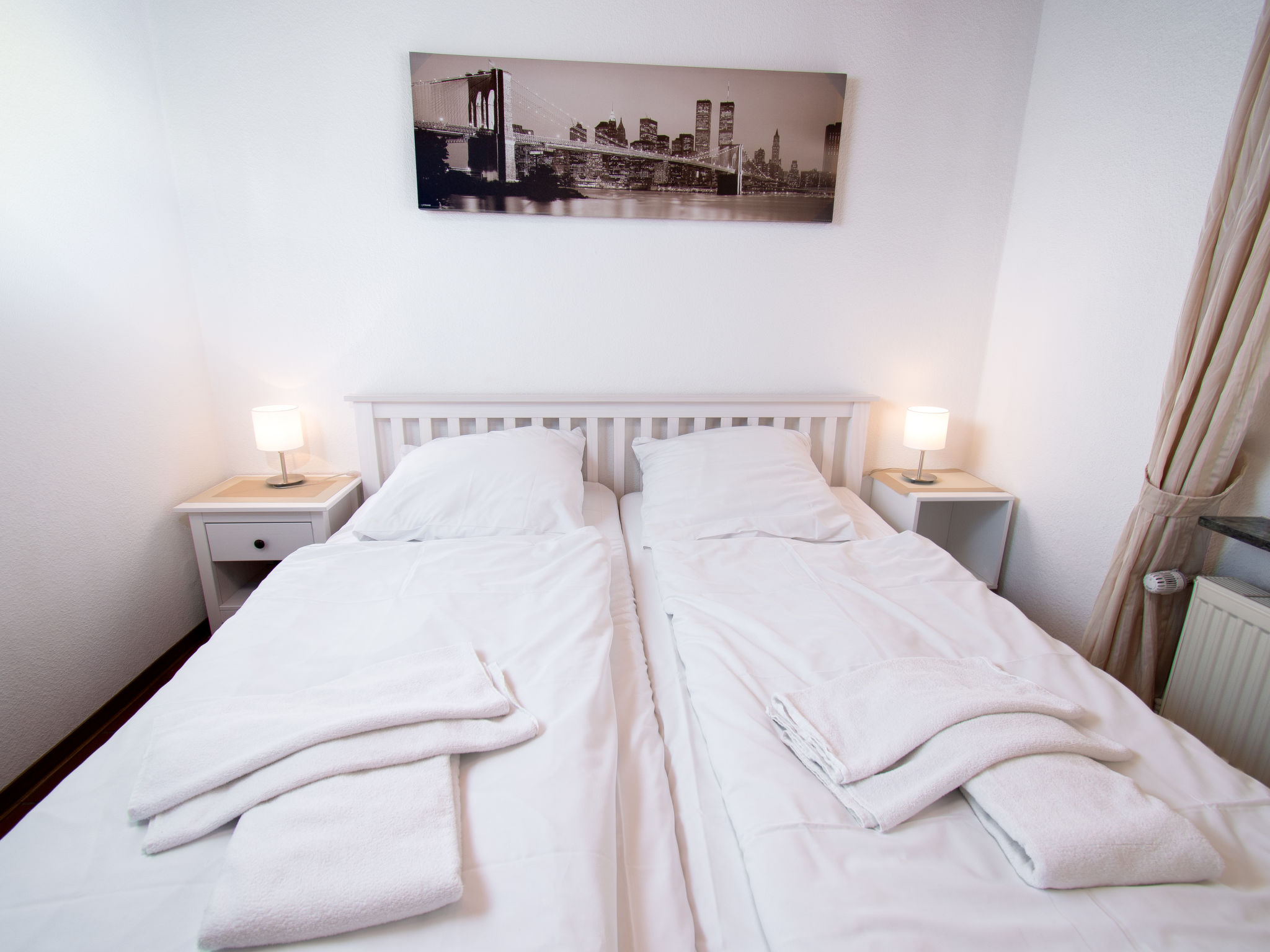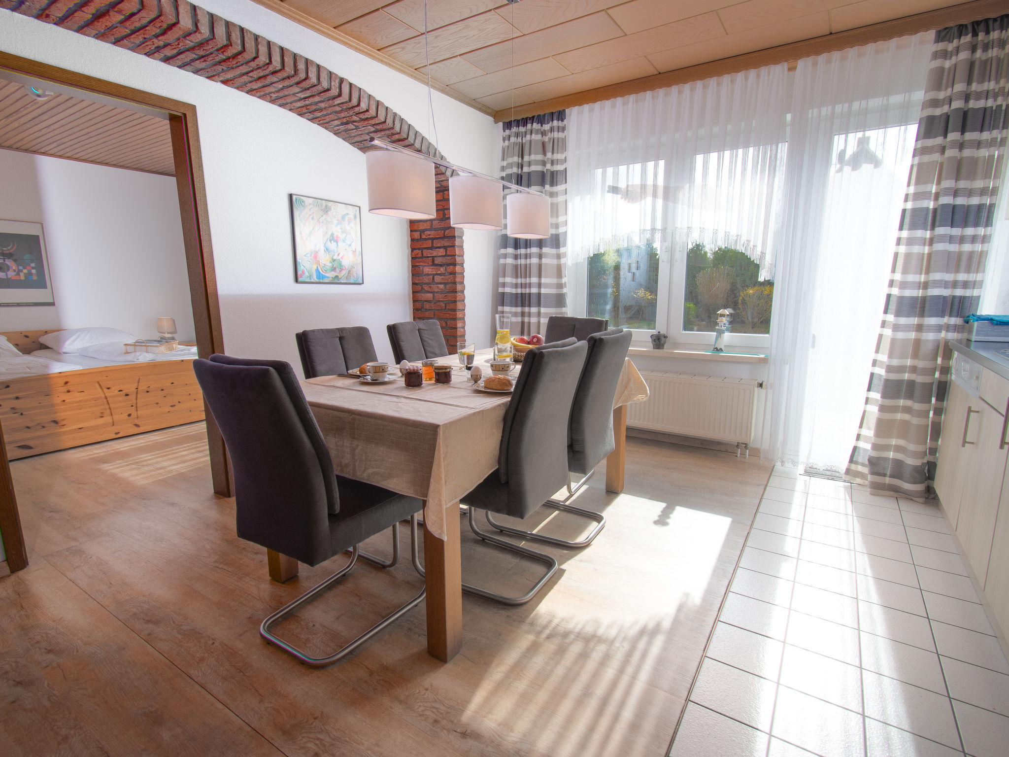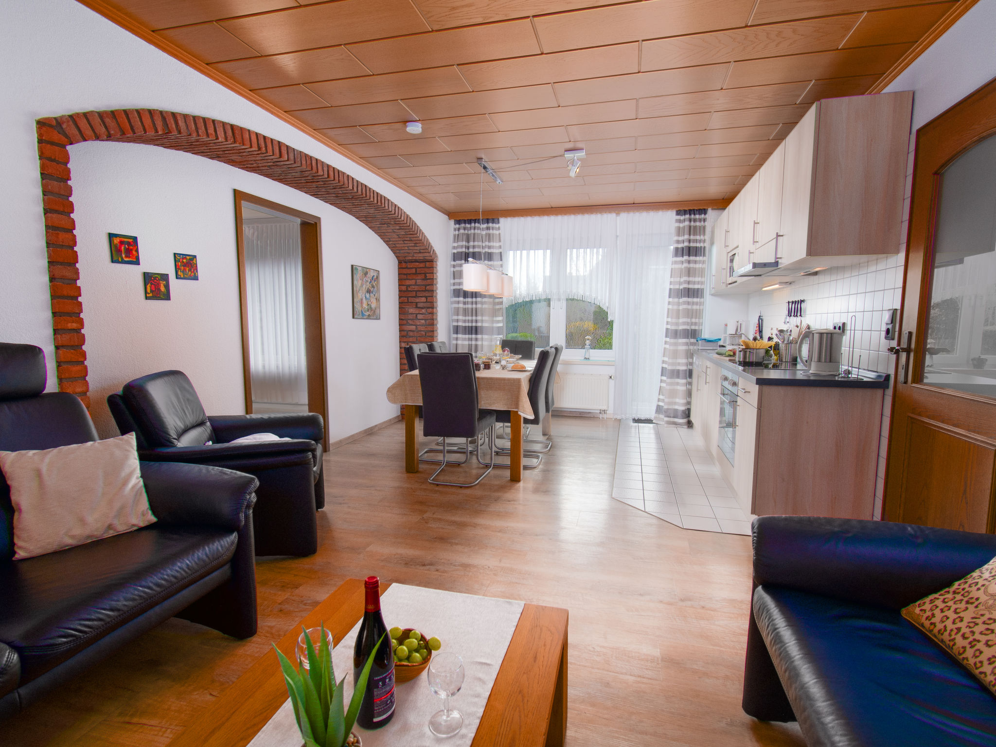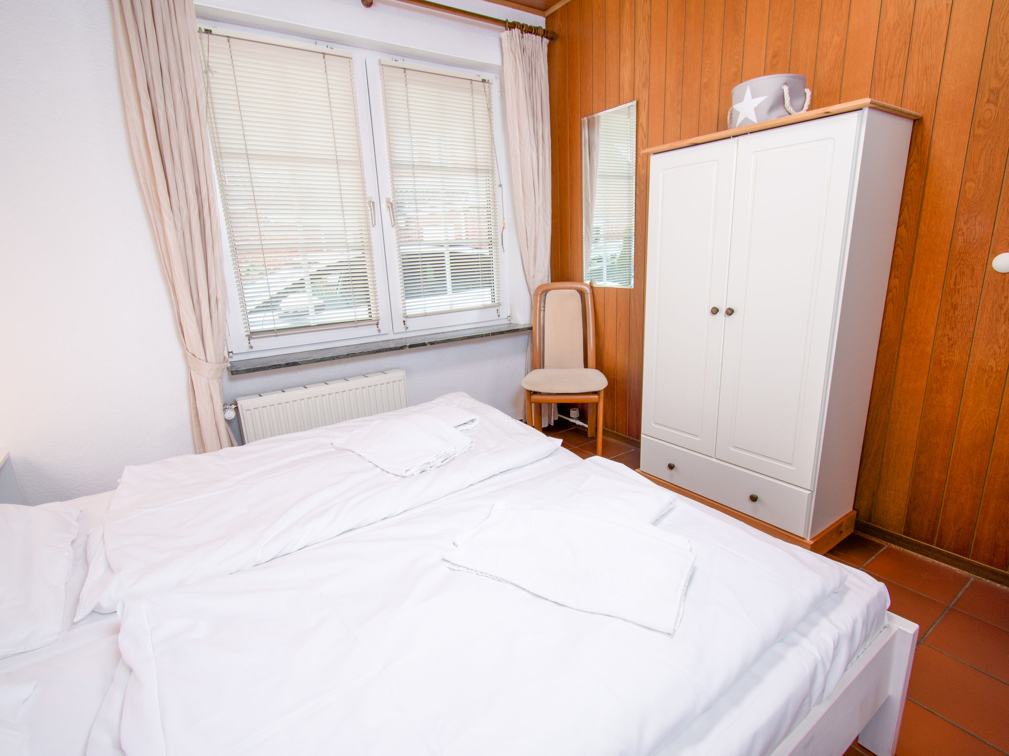 "Nordwind", 3-Zimmer-Wohnung 64 m2, im Erdgeschoss. Gemütlich eingerichtet: Wohn-/Esszimmer 24 m2 mit Kabel-TV (Flachbildschirm), Stereoanlage. Ausgang zur Terrasse. 1 Zimmer 16 m2 mit 1 Doppelbett (2 x 90 cm, Länge 200 cm). 1 Zimmer 8 m2 mit 1 Doppelbett (2 x 90 cm, Länge 200 cm). Offene Küche (4 Kochplatten, Backofen, Geschirrspüler, Toaster, Wasserkocher, Mikrowelle, elektrische Kaffeemaschine) mit Esstisch. Dusche, sep. WC. Terrasse 20 m2, Garten 40 m2. Terrassenmöbel. Zur Verfügung: Kinderhochstuhl (extra). Internet (Wireless LAN, gratis). Bitte beachten: Kühlschrank ohne Gefrierfach, Nichtraucher-Unterkunft.