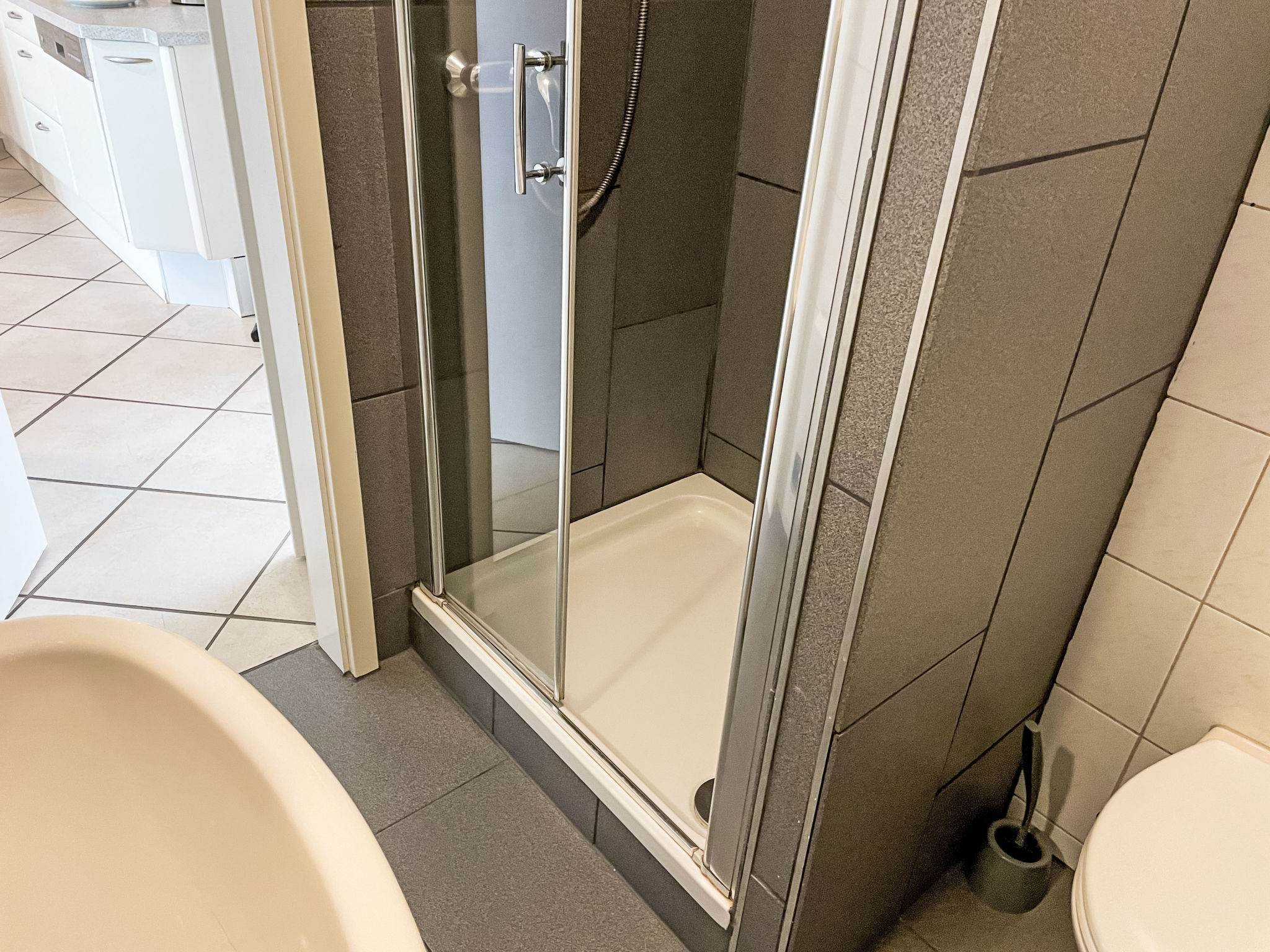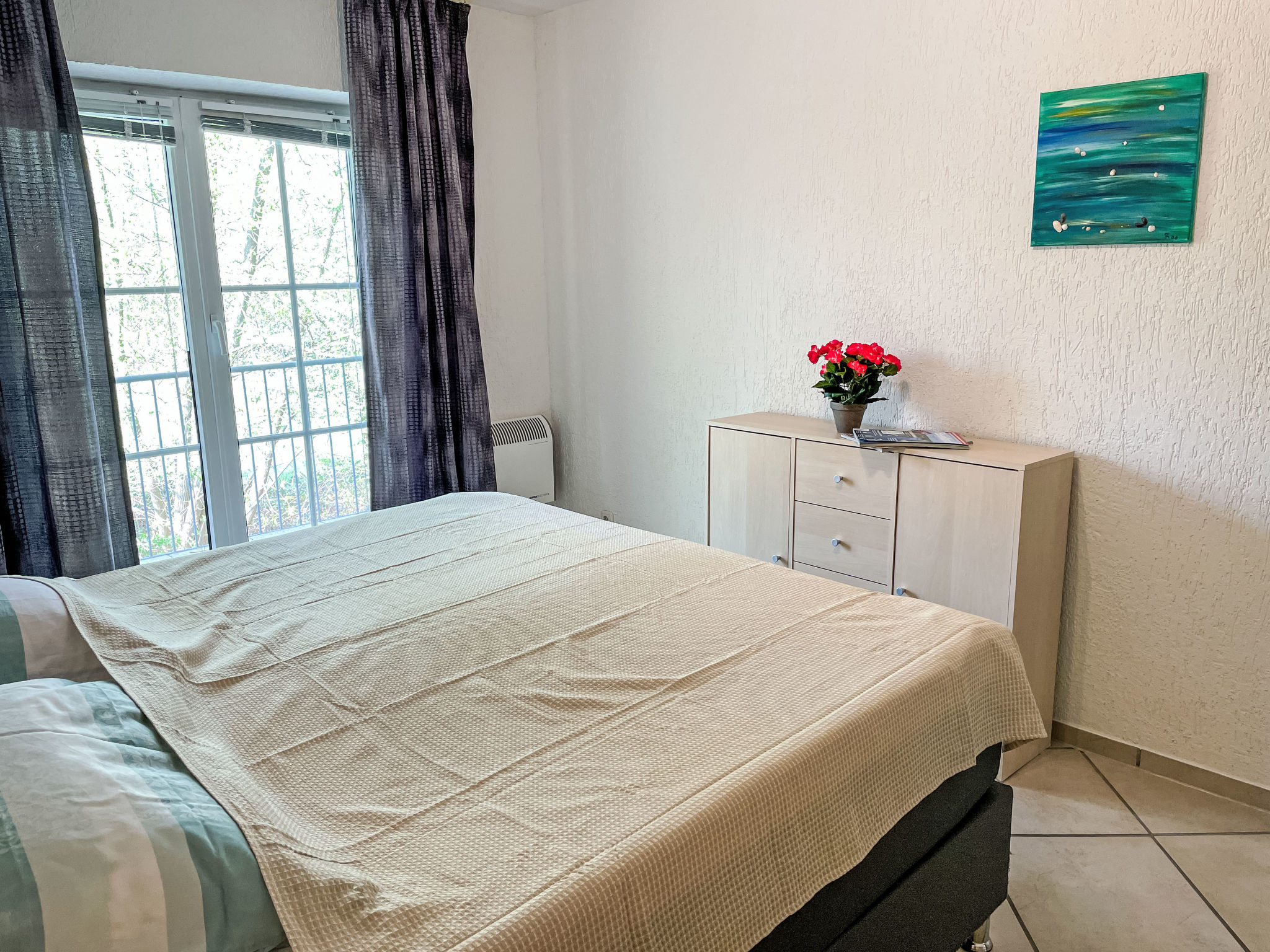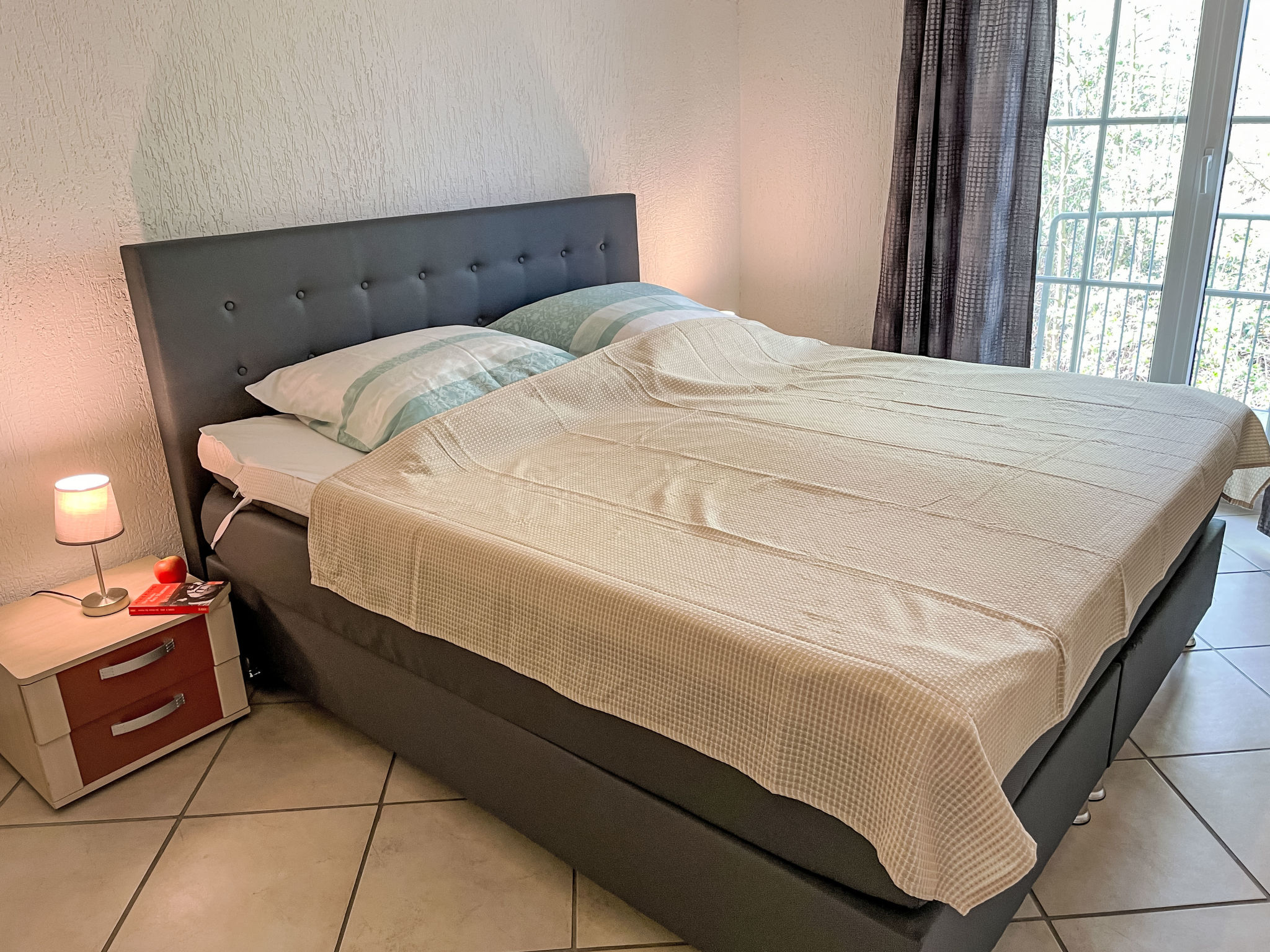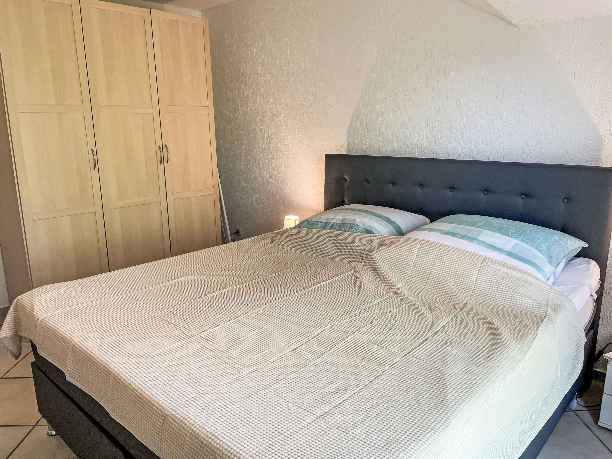 2-Zimmer-Wohnung 46 m2 im 1. Stock. Objekt geeignet für 2 Erwachsene + 2 Kinder. Wohn-/Schlafzimmer mit 1 Doppeldiwanbett (140 cm, Länge 200 cm), Sat-TV (Flachbildschirm), CD. Ausgang zum Balkon. 1 Zimmer mit 1 Doppelbett (180 cm, Länge 200 cm). Ausgang zum Balkon. Kochnische (Backofen, Geschirrspüler, 4 Glaskeramikherd Platten, elektrische Kaffeemaschine). Dusche/WC. E-Heizung. Balkon 8 m2. Balkonmöbel. Bitte beachten: Nichtraucher-Unterkunft. Rauchmelder.