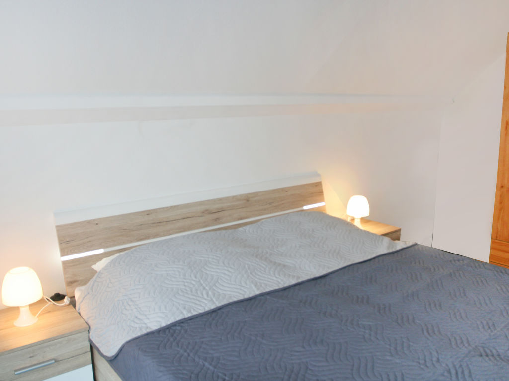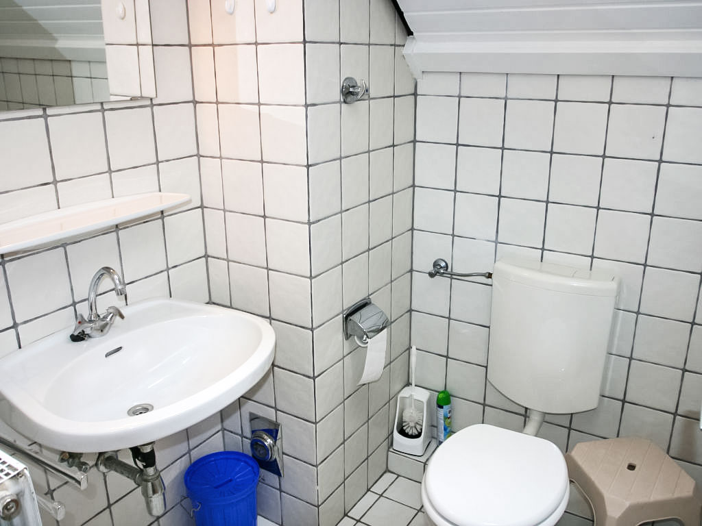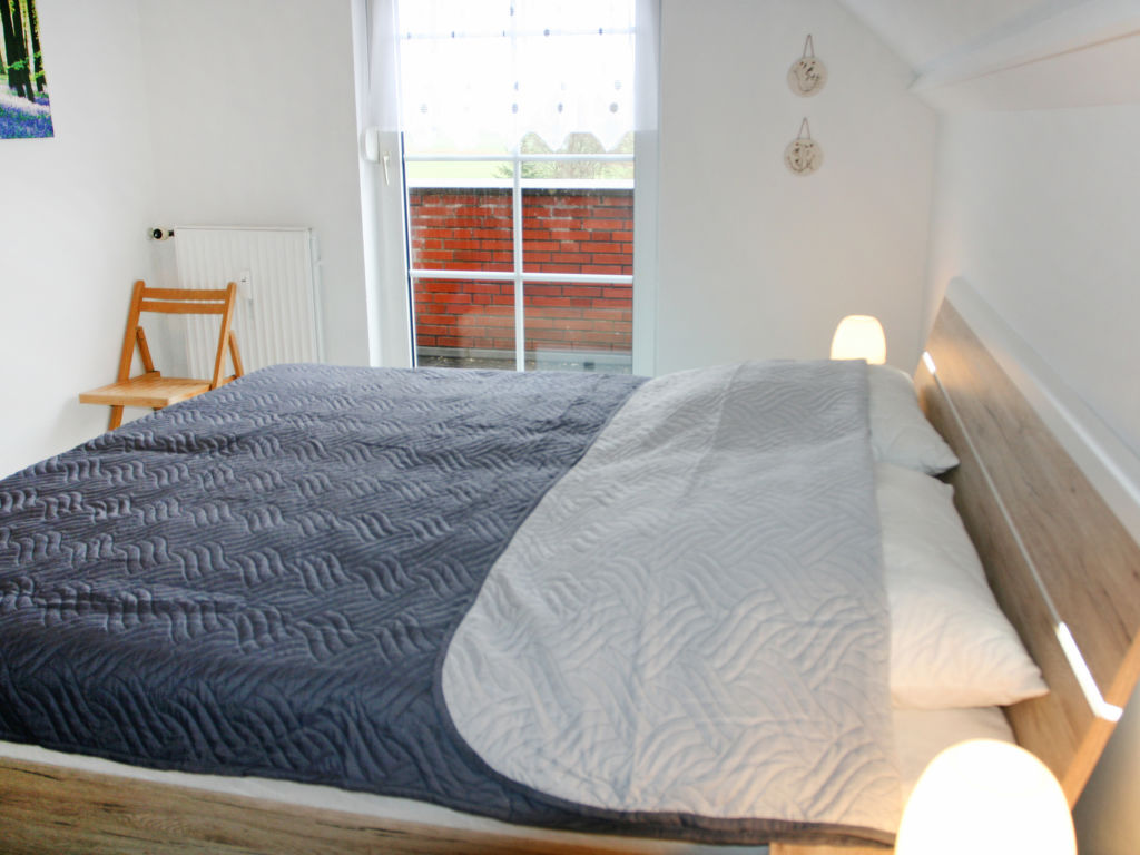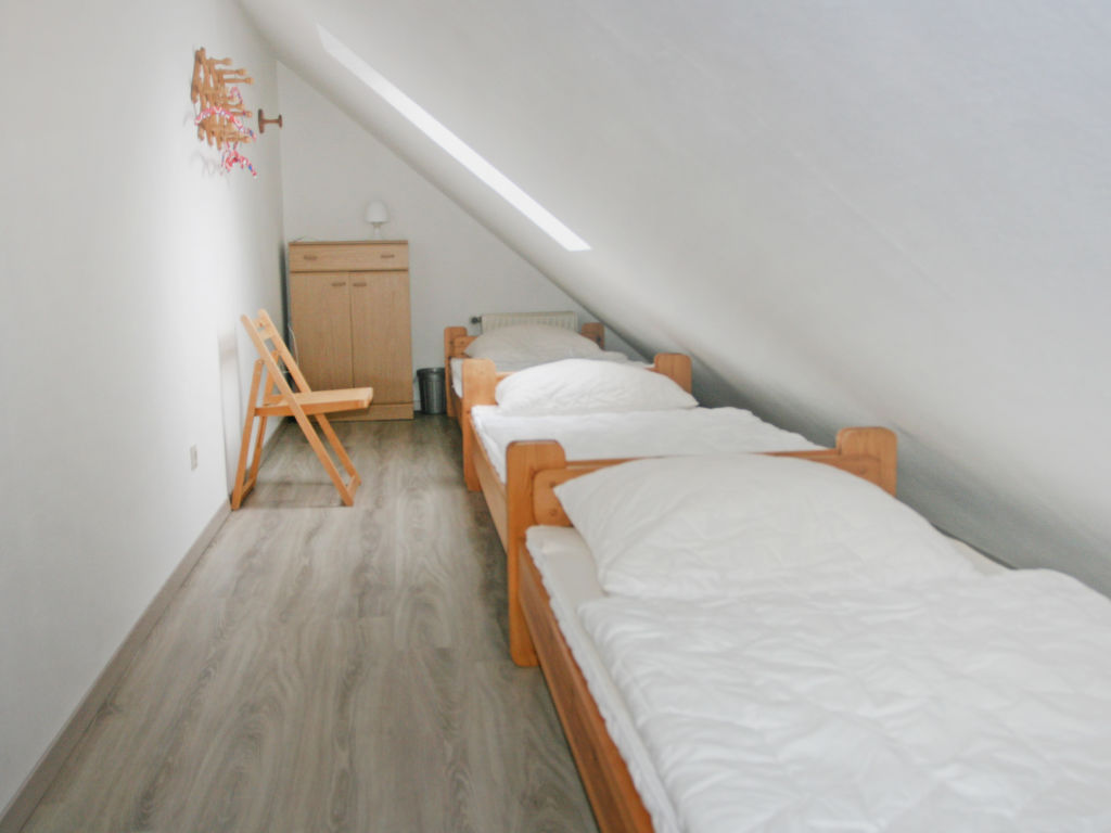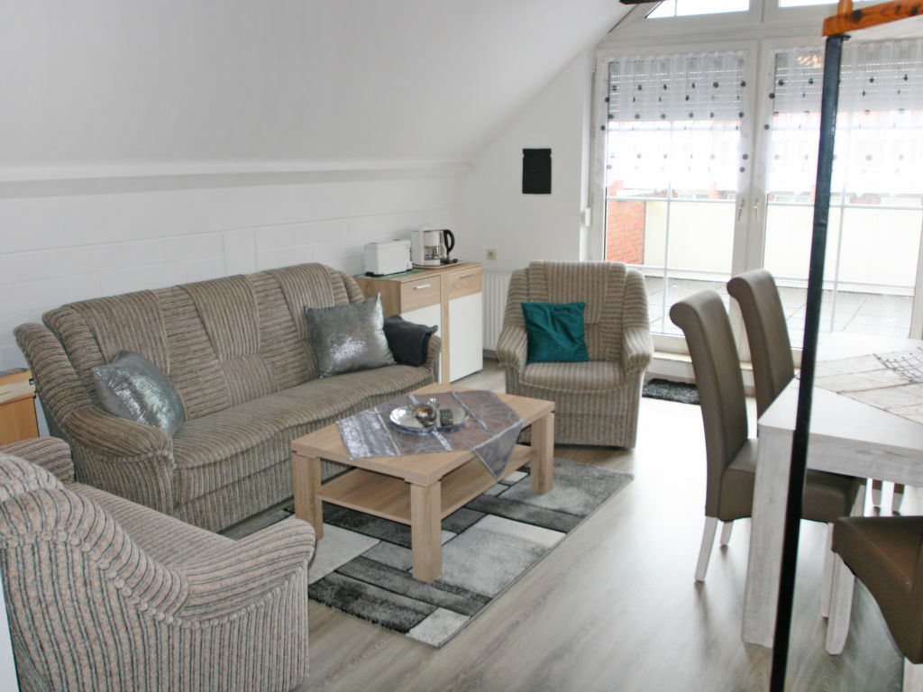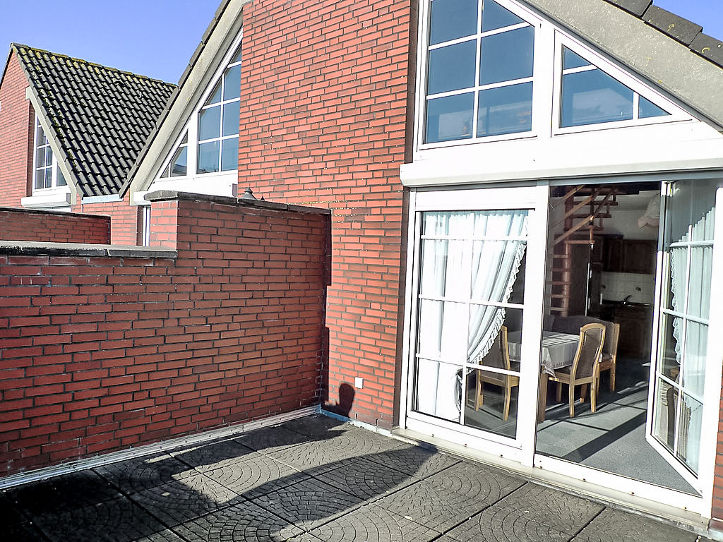 3-Zimmer-Wohnung 45 m2 auf 2 Stockwerken im 2. Stock. Wohn-/Esszimmer 21 m2 mit Essecke und Sat-TV (Flachbildschirm), Radio und CD. Ausgang zum Balkon. 1 Zimmer 12 m2 mit 1 Doppelbett (2 x 90 cm, Länge 200 cm). Ausgang zum Balkon. Kochnische (4 Kochplatten, Backofen, elektrische Kaffeemaschine). Bad/WC. Dachgeschoss: (steile Treppe) 1 abgeschrägtes, offenes Zimmer 7 m2 mit 3 Betten (90 cm, Länge 200 cm). Grosser Balkon 15 m2. Balkonmöbel. Schöne Sicht auf auf die Inseln Baltrum und Langeoog. Zur Verfügung: Internet (Wireless LAN, gratis). Bitte beachten: Nichtraucher-Unterkunft. Im sehr stark abgeschrägten Zimmer im Dachgeschoss befinden sich insgesamt 3 hintereinander stehende Betten, die wahlweise genutzt werden können. Maximalbelegung: 4 Personen.