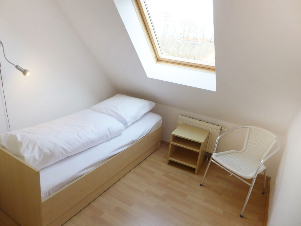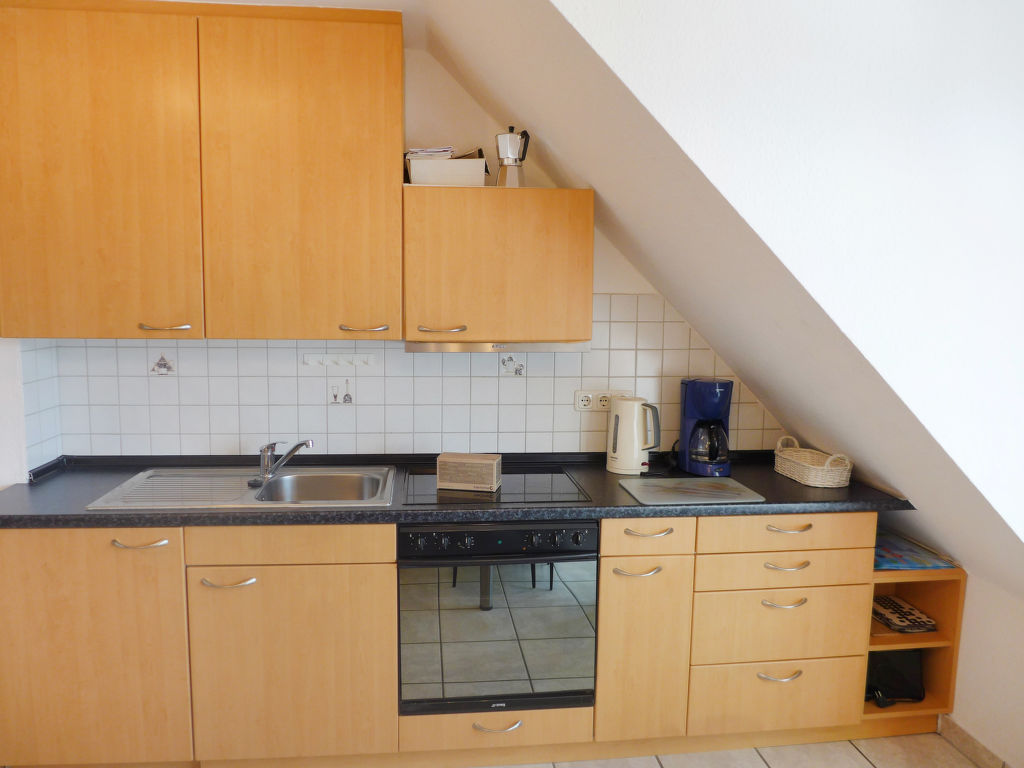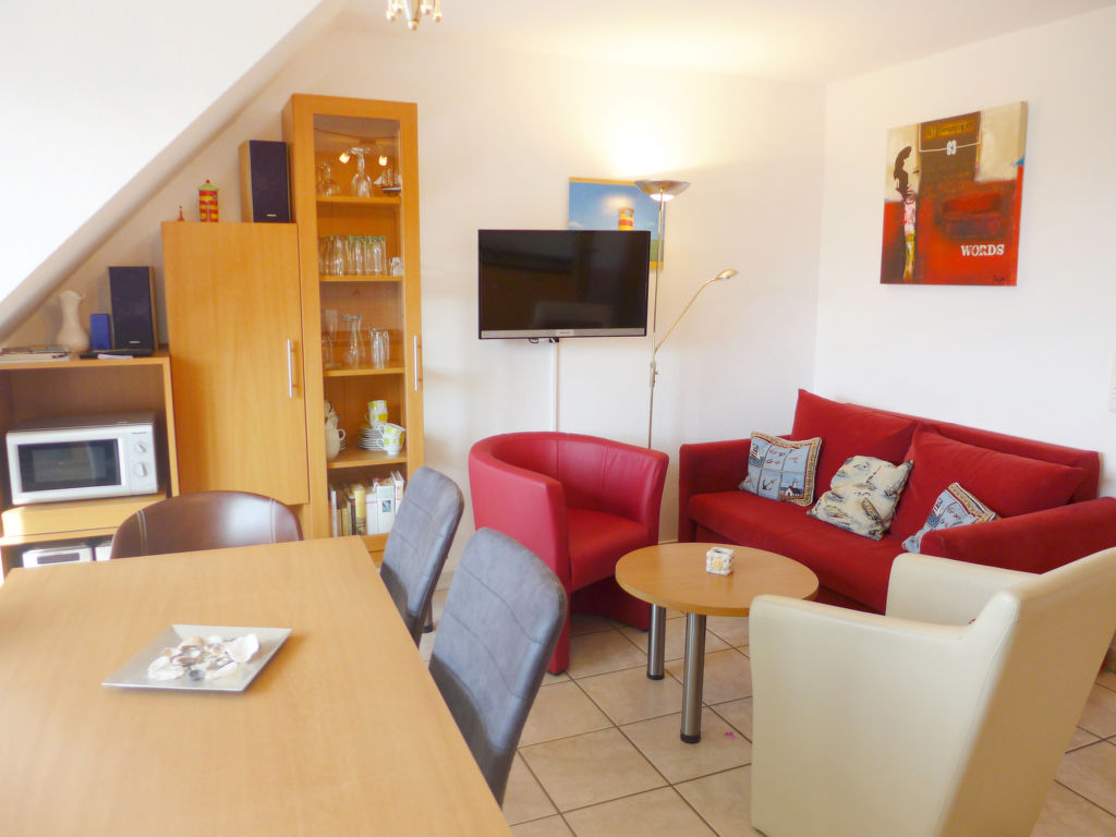 4-Zimmer-Wohnung 62 m2 auf 2 Stockwerken im 2. Stock. Abgeschrägtes Wohn-/Esszimmer 15 m2 mit Kabel-TV (Flachbildschirm), Stereoanlage. Ausgang zum Balkon. 1 abgeschrägtes Zimmer 11 m2 mit 1 Doppelbett (2 x 80 cm, Länge 200 cm). 1 abgeschrägtes Zimmer 7 m2 mit 1 Bett (90 cm, Länge 200 cm). Kochnische (Backofen, 4 Glaskeramikherd Platten, Toaster, Wasserkocher, Mikrowelle, elektrische Kaffeemaschine). Dusche/WC. Dachgeschoss: (Wendeltreppe) 1 abgeschrägtes Zimmer 9 m2 mit 3 Betten (100 cm, Länge 200 cm). Sep. WC. Balkon. Balkonmöbel. Zur Verfügung: Kinderhochstuhl (extra). Bitte beachten: Kühlschrank ohne Gefrierfach, Nichtraucher-Unterkunft. Die Wohnung ist für Allergiker geeignet. Das Grillen auf dem Balkon ist nicht gestattet.