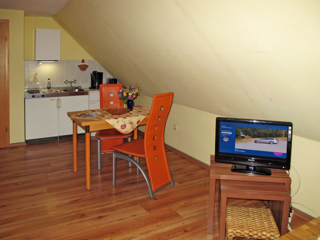 "Prerow 118", 1-Zimmer-Wohnung 20 m2, im Dachgeschoss. Gemütlich eingerichtet: abgeschrägtes Wohn-/Schlafzimmer mit 1 Doppelbett, Esstisch, Sat-TV und Radio. Kochnische (2 Kochplatten, Toaster, Wasserkocher, elektrische Kaffeemaschine). Dusche/WC. G-Heizung. Gartensitzplatz. Bitte beachten: Nichtraucher-Unterkunft. Rauchmelder.