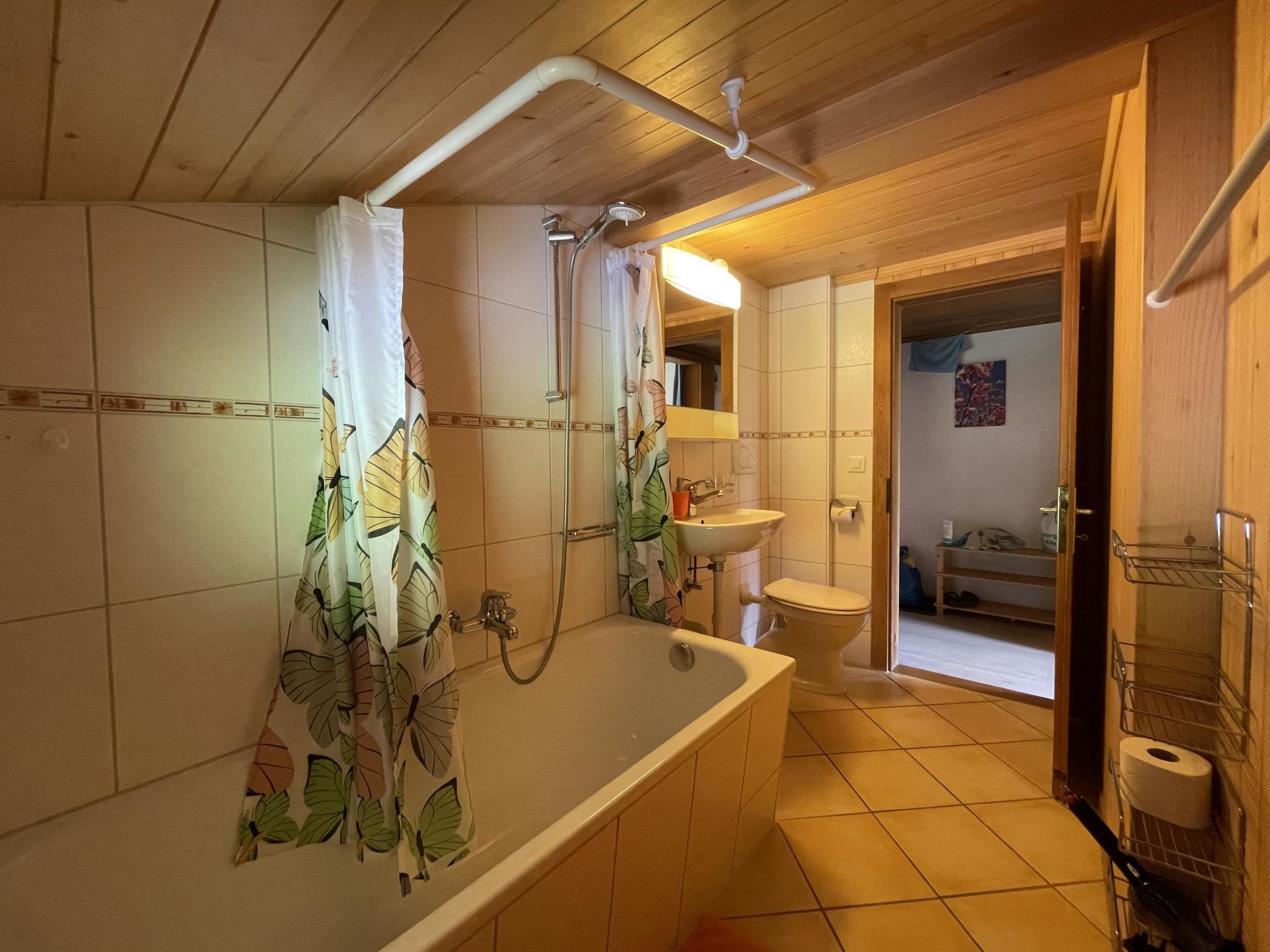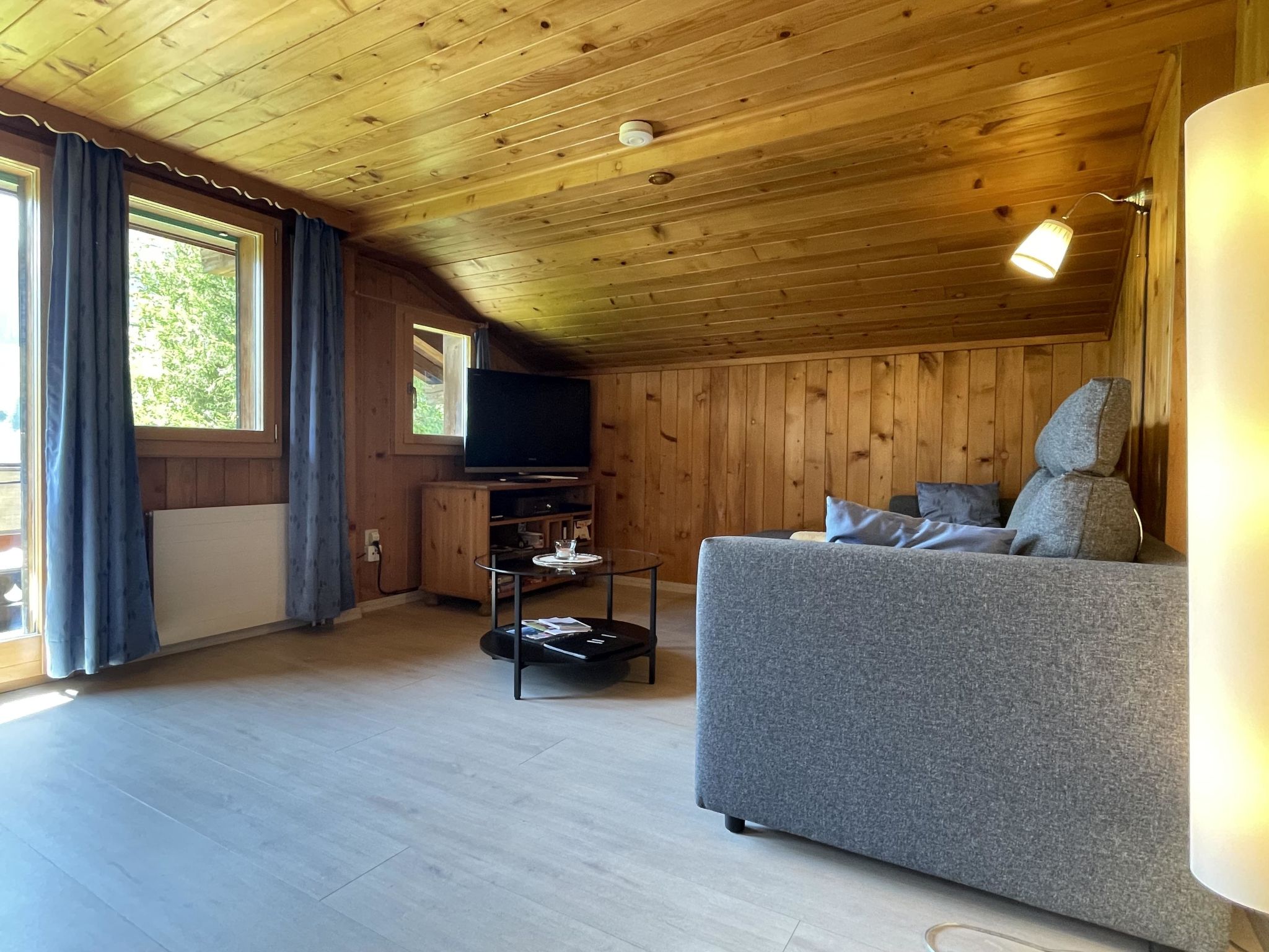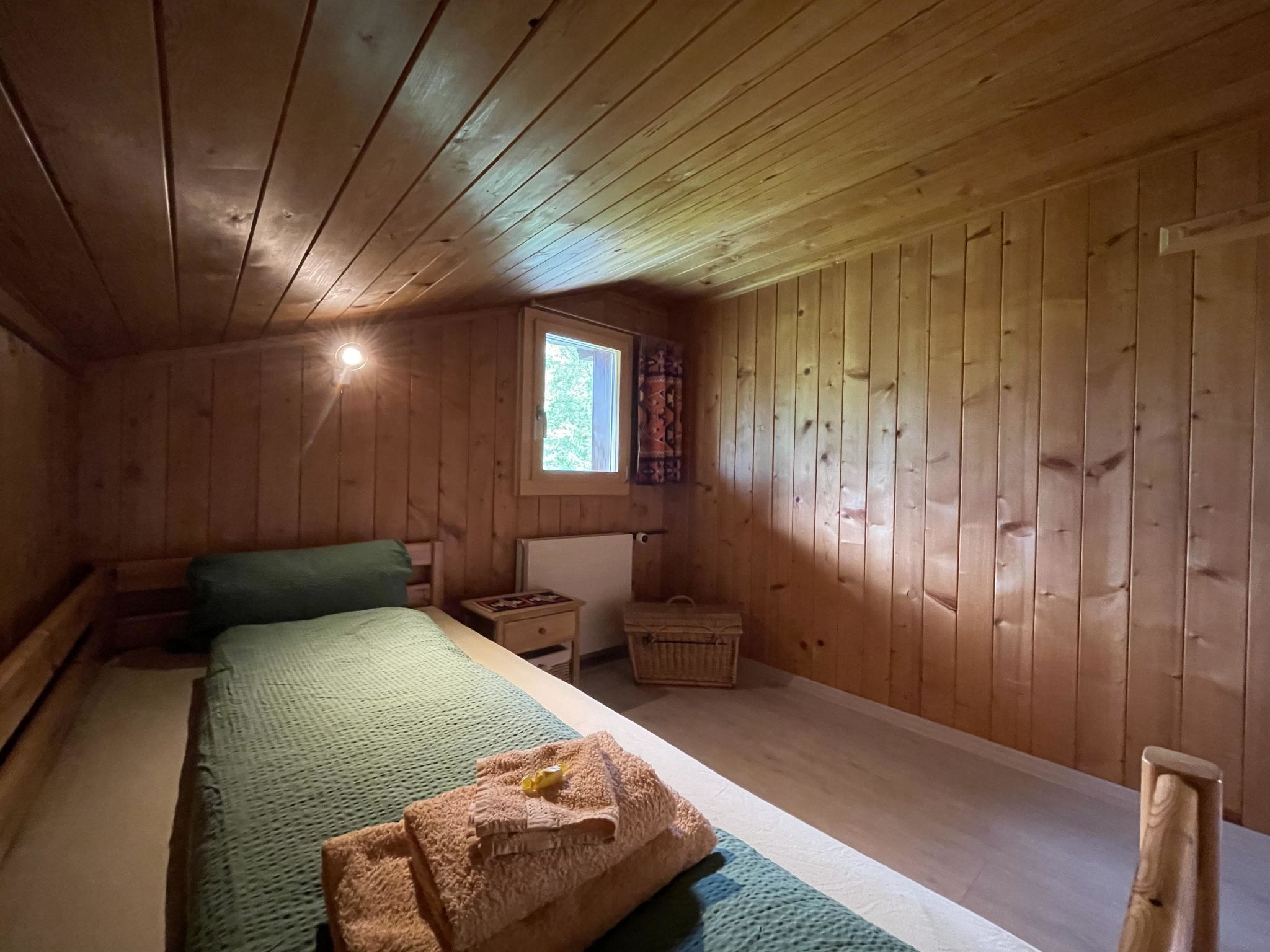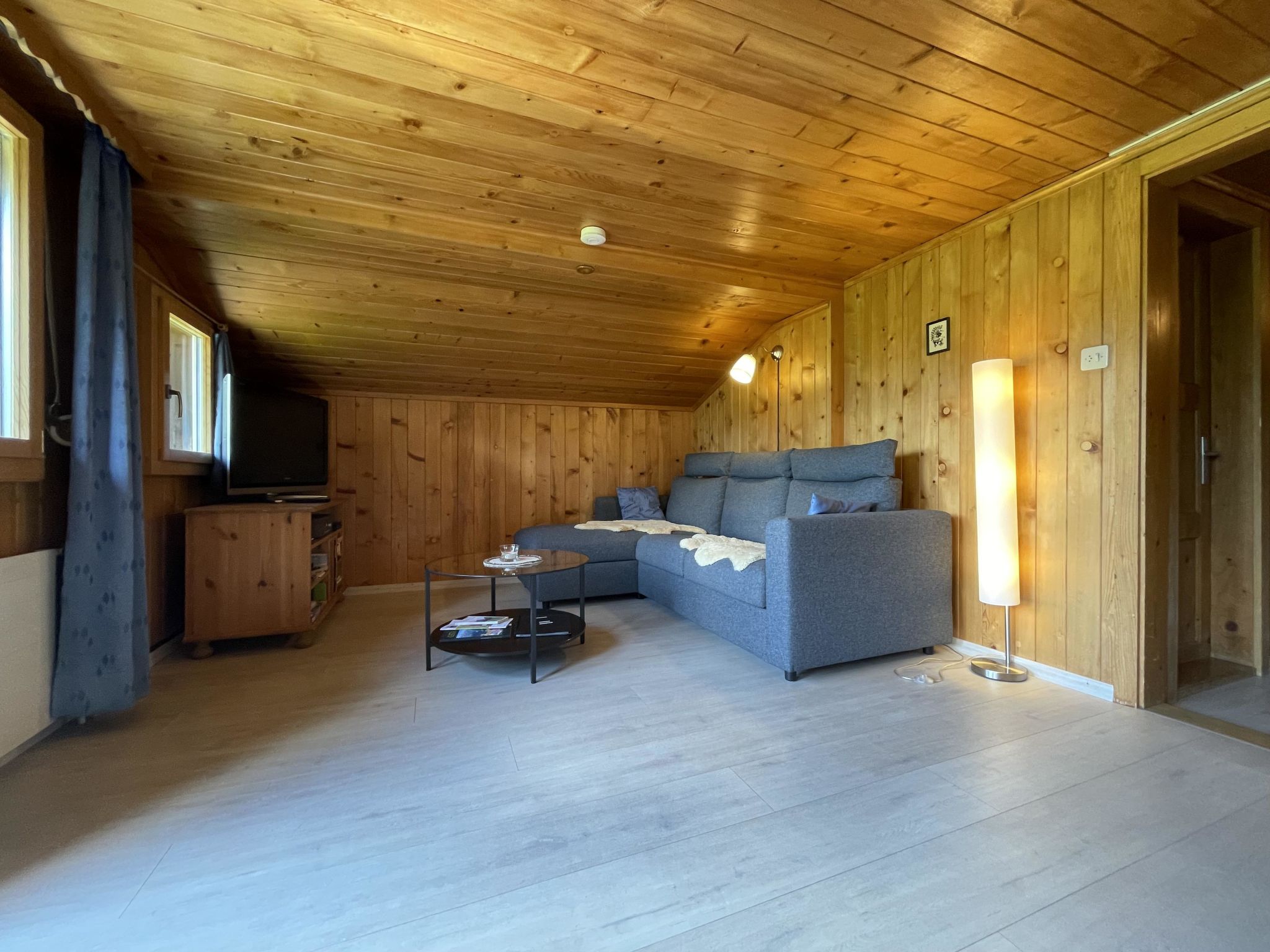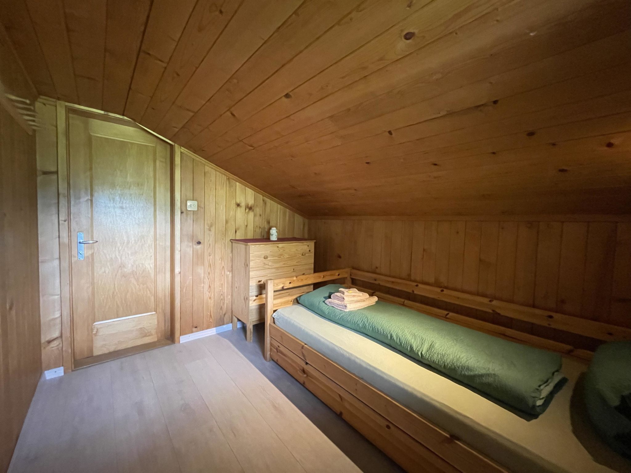 Gemütliche 4-Zimmer-Dachwohnung mit teilweiser Dachschräge. Raumhöhe 2.00 Meter ausserhalb Dachschräge. 1 Schlafzimmer mit Doppelbett (2x90x200cm) und Kleiderschrank. 1 Schlafzimmer mit zwei Einzelbetten (90x200cm), Kleiderschrank und Kommode. 1 kleines Zimmer mit 1 Bett (90x190cm und Kommode. Bad/WC. Separate Küche u.a. ausgestattet mit Backofen, Geschirrspüler, Kapsel-Kaffeemaschine (Delizio), Fondue- und Raclette-Set. Wohnzimmer mit Esstisch, Sofa, TV/Radio und DVD "Blu-ray". WiFi.