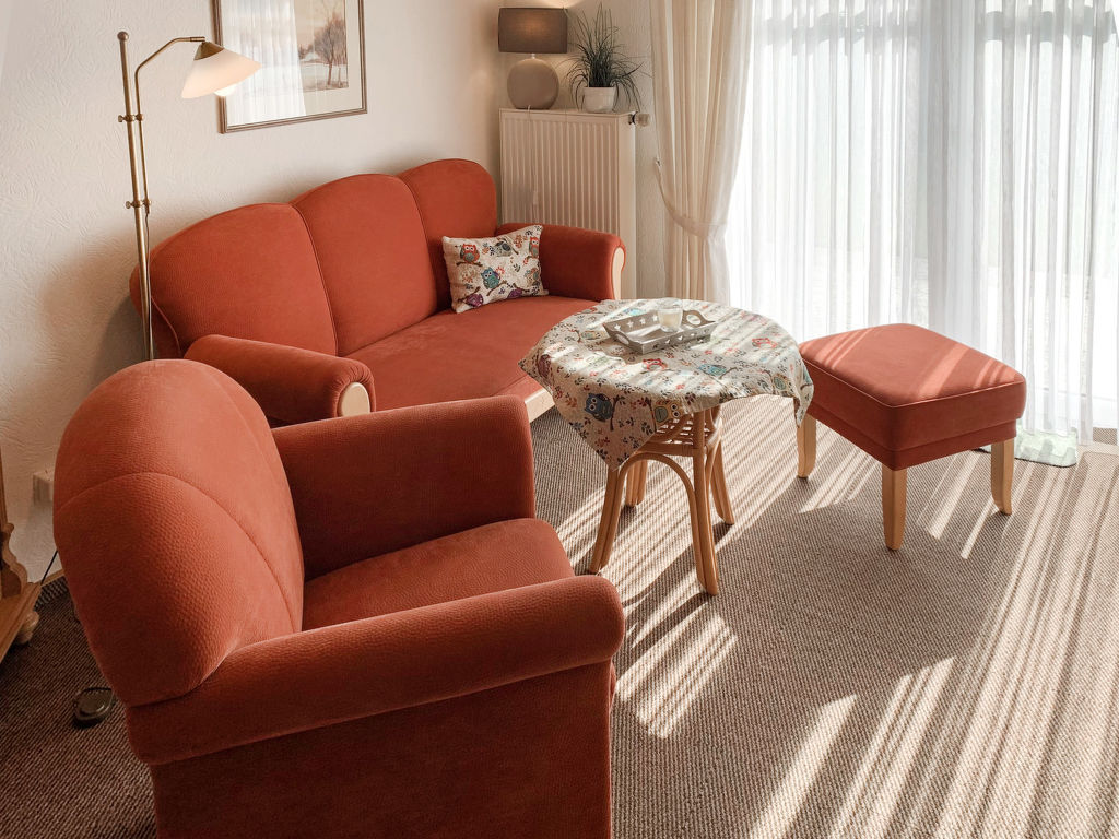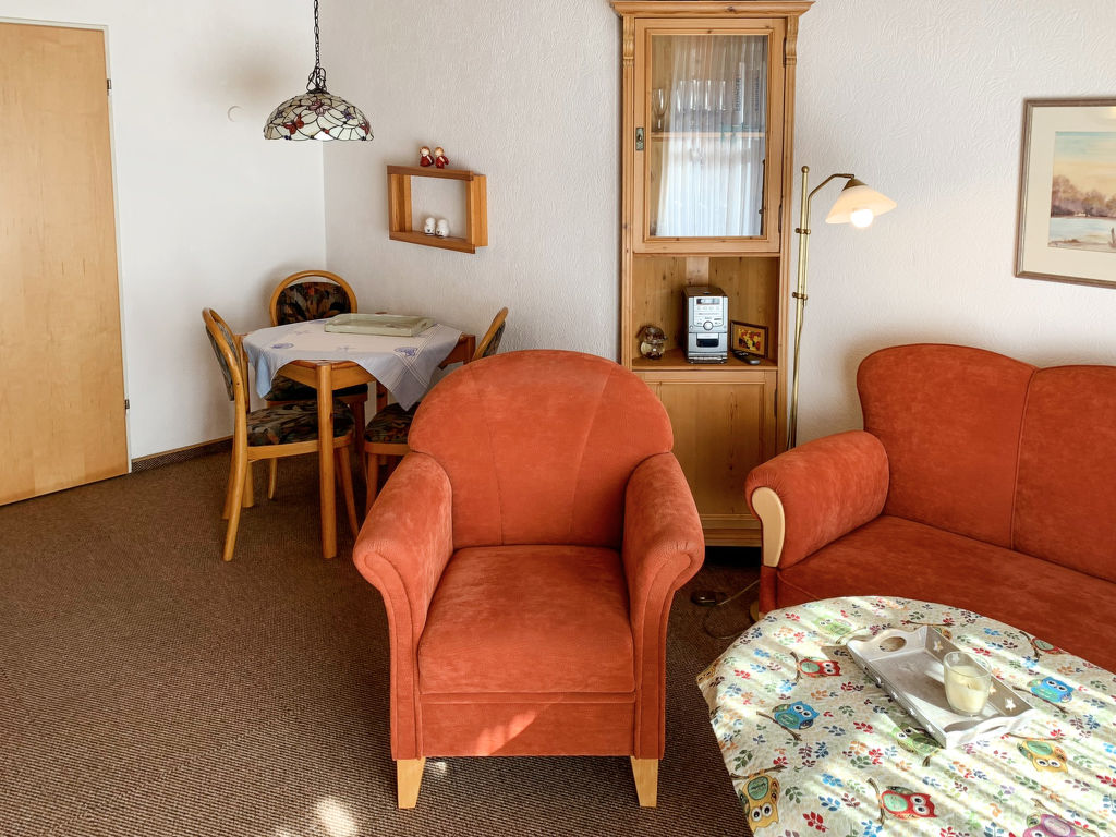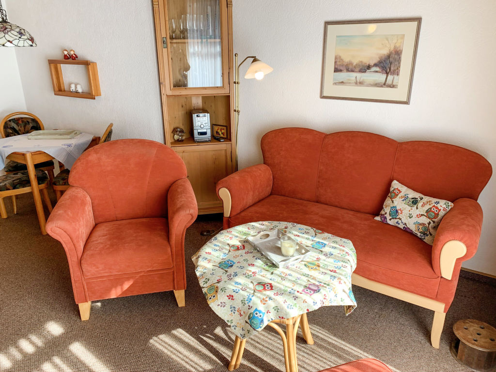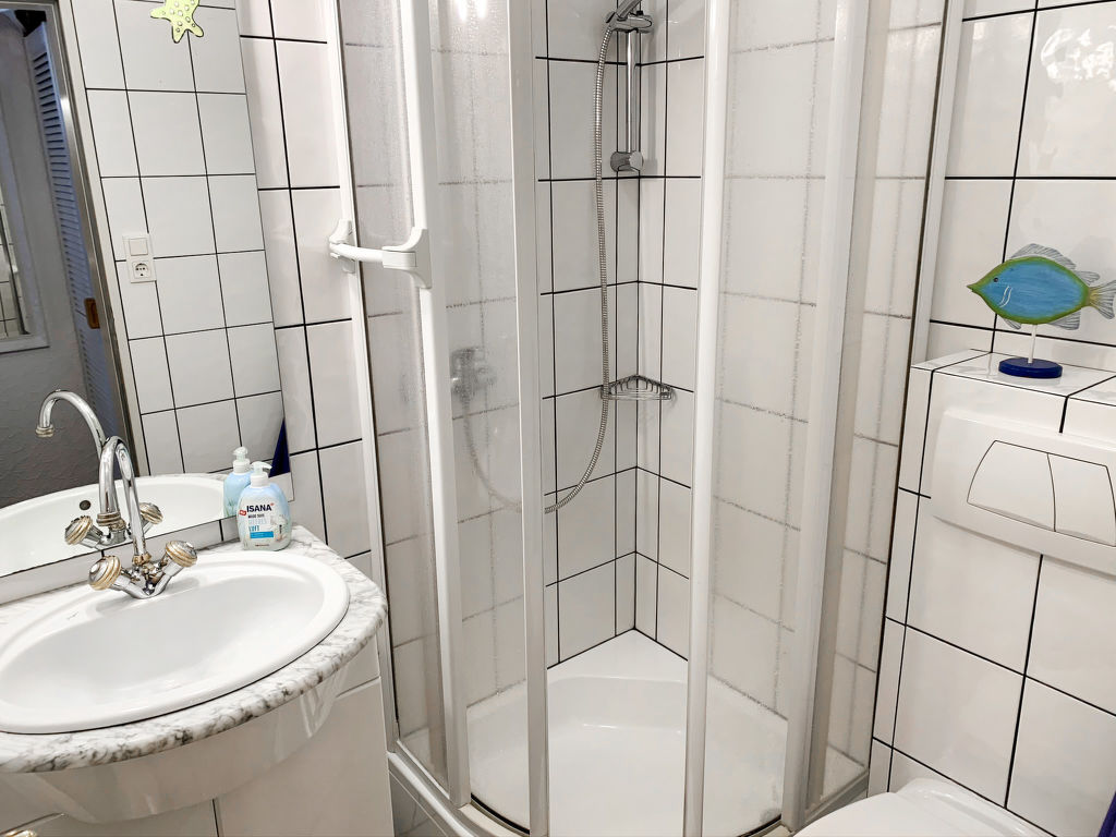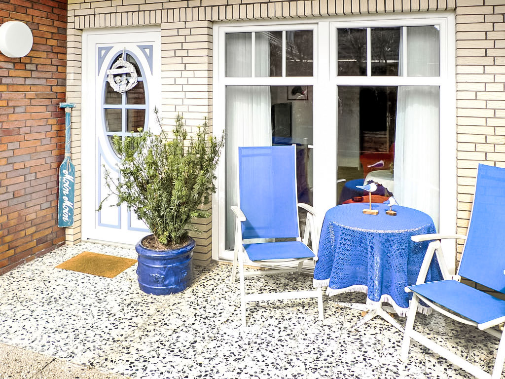 2-Zimmer-Wohnung 35 m2, im Erdgeschoss. Schön und gemütlich eingerichtet: Wohn-/Esszimmer 15 m2 mit Digital-TV, Flachbildschirm und Stereoanlage. Ausgang zur Terrasse. 1 Zimmer 8 m2 mit 1 Doppelbett (2 x 80 cm, Länge 200 cm). Kochnische (2 Kochplatten, Toaster, Wasserkocher, Mikrowelle, elektrische Kaffeemaschine). Dusche/WC. Terrasse. Terrassenmöbel. Zur Verfügung: Telefon (extra), Kinderhochstuhl (extra), Haartrockner. Bitte beachten: Kühlschrank ohne Gefrierfach, Nichtraucher-Unterkunft.