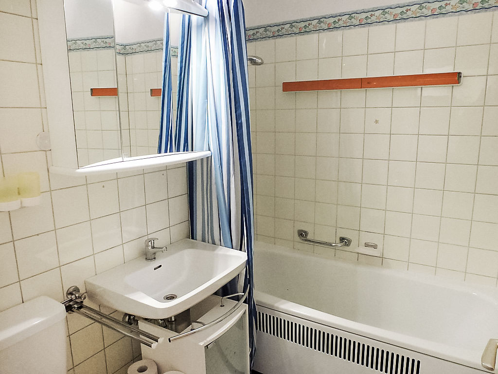 1-Zimmer-Wohnung 42 m2 im 1. Stock. Objekt geeignet für 2 Erwachsene + 2 Kinder. Wohn-/Esszimmer mit 1 Doppeldiwanbett (160 cm, Länge 200 cm), Kabel-TV (Flachbildschirm), Radio und CD. Ausgang zum Balkon. Schlafnische mit 1 franz. Bett. Kleine Küche (4 Kochplatten, Backofen, elektrische Kaffeemaschine). Bad/WC. Balkonmöbel. Zur Verfügung: Telefon, Bügeleisen. Internet (Wireless LAN, gratis). Parkplatz Nr. 22 (überdacht). Bitte beachten: Nichtraucher-Unterkunft. Maximal 1 Haustier/Hund erlaubt. Die Wohnung befindet sich im Hauptgebäude.