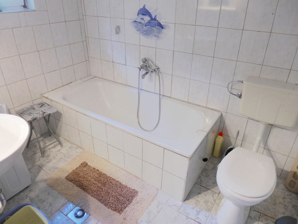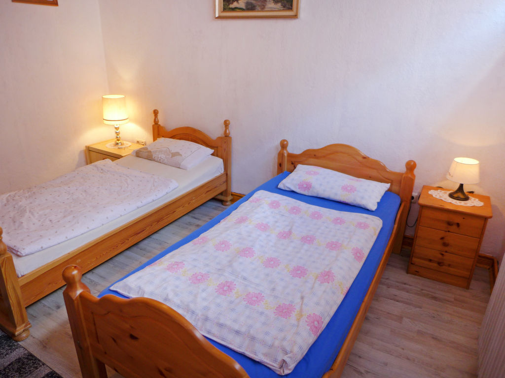3-Zimmer-Wohnung 75 m2, im Erdgeschoss. Einfach und rustikal eingerichtet: Wohnzimmer mit Sat-TV (Flachbildschirm). 1 Zimmer mit 1 Doppelbett (2 x 100 cm, Länge 200 cm). 1 Zimmer mit 2 Betten (90 cm, Länge 200 cm). Küche (Backofen, 4 Glaskeramikherd Platten, Mikrowelle, Tiefkühler, elektrische Kaffeemaschine) mit Esstisch, Radio. Bad/WC. Kleine Terrasse. Terrassenmöbel, Gartengrill (mobil), Liegestühle (2). Zur Verfügung: Waschmaschine (extra). Bitte beachten: Nichtraucher-Unterkunft. Maximal 1 Haustier/Hund erlaubt. Die Deckenhöhe im Badezimmer beträgt 2 m.