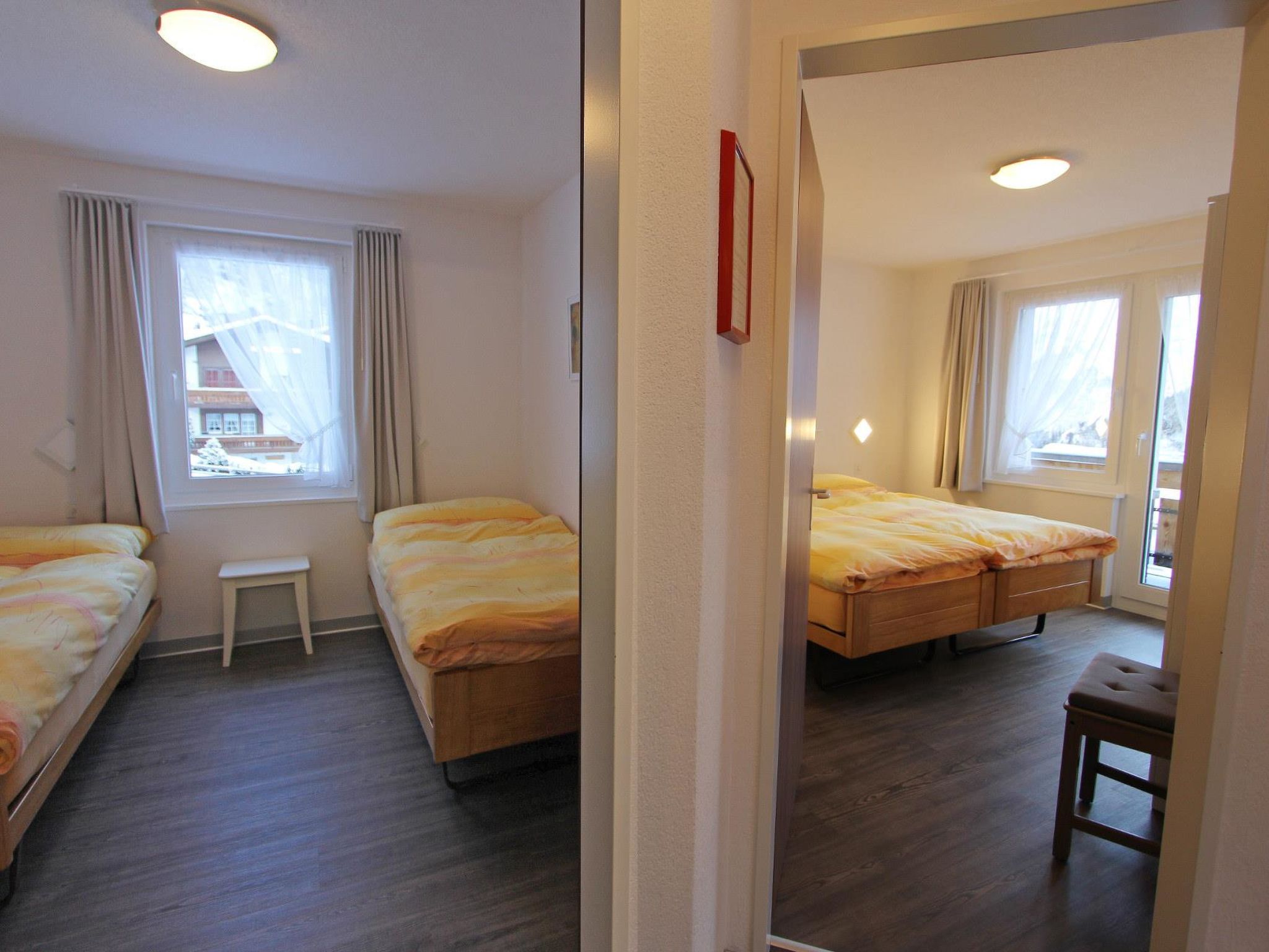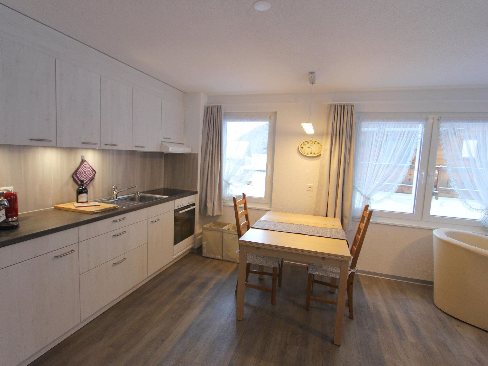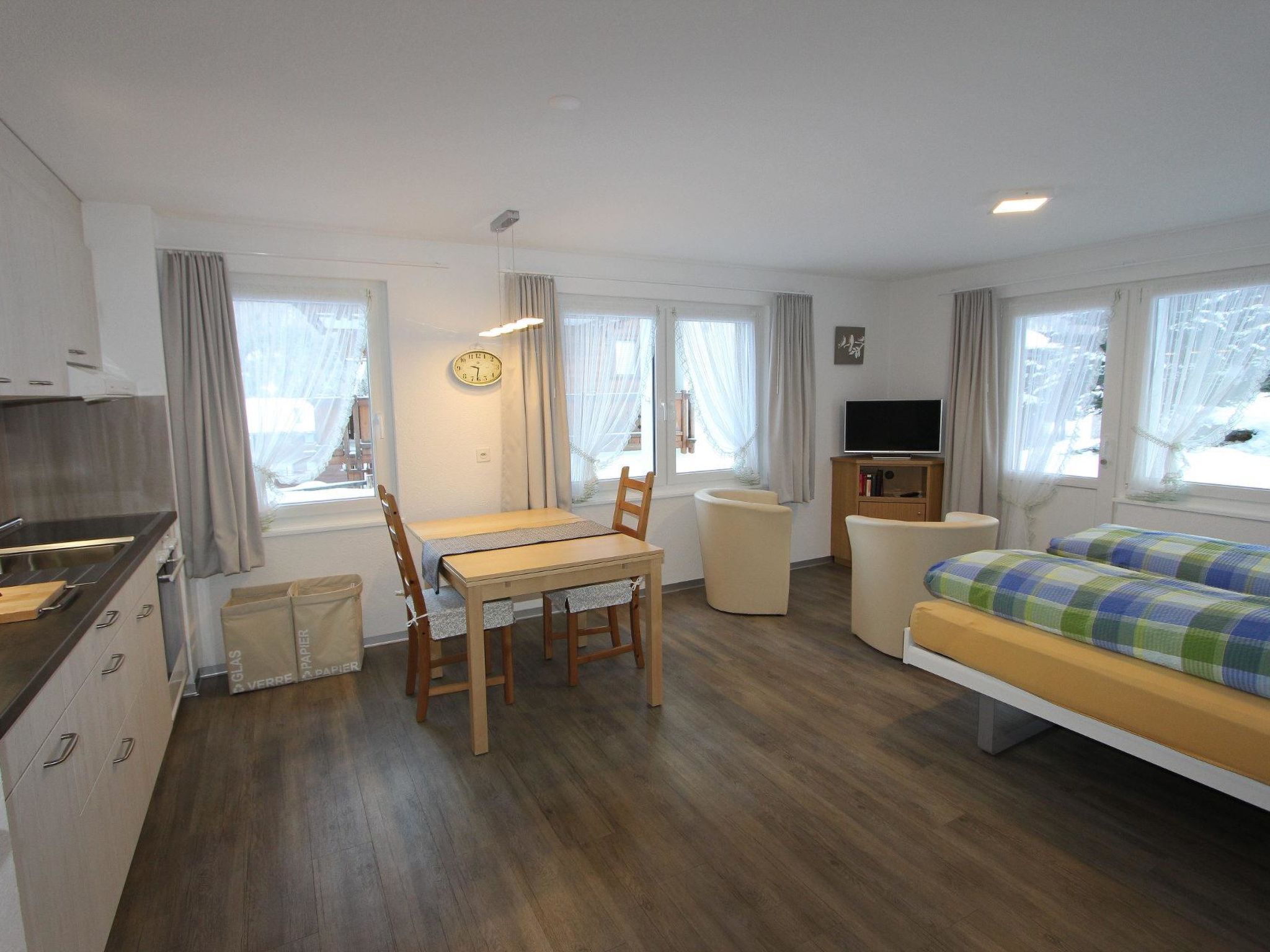 3-Zimmerwohnung (2. Stock; 61m2) mit 4 Betten, Wohn/Essraum, offene Küche, 1 Doppelschlafzimmer, 1 Zweitbettzimmer, Dusche/WC, Südbalkon, Lift, gemütlich, heimelig und zweckmässig eingerichtet, in der Nähe der Skilifte und Bahnen.