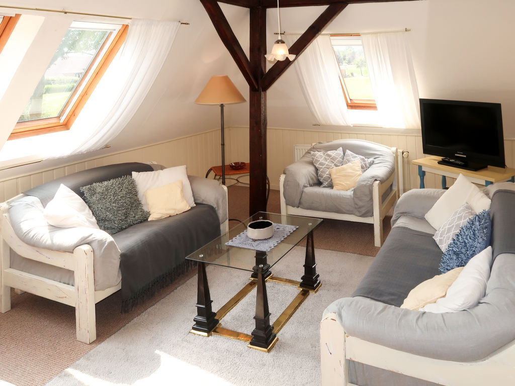 2-Zimmer-Wohnung 60 m2, im Obergeschoss. Hell, abgeschrägt, gemütlich eingerichtet: Wohn-/Schlafzimmer mit 1 Bett (100 cm, Länge 200 cm), Sat-TV (Flachbildschirm). Wohn-/Schlafzimmer mit 1 franz. Bett (140 cm, Länge 200 cm), Sat-TV (Flachbildschirm). Küche (Backofen, 4 Glaskeramikherd Platten, Toaster, Wasserkocher, elektrische Kaffeemaschine) mit Radio. Sitzbad/WC. Holzböden. Gartengrill (mobil), Liegestühle (2). Schöne Sicht auf die Landschaft. Zur Verfügung: Internet (Wireless LAN, gratis). Bitte beachten: Nichtraucher-Haus. Maximal 1 Haustier/Hund erlaubt. Eigener Eingang.