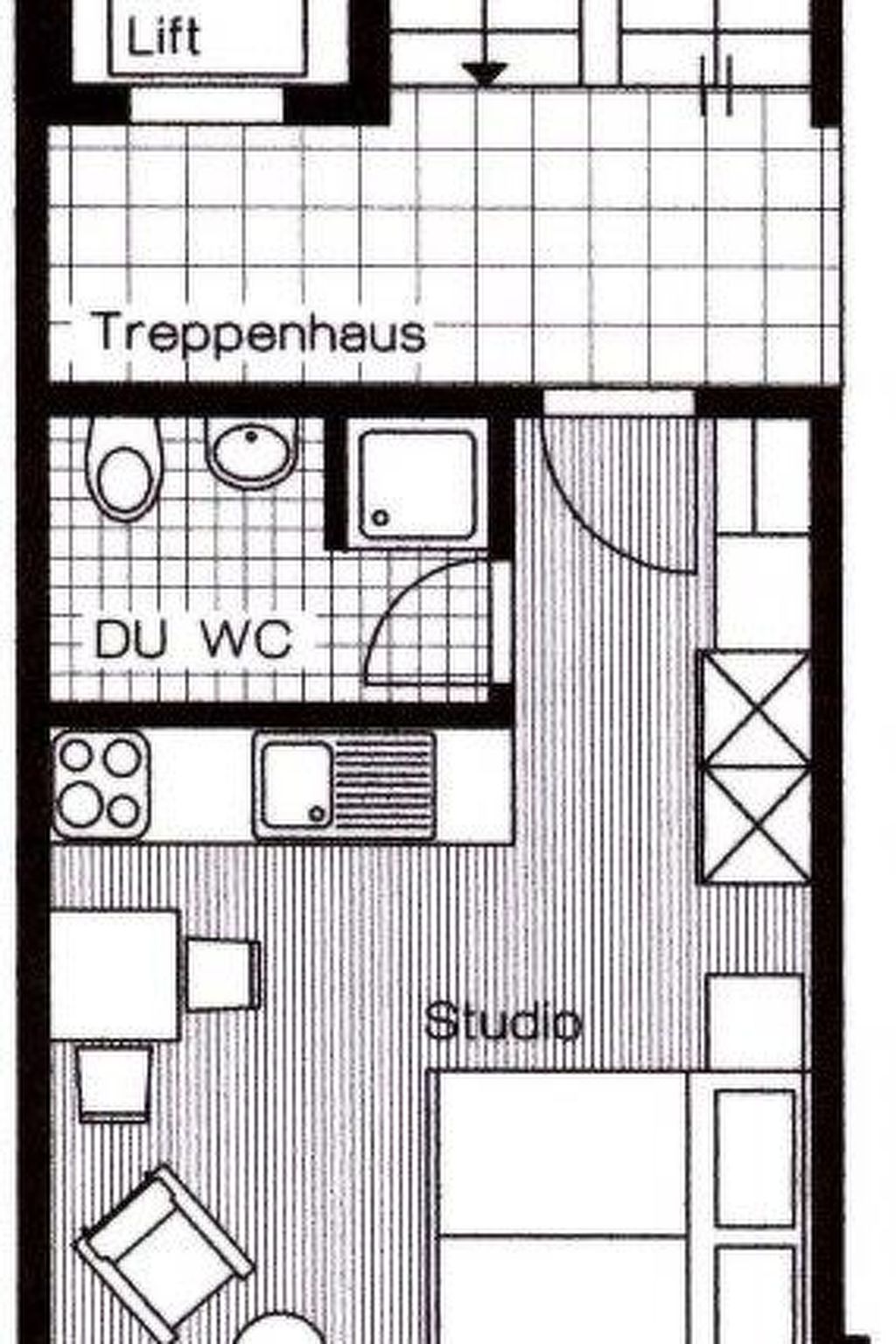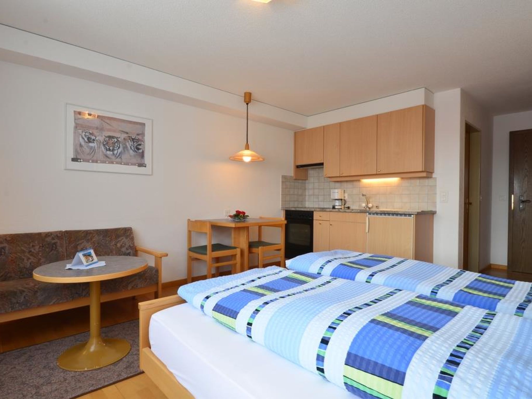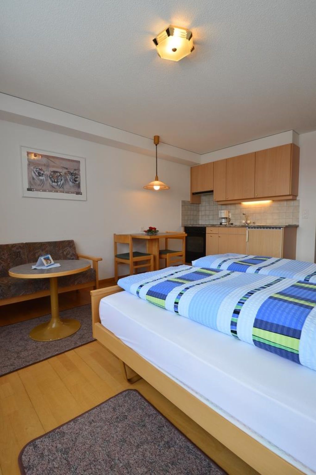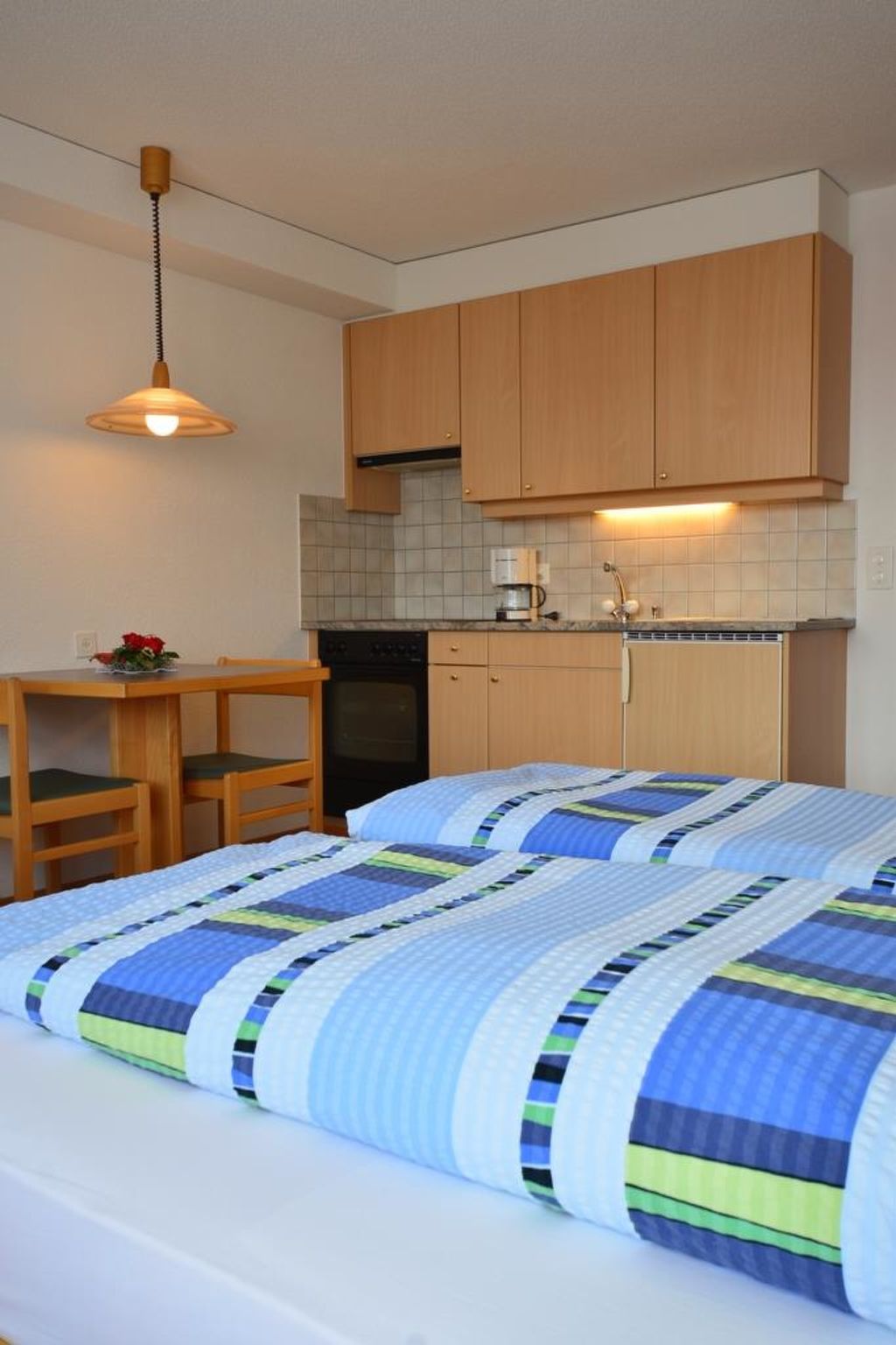 Modernes Studio (2 Betten, 25 m2), 2° Stock, Wohnschlafzimmer (Kochnische, Essecke, Wohnzimmertisch, Polsterstühle, Farb-TV und Radio), Dusche/WC, Süd-Balkon, Telefonmiete möglich.