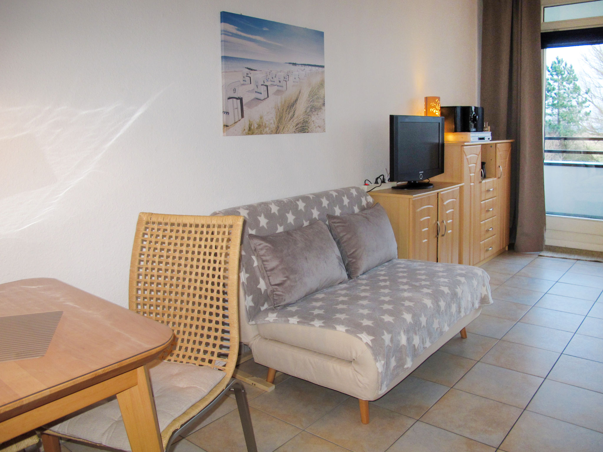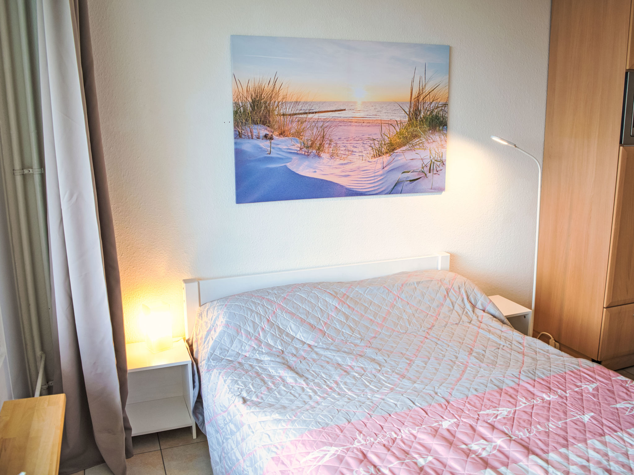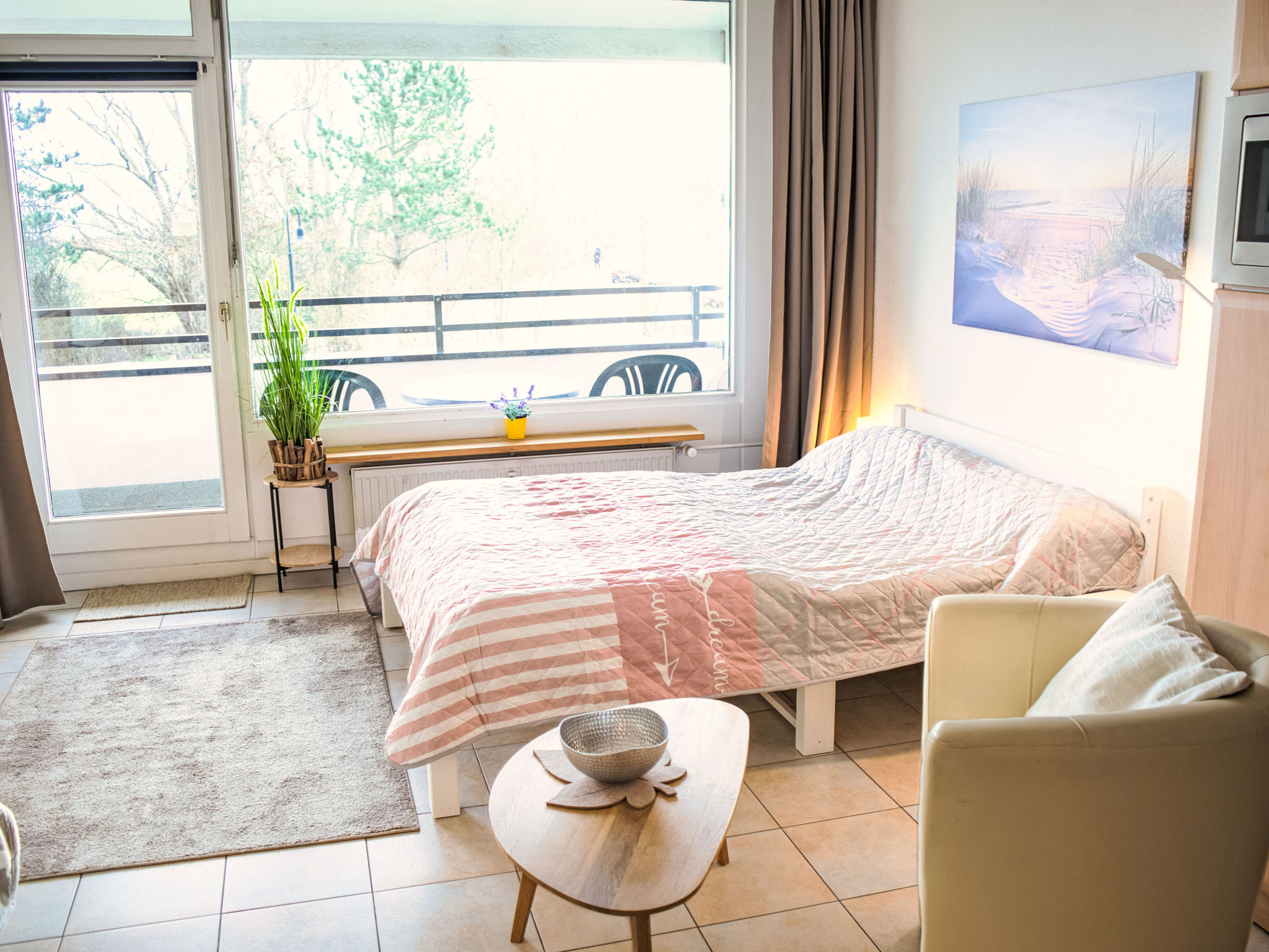 "Ostsee-Residenz (DMP170)", 1-Zimmer-Wohnung 35 m2 im 1. Stock. Gemütlich eingerichtet: Wohn-/Schlafzimmer mit 1 Diwanbett (120 cm, Länge 200 cm), 1 Doppeldiwanbett (160 cm, Länge 200 cm), Esstisch, Sat-TV, Stereoanlage und DVD. Ausgang zum Balkon. Offene Küche (Backofen, Geschirrspüler, 4 Glaskeramikherd Platten, Toaster, Wasserkocher, Mikrowelle, elektrische Kaffeemaschine). Dusche/WC. Balkonmöbel. Sicht auf das Meer. Zur Verfügung: Internet (Wireless LAN, gratis). Bitte beachten: Nichtraucher-Unterkunft. Maximal 1 Haustier/Hund erlaubt. Rauchmelder, Feuerlöscher.
