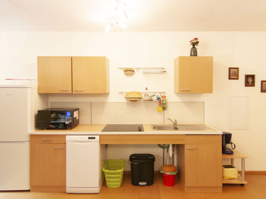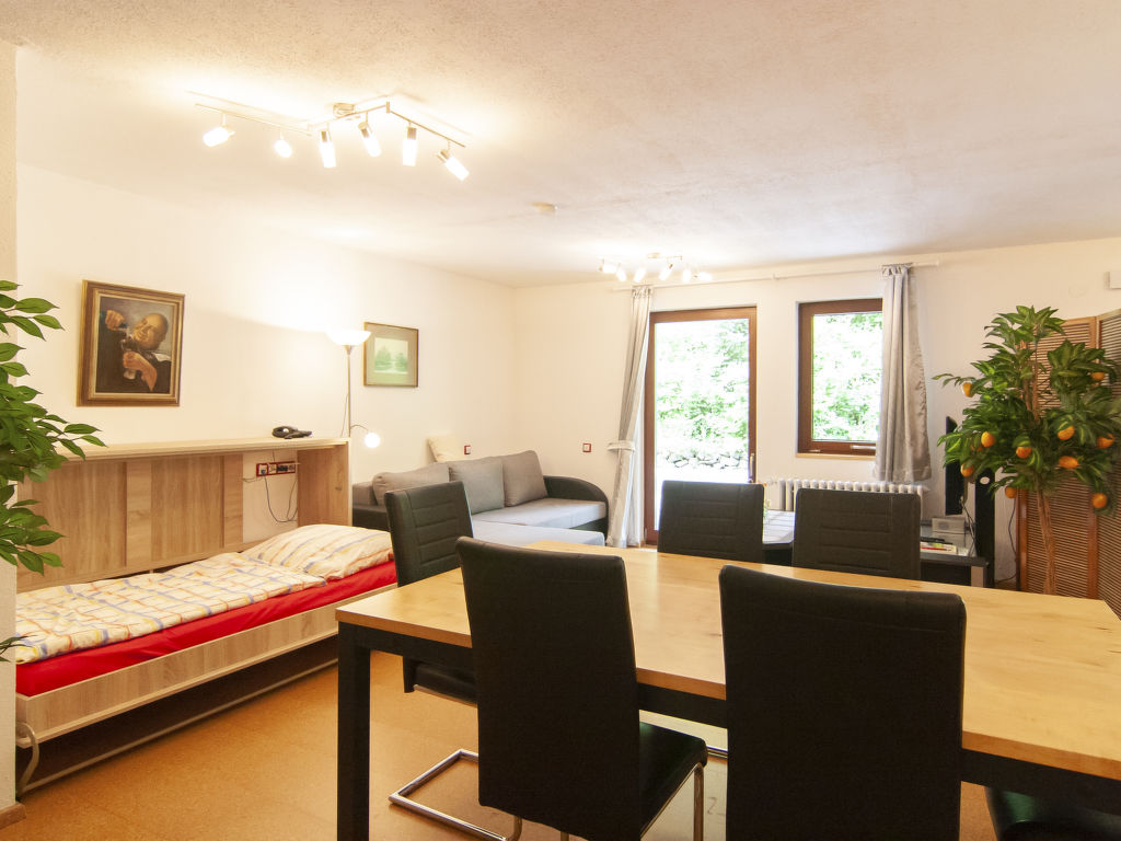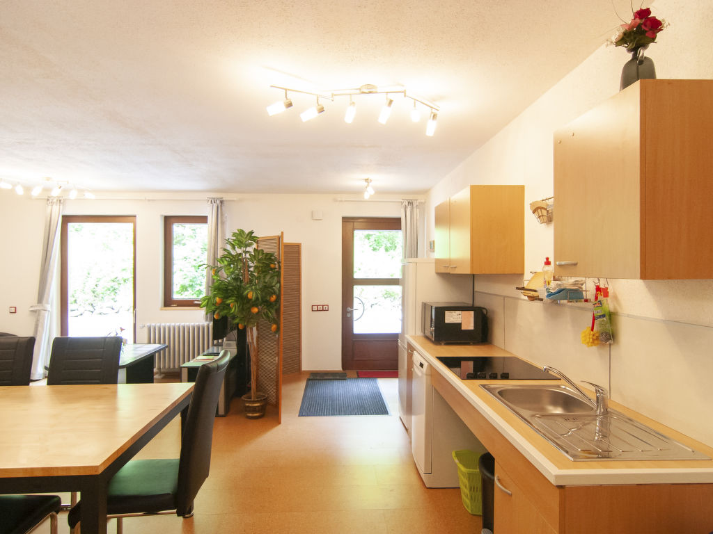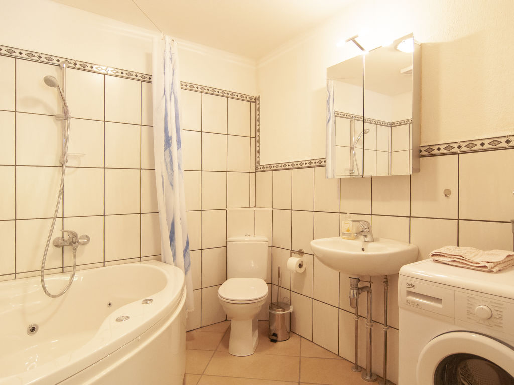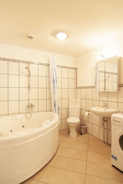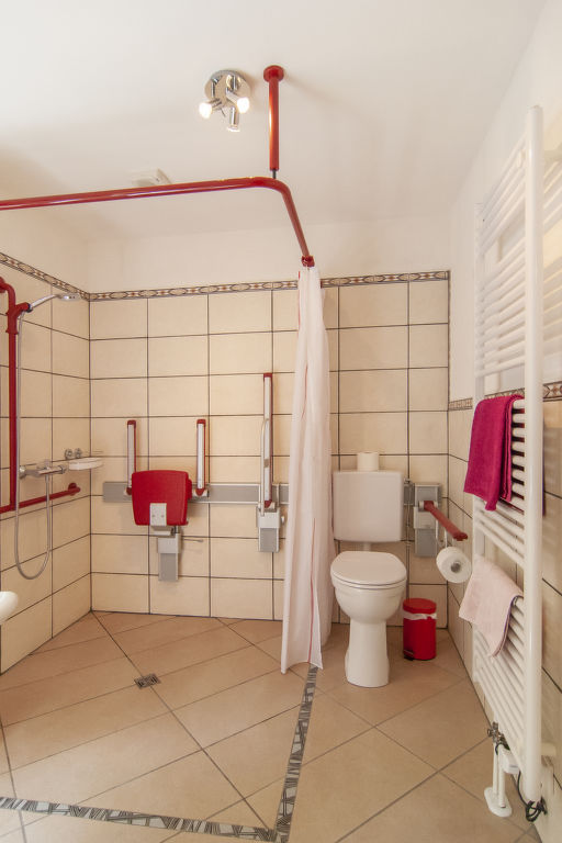 2-Zimmer-Wohnung 83 m2, im Erdgeschoss. Geschmackvoll und gemütlich eingerichtet: Wohn-/Schlafzimmer 38 m2 mit 1 Doppeldiwanbett (140 cm, Länge 200 cm), 1 Wandklappbett (90 cm, Länge 200 cm), Sat-TV (Flachbildschirm), DVD. Ausgang zum Balkon, zur Terrasse. 1 Zimmer 18 m2 mit 1 Doppelbett (180 cm, Länge 200 cm), Sat-TV (Flachbildschirm). Ausgang zum Balkon. Kochnische (4 Kochplatten, Geschirrspüler, Toaster, Wasserkocher, elektrische Kaffeemaschine, Kombinationsmikrowelle). Bad/WC, Whirlbadewanne. Balkon 12 m2, Terrasse 6 m2, überdacht. Terrassenmöbel, Balkonmöbel. Zur Verfügung: Waschmaschine. Internet (Wireless LAN, gratis). Bitte beachten: Nichtraucher-Unterkunft. Maximal 2 Haustiere/Hunde erlaubt. Rauchmelder, Feuerlöscher. Balkon und Terrasse sind nicht von den anderen Wohnungen abgetrennt. Optimale Barrierefreiheit: der Zugang zu Wohnung, Balkon am Bach und zur Dachterrasse, die Fenster und Türen sowie das Badezimmer sind vollständig barrierefrei ausgelegt.