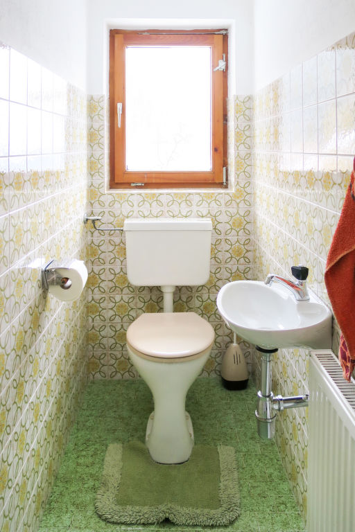 8-Zimmer-Haus, 2 Etagen, ca. 140 m². Zugang über Treppenhaus in die 1. Etage: Vorraum mit Garderobe. Schlafzimmer mit Doppelbett, Duschkabine und Waschbecken, von hier Zugang zu Doppelzimmer. Einzelzimmer mit Waschbecken. 2x Sep.WC. 2. Etage: Wohn-/Aufenthaltsraum mit Essplatz (Eckbank), Balkonausgang. Kleine Küche (4 Ceranfelder, Backofen, Geschirrspüler, Kühlschrank, Kaffeemaschine, Wasserkocher) mit Essplatz (Eckbank) für 5 Personen und Balkonausgang. Kleine Speisekammer. Doppelzimmer mit Duschkabine und Waschbecken. Doppelzimmer mit Waschbecken. Kleines Doppelzimmer. Einzelzimmer mit Waschbecken. Dusche/WC. Sep.WC.