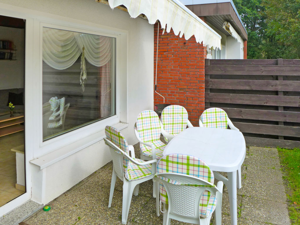 "Kajüte", 4-Zimmer-Reihenhaus 55 m2, im Erdgeschoss. Gemütlich eingerichtet: Wohn-/Esszimmer 22 m2 mit Sat-TV und Stereoanlage. Ausgang zur Terrasse. 1 Zimmer 10 m2 mit 1 Doppelbett (2 x 90 cm, Länge 200 cm). 1 Zimmer 4 m2 mit 1 x 2 Etagenbetten (90 cm, Länge 200 cm). 1 Zimmer 4 m2 mit 1 Bett (90 cm, Länge 200 cm). Kochnische (4 Kochplatten, Backofen, Geschirrspüler, Toaster, Wasserkocher, elektrische Kaffeemaschine). Dusche/WC. Terrasse 12 m2, Rasen. Terrassenmöbel. Zur Verfügung: Kinderhochstuhl (extra). Bitte beachten: Nichtraucher-Haus.