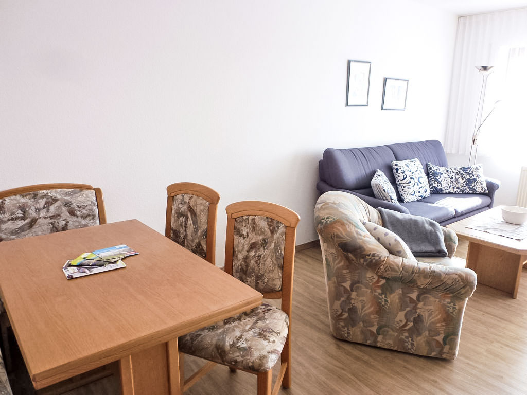 2-Zimmer-Wohnung 46 m2, unteres Geschoss. Wohn-/Esszimmer mit Sat-TV (Flachbildschirm). Ausgang zum Balkon. 1 kleines Doppelzimmer. Kleine Küche (Backofen, elektrische Kaffeemaschine). Dusche/WC. Balkonmöbel. Parkplatz Nr. 86. Bitte beachten: Nichtraucher-Unterkunft.