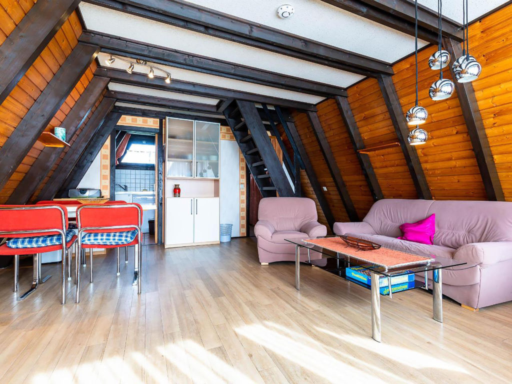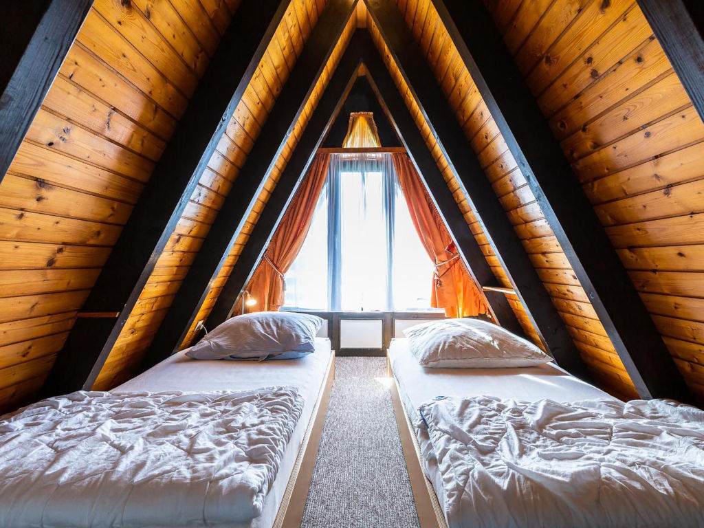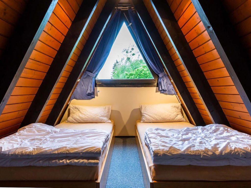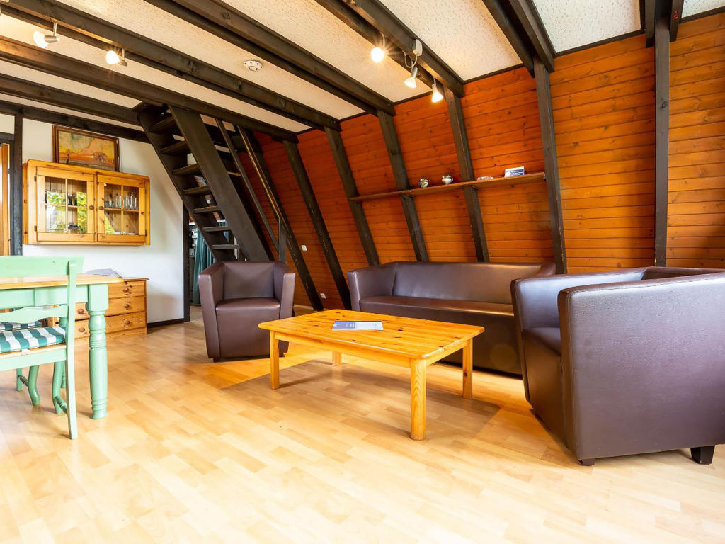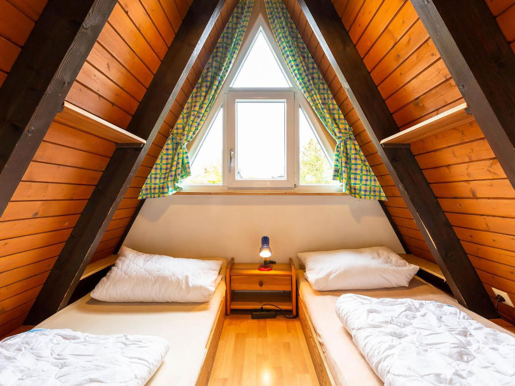 3-Zimmer-Haus 50 m2 auf 2 Stockwerken, im Erdgeschoss. Abgeschrägt: Wohn-/Esszimmer mit Sat-TV und Radio. Ausgang zum Garten, zur Terrasse. Abgeschrägte, offene Küche (2 Kochplatten, elektrische Kaffeemaschine). Dusche/WC. Dachgeschoss: (steile Treppe) 2 abgeschrägte Zimmer, jedes Zimmer mit 2 Betten. E-Heizung. Terrassenmöbel. Zur Verfügung: Internet (Wireless LAN, gratis). Bitte beachten: Nichtraucher-Haus. Maximal 1 kleines Haustier/Hund erlaubt. Nurdachhaus in Holzbauweise.