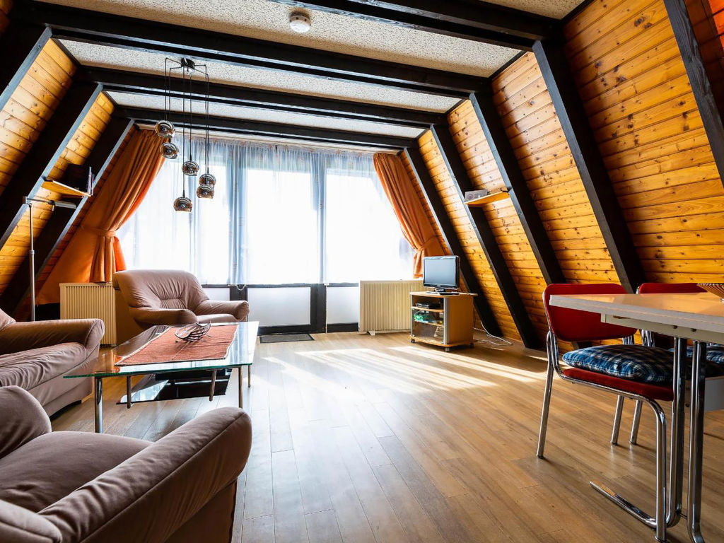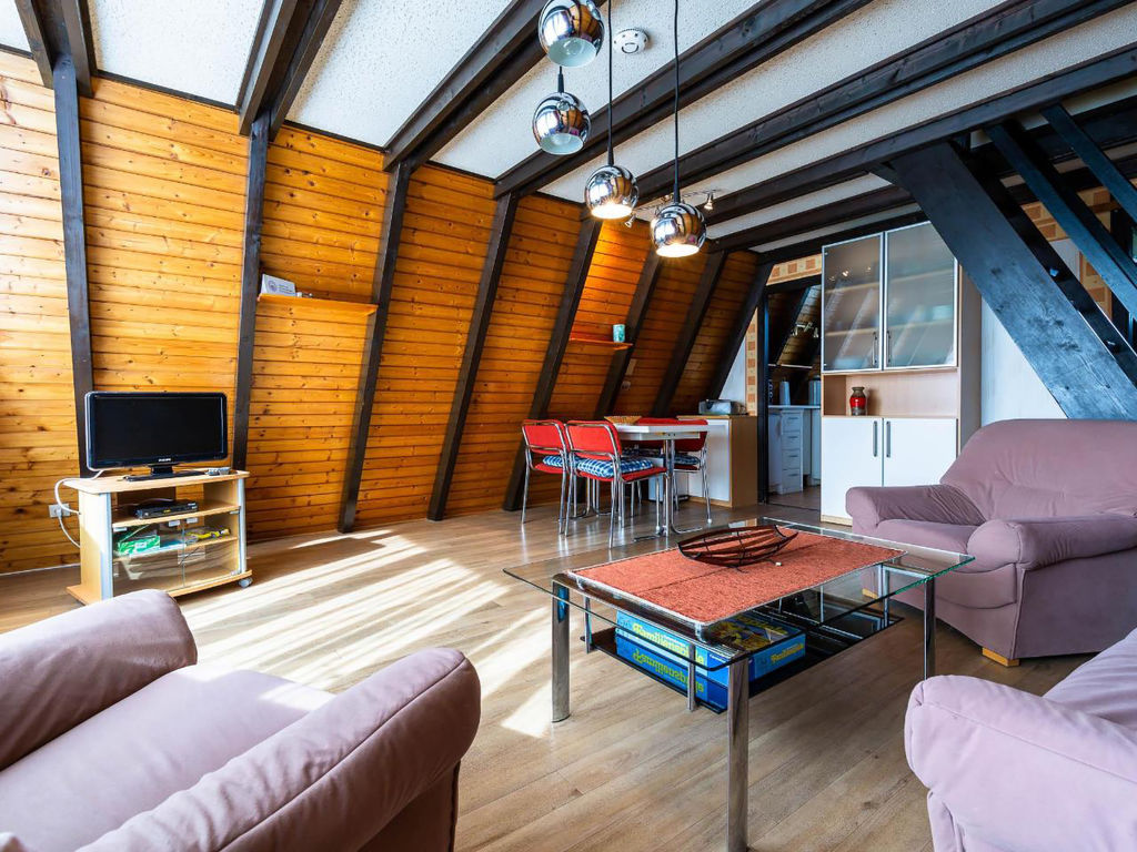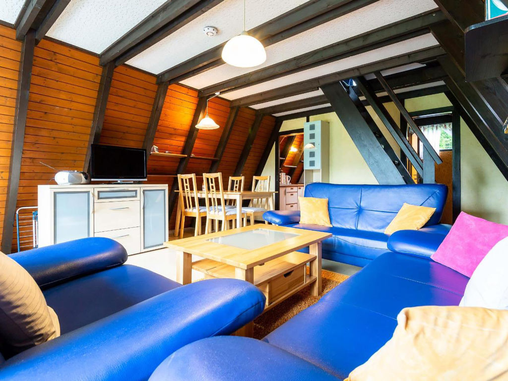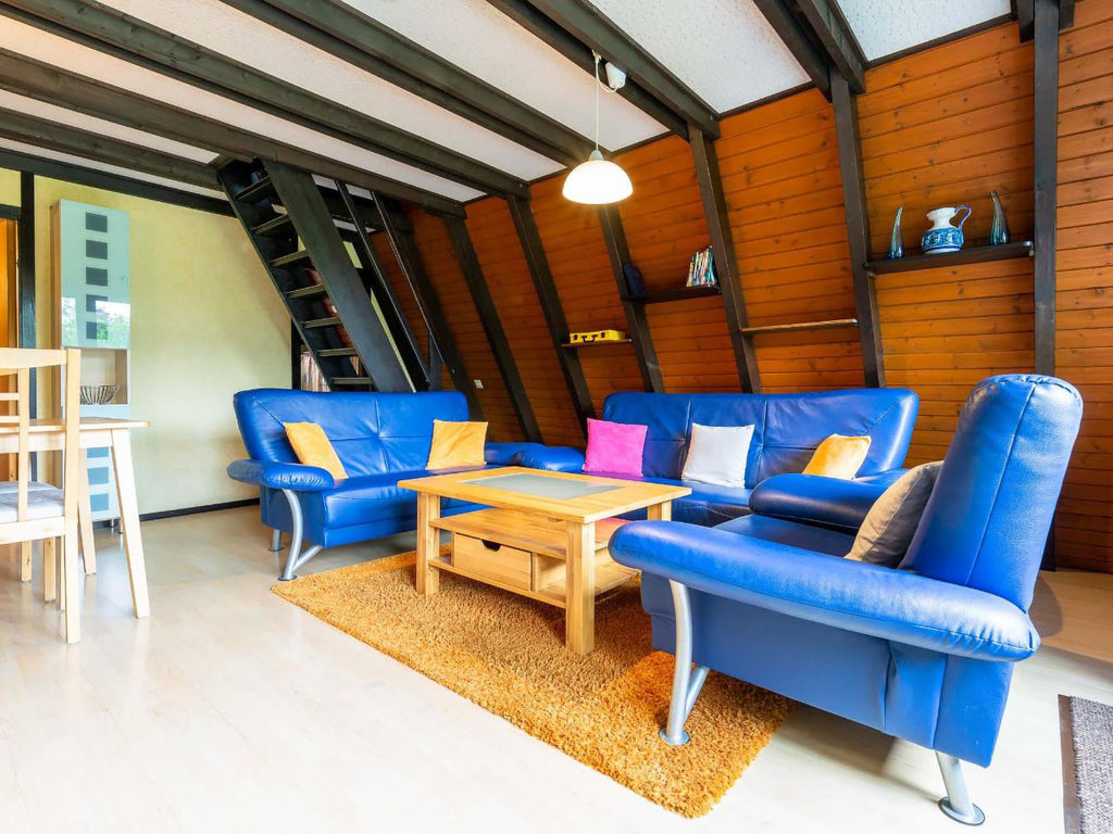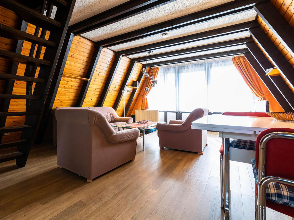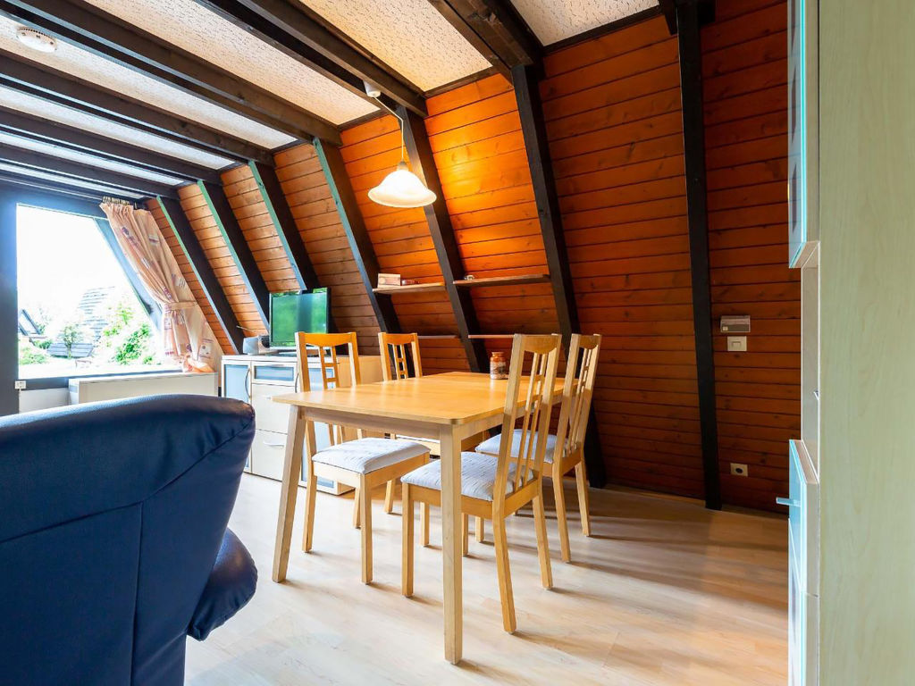 3-Zimmer-Haus 50 m2 auf 2 Stockwerken, im Erdgeschoss. Abgeschrägt: Wohn-/Esszimmer mit Sat-TV und Radio. Ausgang zum Garten, zur Terrasse. Abgeschrägte, offene Küche (2 Kochplatten, elektrische Kaffeemaschine). Dusche/WC. Dachgeschoss: (steile Treppe) 2 abgeschrägte Zimmer, jedes Zimmer mit 2 Betten. E-Heizung. Terrassenmöbel. Zur Verfügung: Internet (Wireless LAN, gratis). Bitte beachten: Nichtraucher-Haus. Maximal 1 kleines Haustier/Hund erlaubt. Nurdachhaus in Holzbauweise.