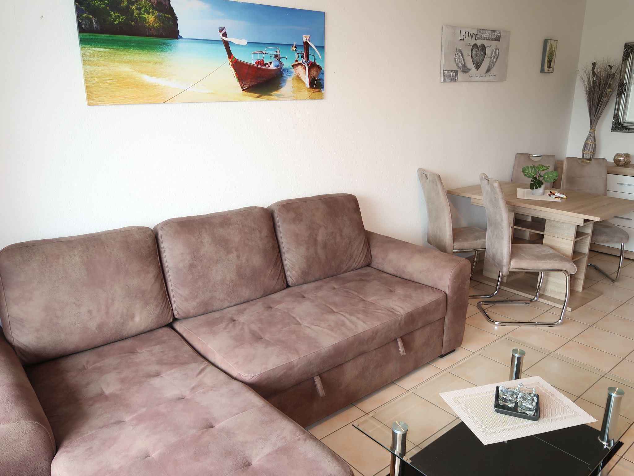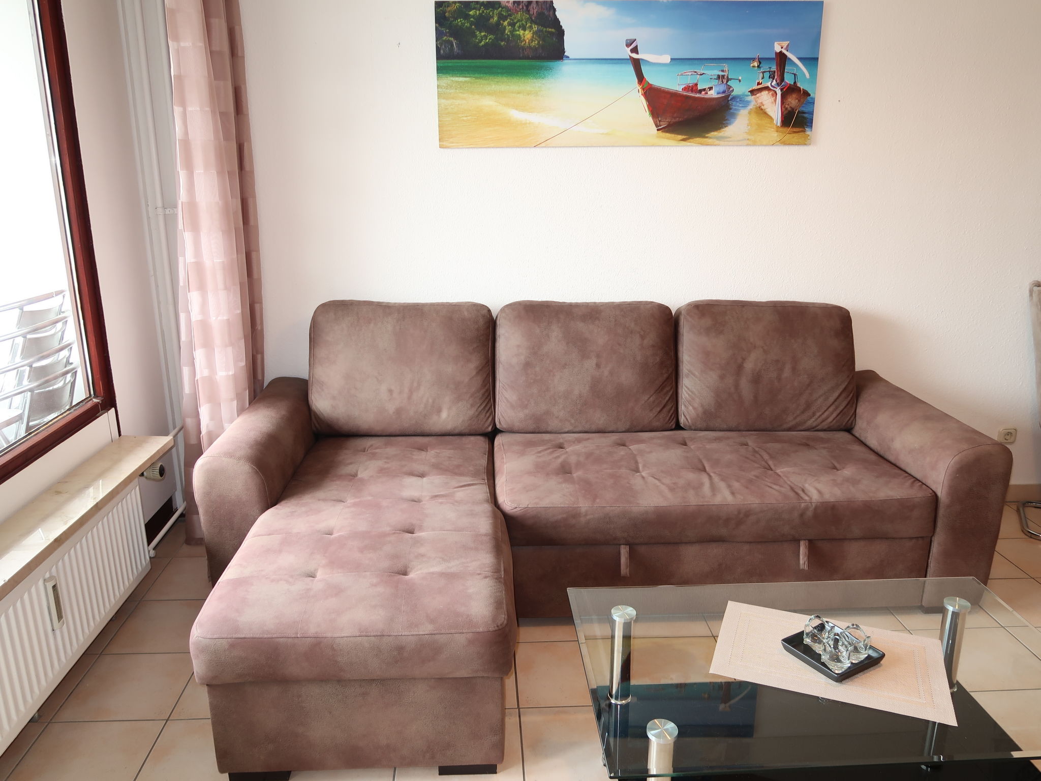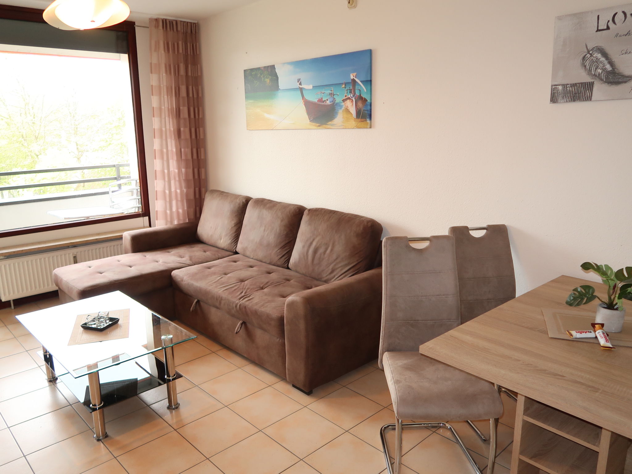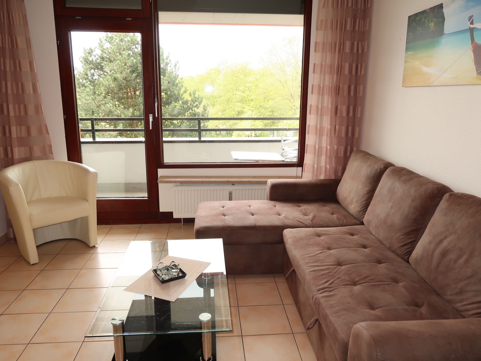"Ostsee-Residenz (DMP160)", 2-Zimmer-Wohnung 45 m2 im 3. Stock. Gemütlich eingerichtet: Wohn-/Schlafzimmer mit 1 Doppeldiwanbett, Esstisch, Sat-TV und Stereoanlage. Ausgang zum Balkon. 1 Zimmer mit 1 Doppelbett. Offene Küche (4 Kochplatten, Backofen, Toaster, Wasserkocher, Mikrowelle, elektrische Kaffeemaschine). Dusche/WC. Balkonmöbel, Abstellkammer. Sicht auf die Landschaft. Zur Verfügung: Waschmaschine, Kinderhochstuhl, Babybett. Bitte beachten: Maximal 1 Haustier/Hund erlaubt. Rauchmelder.