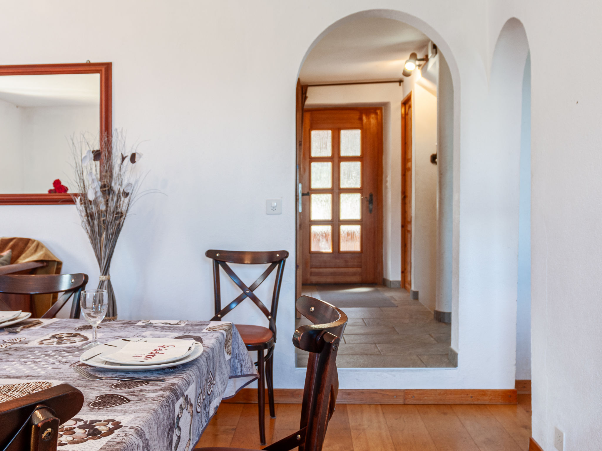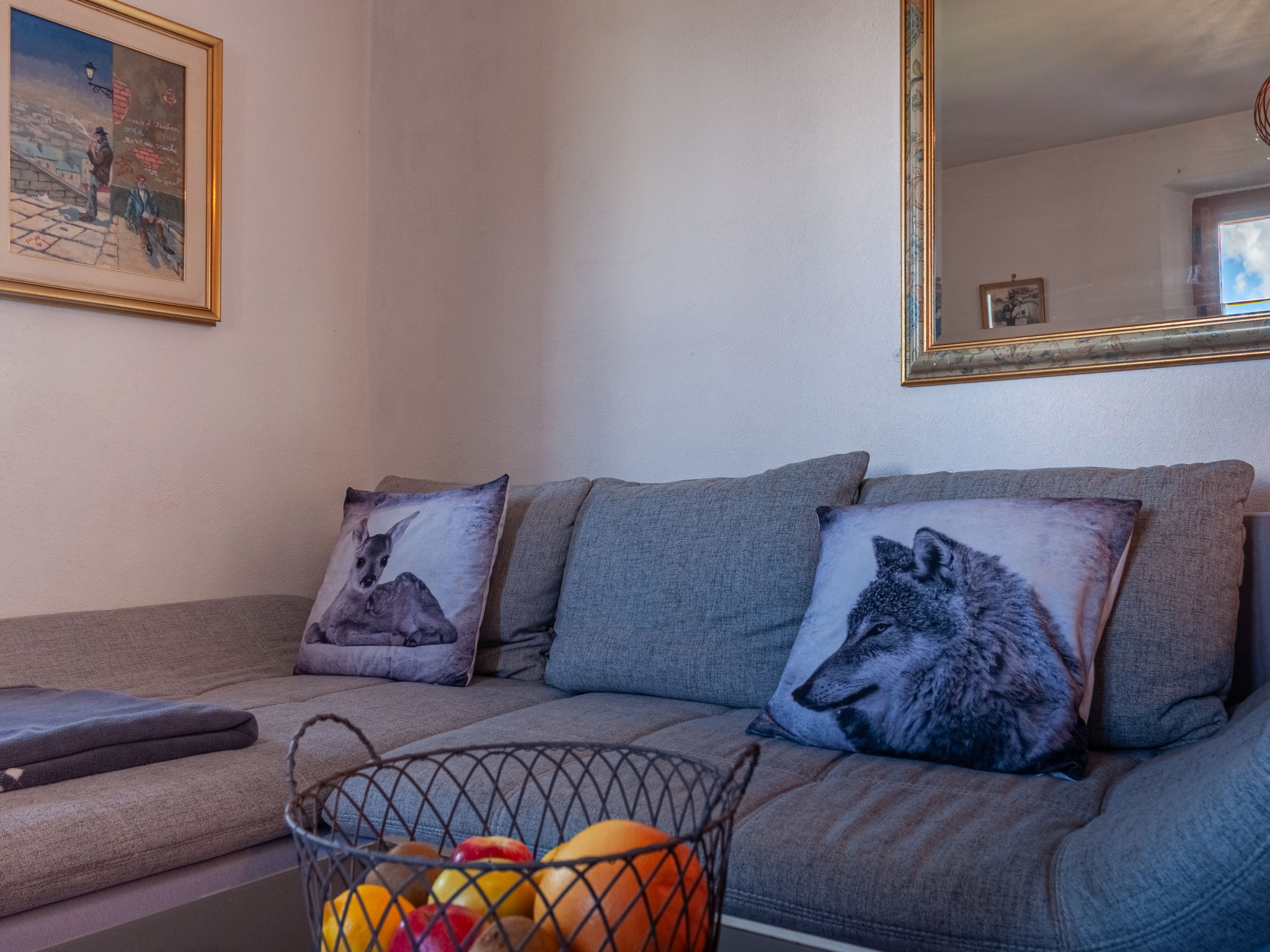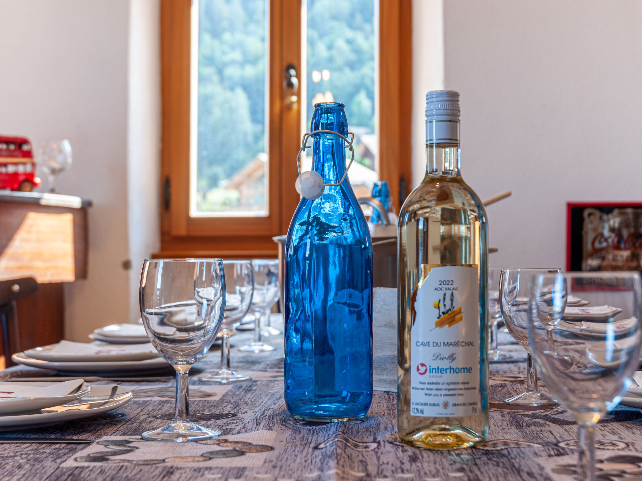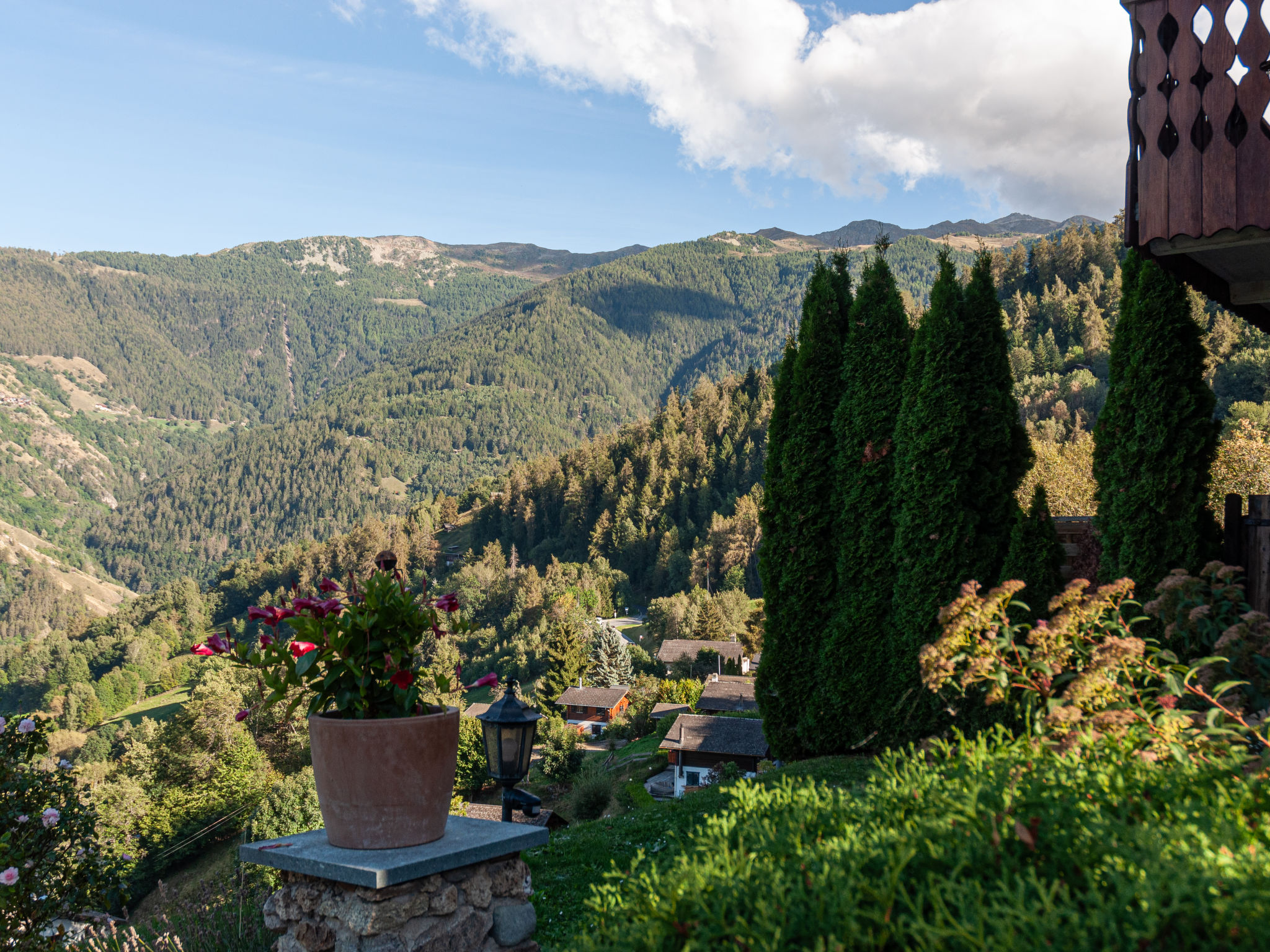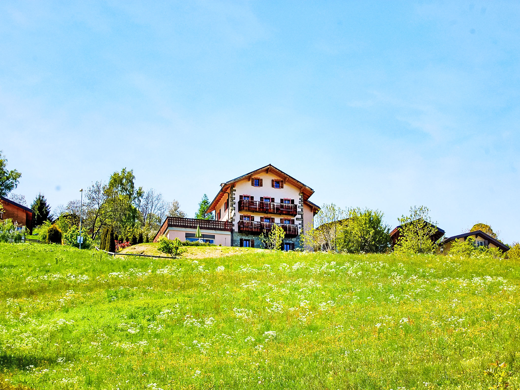 "Le Dahu", 6-Zimmer-Haus 200 m2 auf 3 Stockwerken. Komfortabel und schön eingerichtet: Wohnzimmer mit offenem Kamin, Kabel-TV und Flachbildschirm. Esszimmer mit Bar. Ausgang zum Balkon, Richtung Osten. Küche (Backofen, Geschirrspüler, 4 Glaskeramikherd Platten, Mikrowelle, elektrische Kaffeemaschine, Racletteofen, Fondue Set (Käse)). Dusche, sep. WC. Obergeschoss: 1 Doppelzimmer mit 1 Doppelbett (2 x 90 cm, Länge 200 cm). Ausgang zum Balkon, Richtung Osten. 1 Doppelzimmer mit 1 franz. Bett (160 cm, Länge 200 cm). Bad/WC. Dachgeschoss: 3 abgeschrägte Zimmer, jedes Zimmer mit 2 Betten (90 cm, Länge 200 cm). Offenes kleines Spielzimmer mit TV und DVD. Dusche/WC. Garten. Terrassenmöbel, Gartengrill, Liegestühle. Herrliche Panoramasicht auf die Berge und das Tal. Zur Verfügung: Waschmaschine, Babybett, Haartrockner. Internet (Wireless LAN, gratis). Parkplatz (2 Autos) beim Haus. Bitte beachten: Nichtraucher-Haus. 1 Haustier/Hund erlaubt.