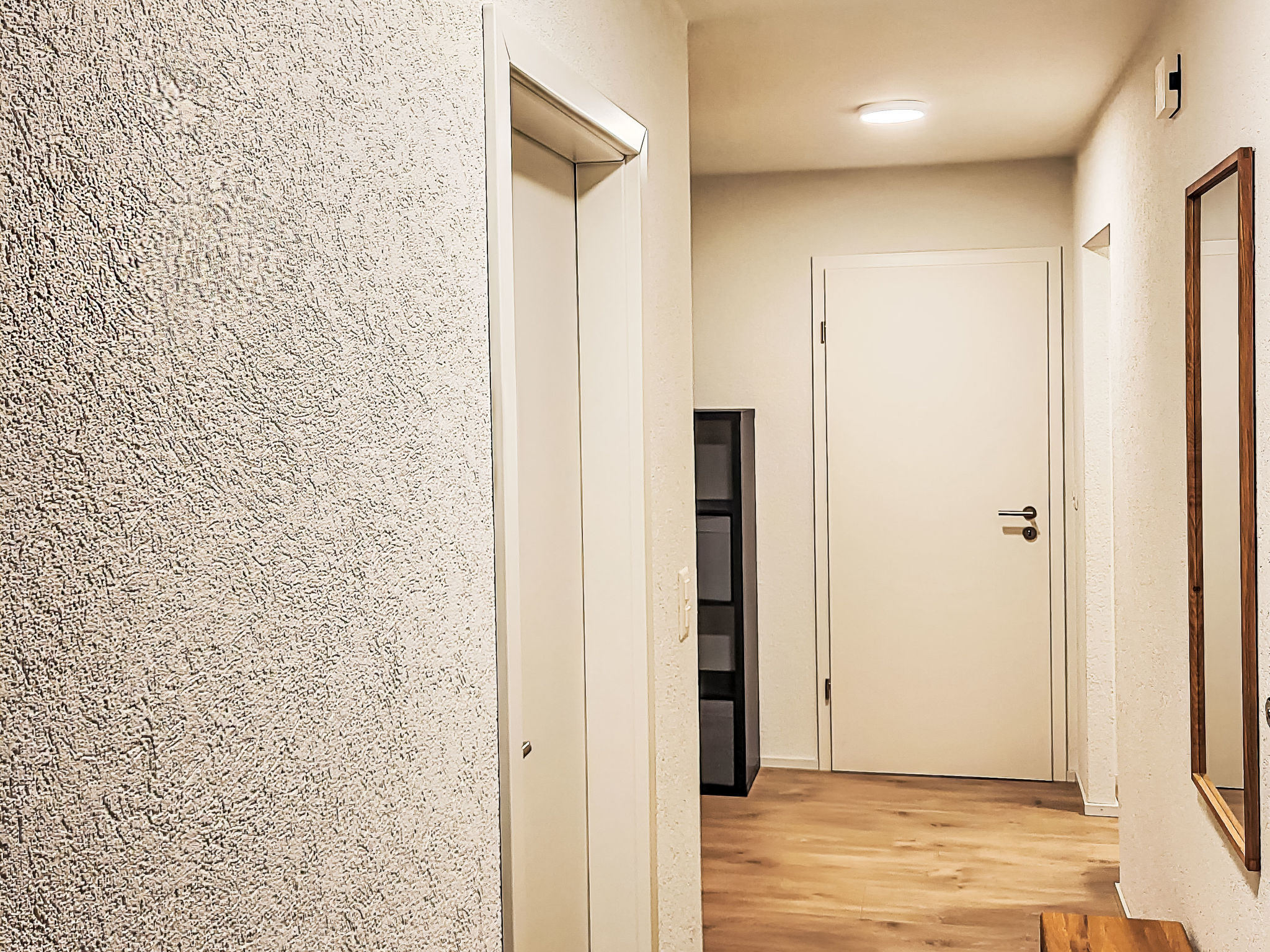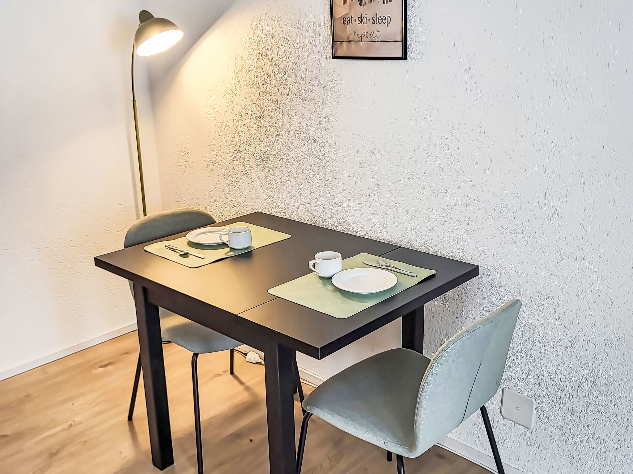 1-Zimmer-Wohnung 43 m2 im 2. Stock. Vollständig renoviert im Jahre 2021, komfortabel und gemütlich eingerichtet: Wohn-/Esszimmer mit 1 Doppelbett (160 cm, Länge 200 cm), Kabel-TV (Flachbildschirm). Ausgang zum Balkon. Küche (Backofen, Geschirrspüler, 4 Glaskeramikherd Platten, elektrische Kaffeemaschine). Dusche/WC. Balkon, Südlage. Balkonmöbel. Schöne Sicht auf die Berge, das Tal und die Ortschaft. Zur Verfügung: Haartrockner. Internet (Wireless LAN, gratis). Bitte beachten: Nichtraucher-Unterkunft.