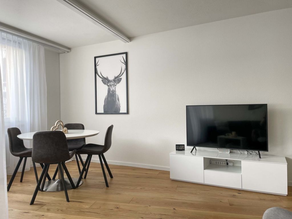 1-Zimmer-Wohnung 47 m2 im 4. Stock, Südwestlage. Teilweise renoviert im Jahre 2020, komfortabel und modern eingerichtet: offenes Wohn-/Esszimmer mit 1 Diwanbett (160 cm, Länge 200 cm), 1 Doppelbett (180 cm, Länge 200 cm), Kabel-TV (Flachbildschirm). Ausgang zum Balkon. Kleine, offene Küche (3 Kochplatten, Backofen, Tiefkühler, elektrische Kaffeemaschine) mit Esstisch. Bad/WC. Heizung. Balkon, Südlage. Balkonmöbel. Schöne Sicht auf die Berge, die Landschaft und die Ortschaft. Zur Verfügung: Internet (Wireless LAN, gratis). Parkplatz. Bitte beachten: Nichtraucher-Unterkunft.