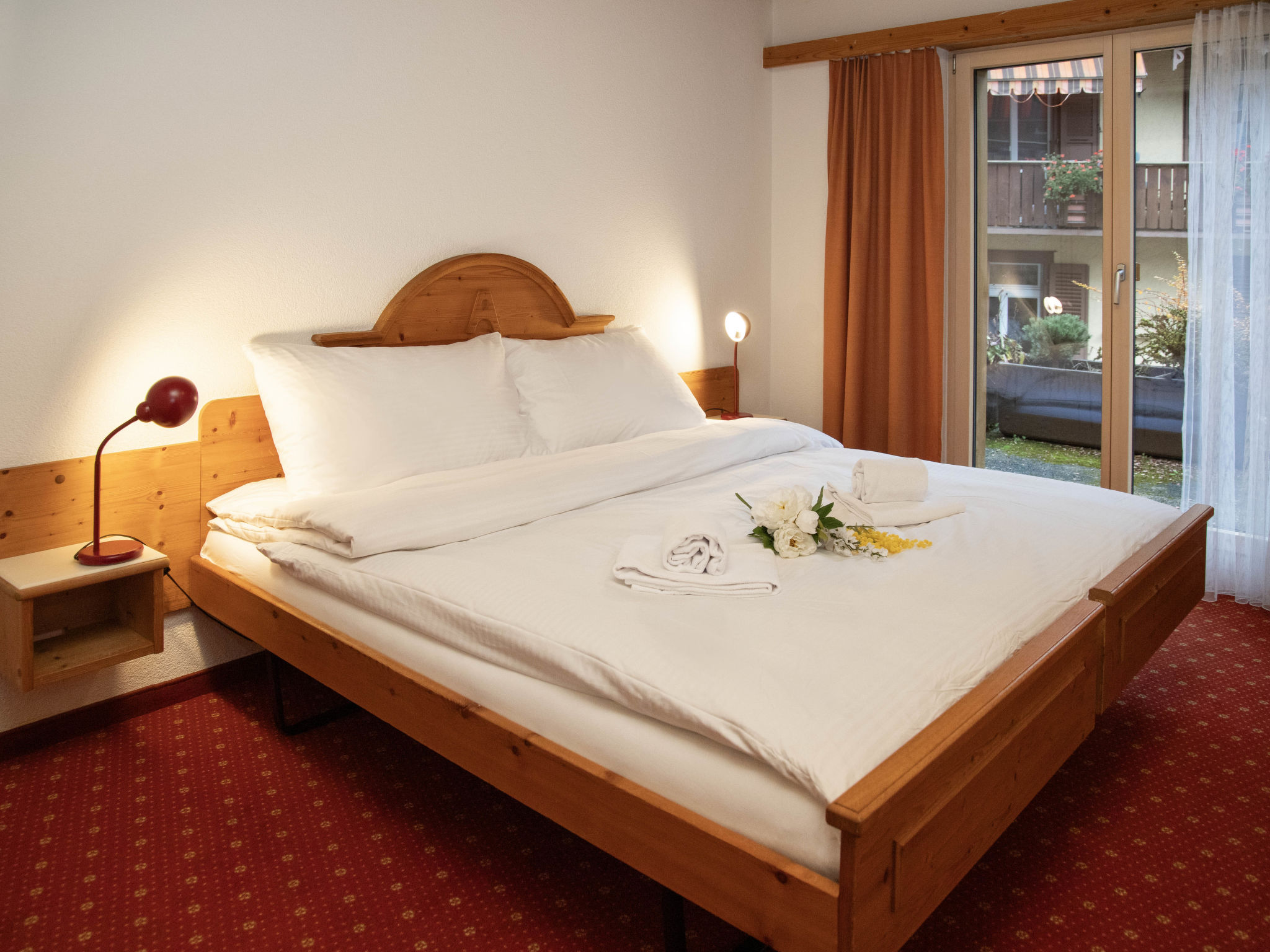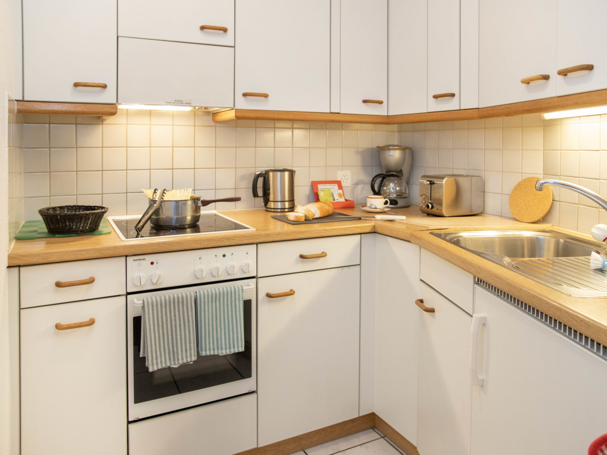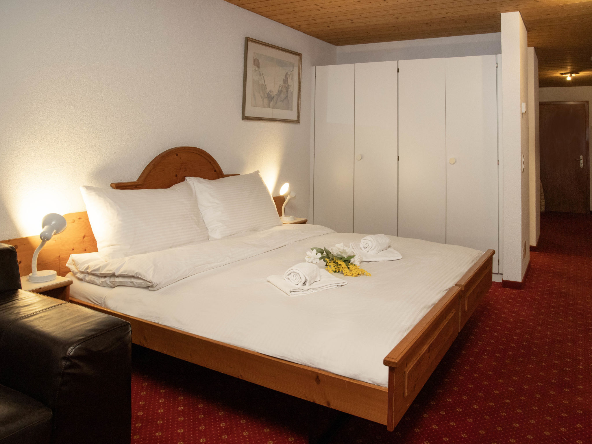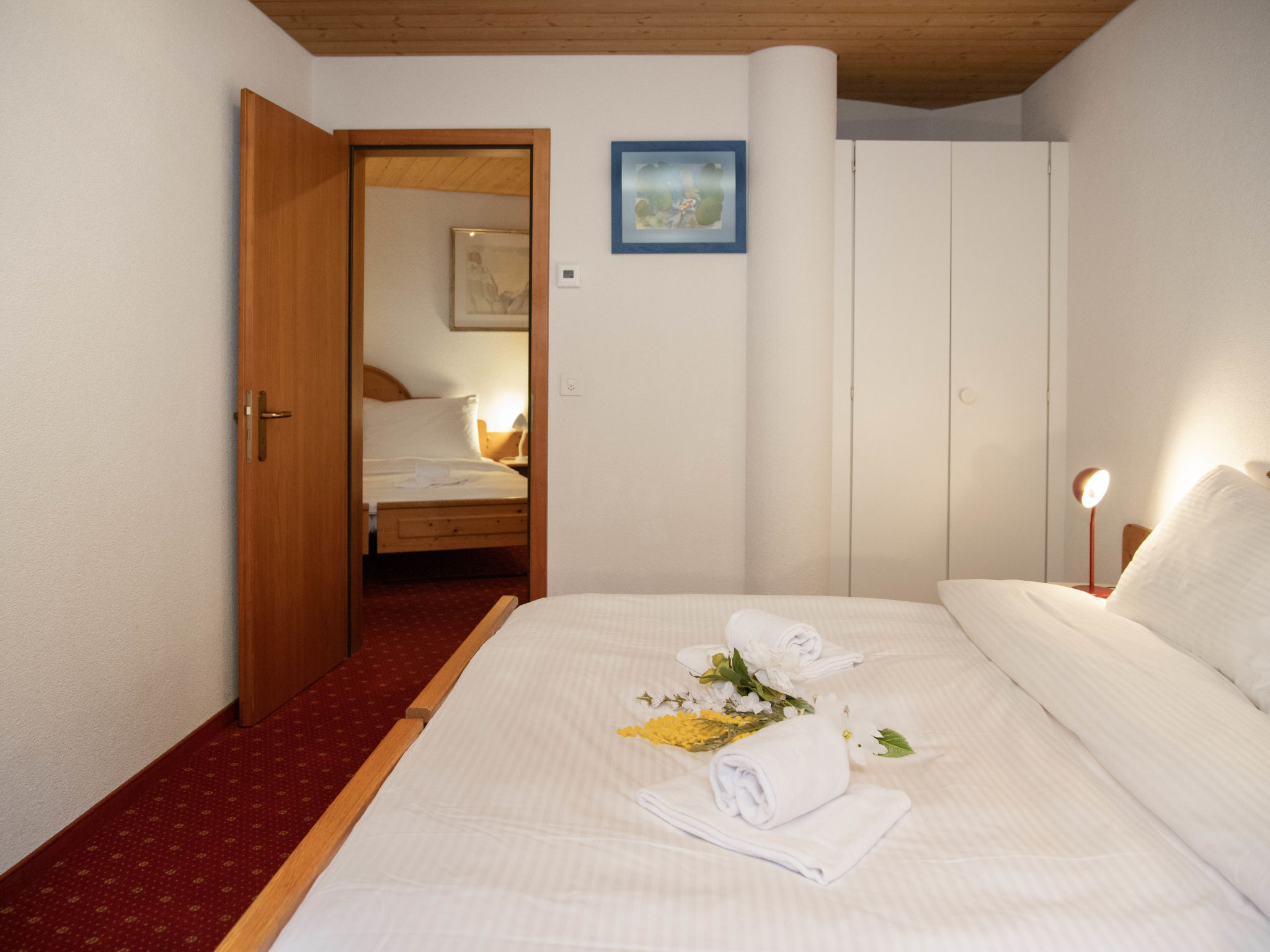 2-Zimmer-Wohnung 53 m2 im 1. Stock, Südostlage. Wohn-/Esszimmer mit 2 Betten und Kabel-TV (Flachbildschirm). 1 Doppelzimmer. Offene Küche (Backofen, 4 Glaskeramikherd Platten, Toaster, Wasserkocher, elektrische Kaffeemaschine). Bad/WC. Kleiner Balkon, Südlage, Terrasse. Terrassenmöbel. Schöne Sicht auf die Berge. Zur Verfügung: Haartrockner. Internet (Wireless LAN, gratis). Bitte beachten: Nichtraucher-Unterkunft. Maximal 1 Haustier/Hund erlaubt. Ein Fondue Set (Fleisch oder Käse) sowie ein Raclette Ofen kann an der Rezeption ausgeliehen werden.