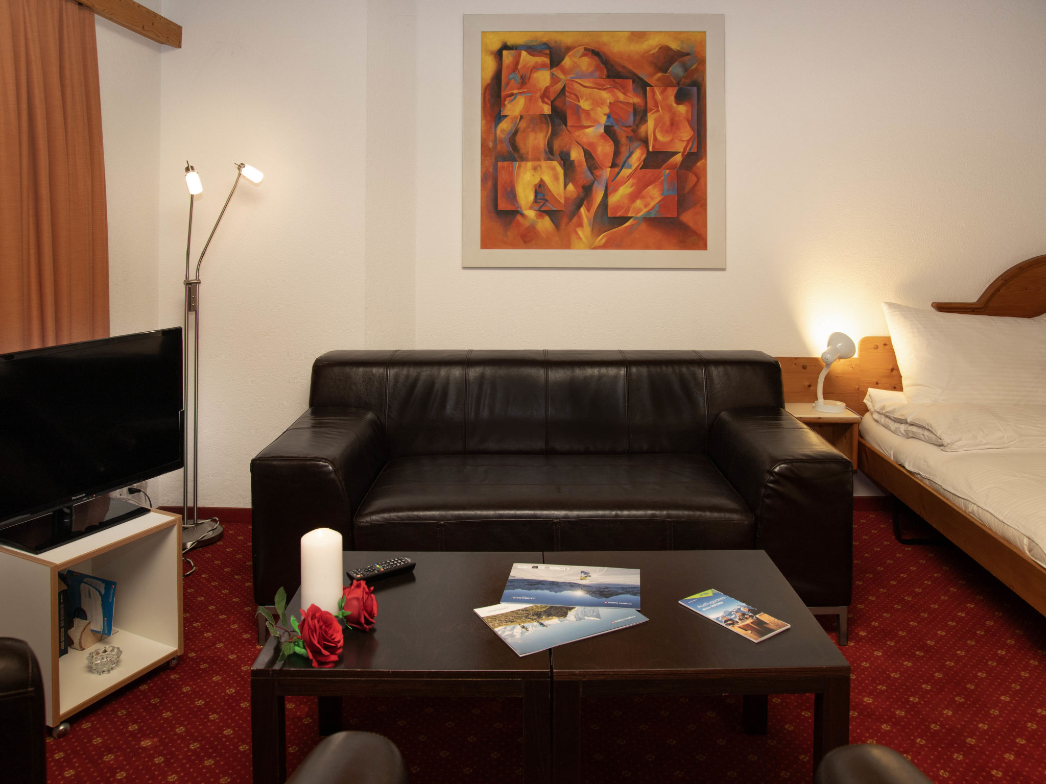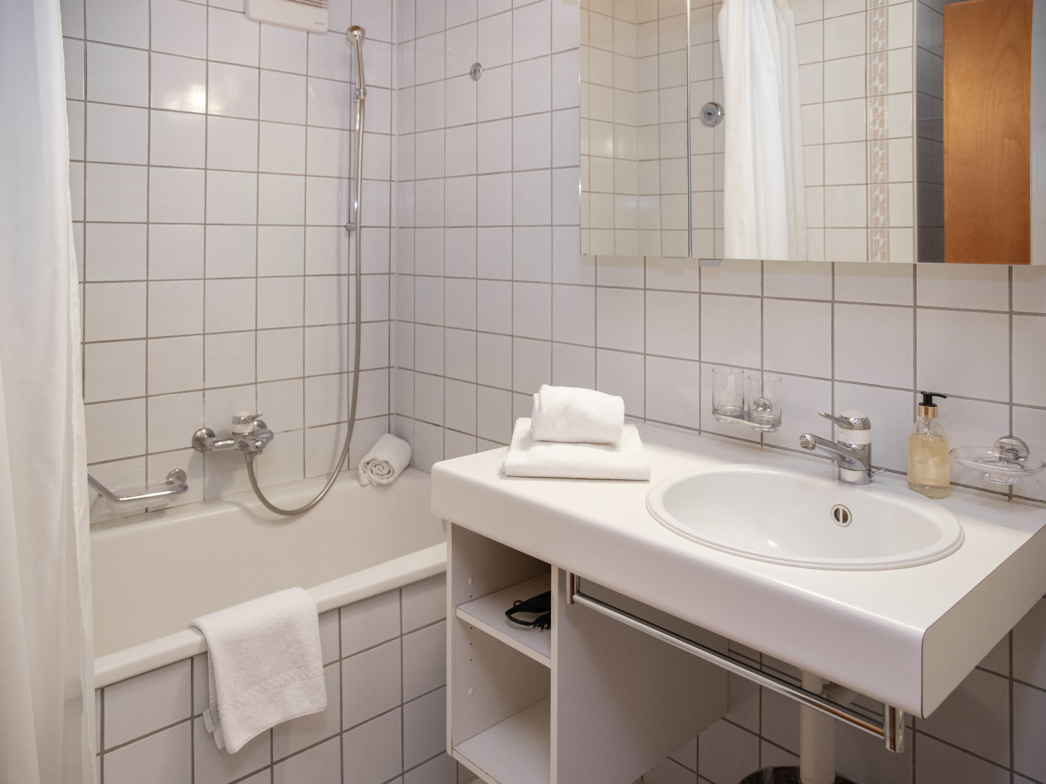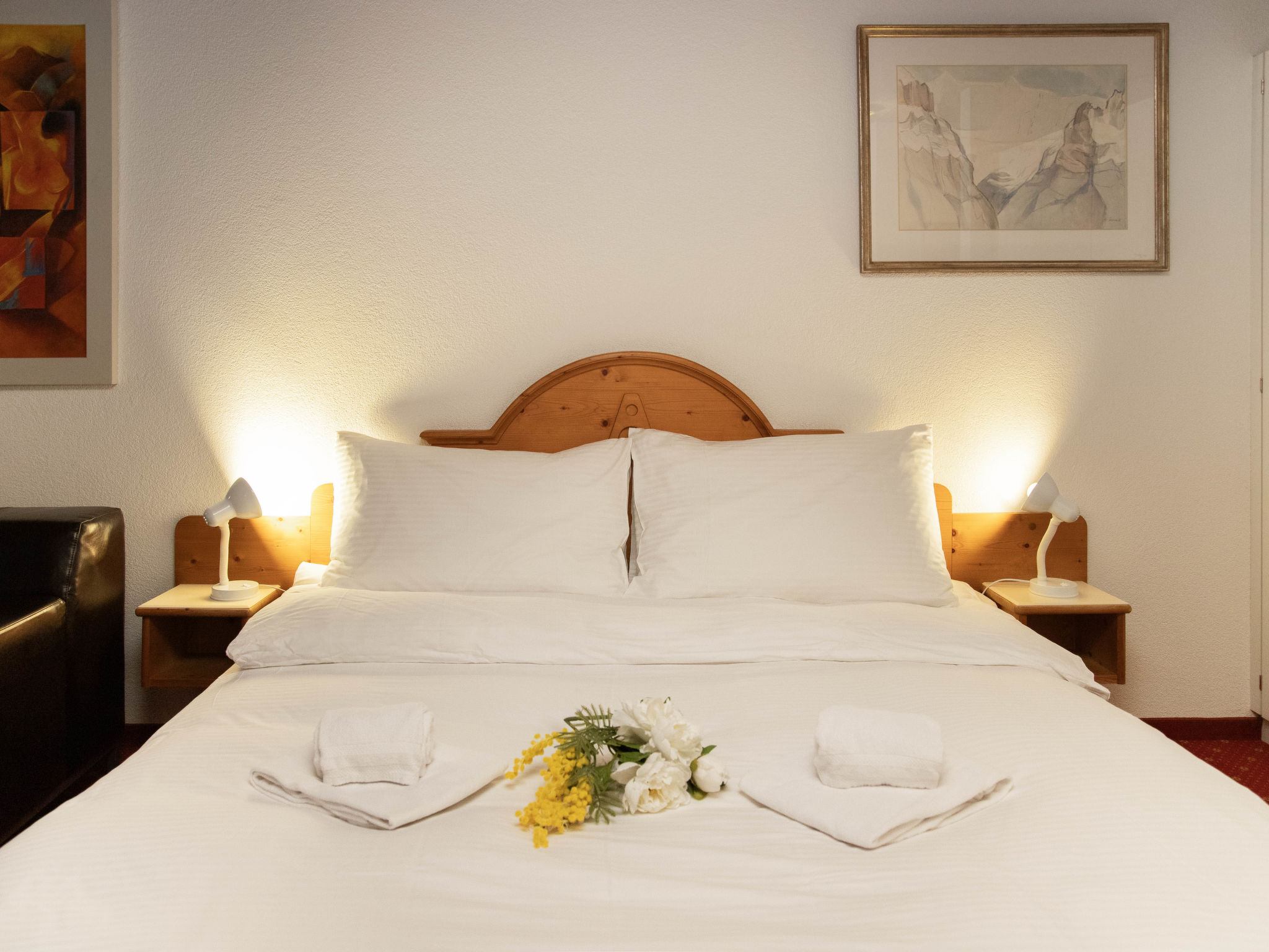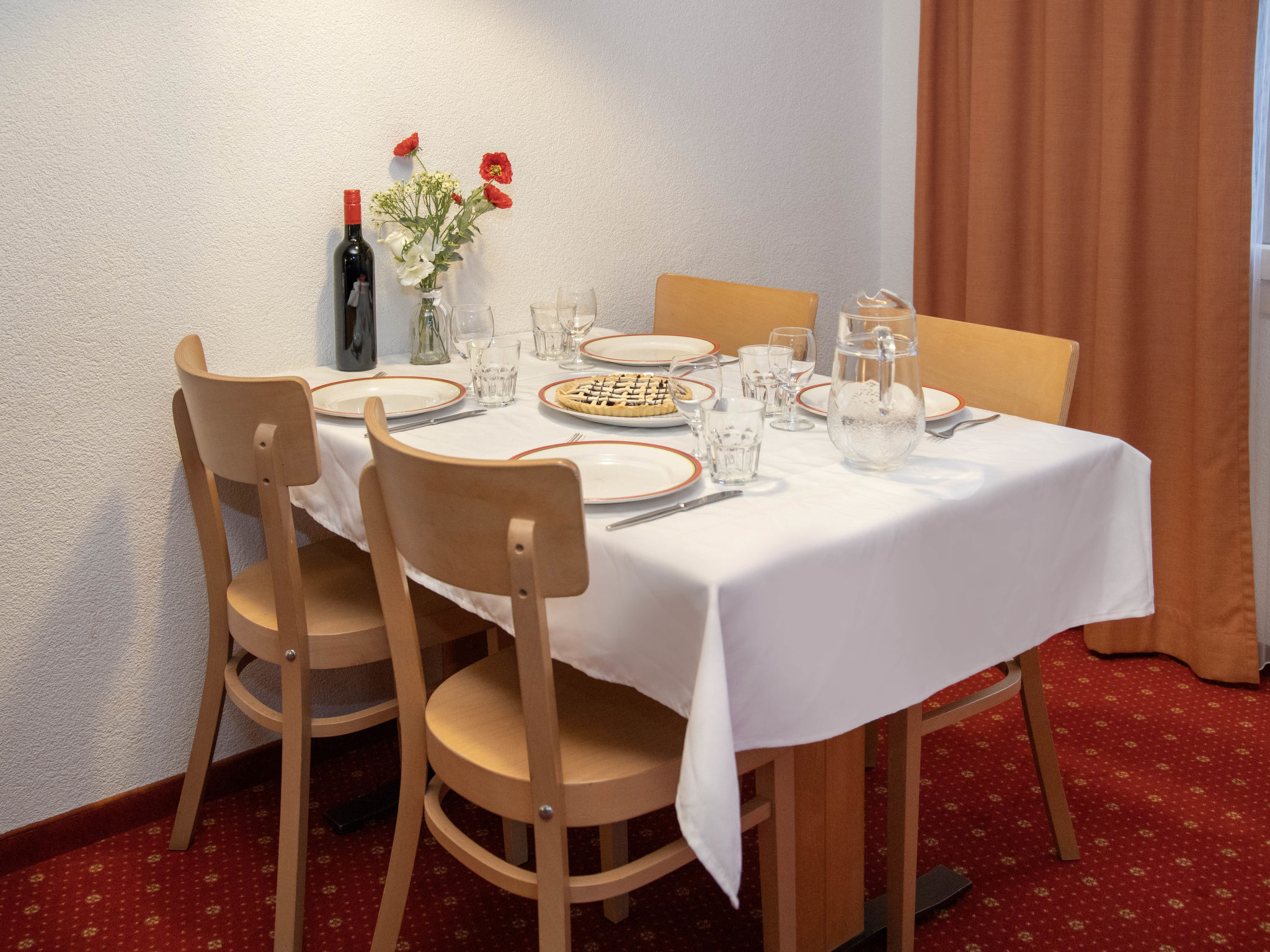 2-Zimmer-Wohnung 53 m2 im 1. Stock, Südostlage. Wohn-/Esszimmer mit 2 Betten und Kabel-TV (Flachbildschirm). 1 Doppelzimmer. Offene Küche (Backofen, 4 Glaskeramikherd Platten, Toaster, Wasserkocher, elektrische Kaffeemaschine). Bad/WC. Kleiner Balkon, Südlage, Terrasse. Terrassenmöbel. Schöne Sicht auf die Berge. Zur Verfügung: Haartrockner. Internet (Wireless LAN, gratis). Bitte beachten: Nichtraucher-Unterkunft. Maximal 1 Haustier/Hund erlaubt. Ein Fondue Set (Fleisch oder Käse) sowie ein Raclette Ofen kann an der Rezeption ausgeliehen werden.