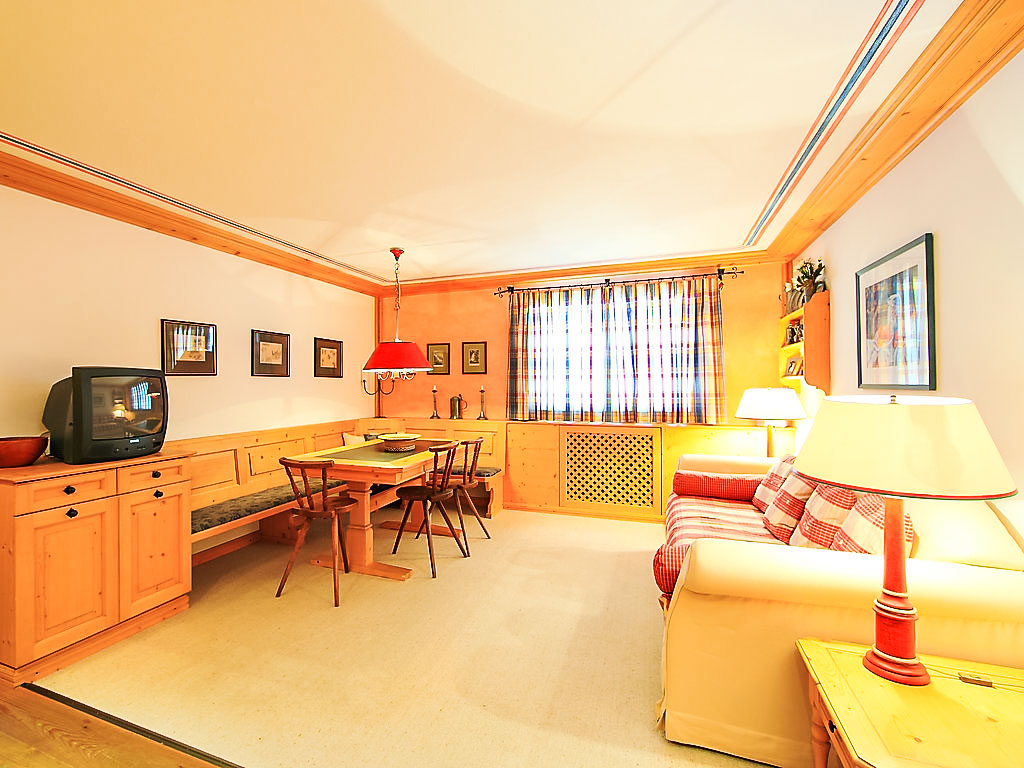 "57-4", 2-Zimmer-Wohnung 47 m2, Nordlage. Rustikal und gemütlich eingerichtet: Wohn-/Esszimmer mit TV und Radio. 1 Zimmer mit 2 Betten. Offene Küche (Backofen, Geschirrspüler). Bad/WC. Sicht auf die Berge, die Ortschaft und den Wald. Bitte beachten: Nichtraucher-Unterkunft.