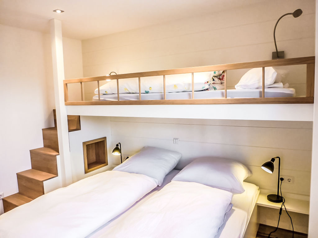 3-Zimmer-Haus 56 m2. Objekt geeignet für 4 Erwachsene + 1 Kind. Stilvoll und gemütlich eingerichtet: Wohn-/Esszimmer mit Sat-TV (Flachbildschirm). Ausgang zur Terrasse. 2 Zimmer, jedes Zimmer mit 1 Doppelbett (2 x 80 cm, Länge 200 cm). Offene Küche (Backofen, Geschirrspüler, 4 Glaskeramikherd Platten, Toaster, Wasserkocher, Mikrowelle, elektrische Kaffeemaschine). Dusche/WC. Terrassenmöbel, Gartengrill, Wintergarten. Zur Verfügung: Waschmaschine, Wäschetrockner, Kinderhochstuhl, Haartrockner. Internet (Wireless LAN, gratis). Blu-Ray Player. Bitte beachten: Nichtraucher-Haus. Maximal 2 Haustiere/Hunde erlaubt. Zugang zum Wintergarten durch eines der Zimmer mit Doppelbett. Zusätzliche Nespresso-Kaffeemaschine (Kapseln extra). Das buchbare Zusatzbett ist ein Hochbett in einem der Doppelzimmer (80x200).