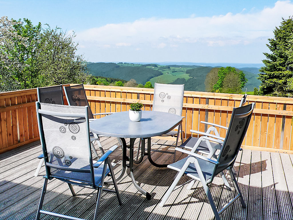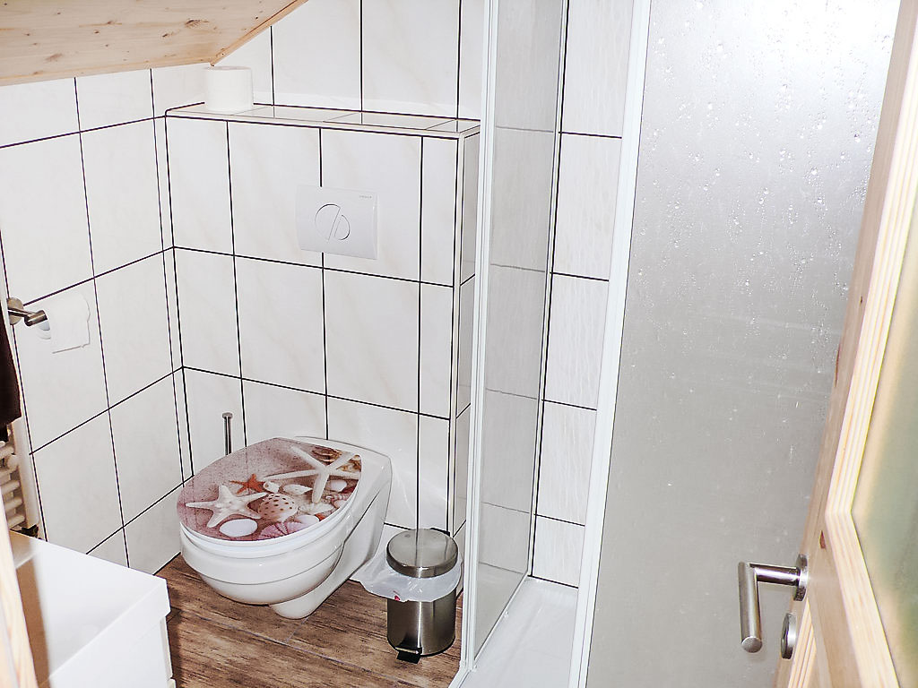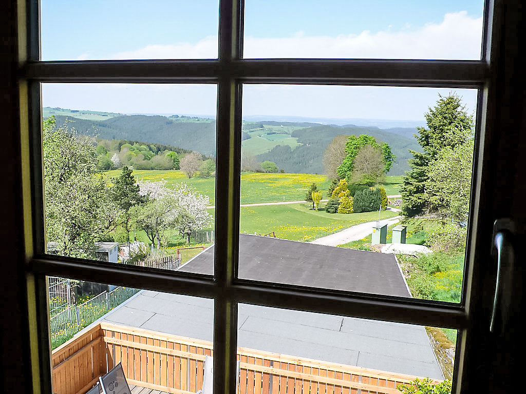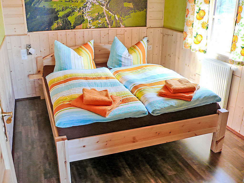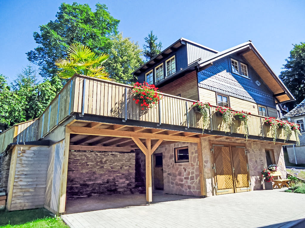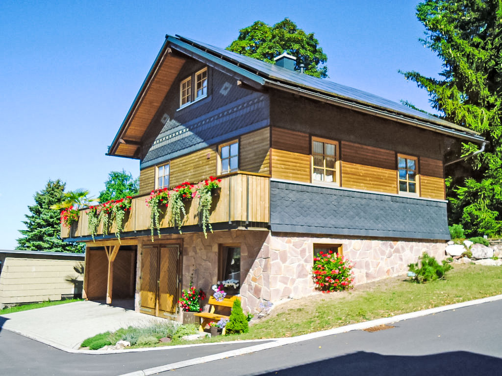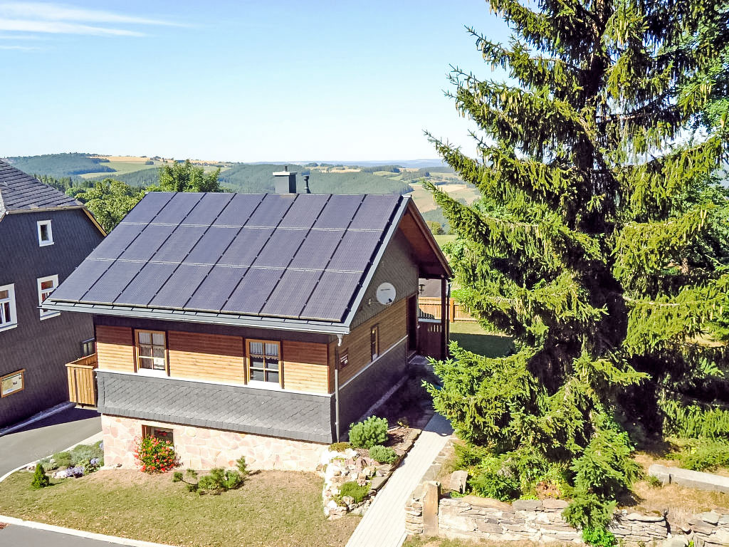 Holzhaus "Weitsicht". Im Ort, 2 km vom Zentrum von Oberweissbach, ruhige, sonnige Lage am Hang, im Grünen. Zur Alleinbenutzung: kleiner Garten 25 m2 mit Rasen. Im Hause: Zentralheizung. Zur Verfügung: Fahrräder (3) (extra). Parkplatz (für 2 Autos, überdacht) beim Haus. Einkaufsgeschäft 2 km, Lebensmittelgeschäft 2 km, Supermarkt 2 km, Restaurant 100 m, Bushaltestelle 2 km, Bahnstation "Bergbahn" 300 m, Freibad 2 km, Hallenbad 10 km. Reitstall 3 km, Wanderwege ab Haus 100 m, Skilift 3 km, Skischule 5 km, Langlaufloipe 3 km, Kinderspielplatz 150 m. Bitte beachten: Fahrzeug empfohlen. Ebenerdiger Zugang zum Haus (Zugang vom Parkplatz zum Haus über 15 Stufen). Auf Wunsch und nach Absprache kann die 2-Personen-Sauna im Wohnhaus des Eigentümers in 20 m Entfernung genutzt werden (EUR 5.00/Person). Fahrradverleih (21-Gang) EUR 3.00/Rad/Tag. Rodelhang hinter dem Haus.