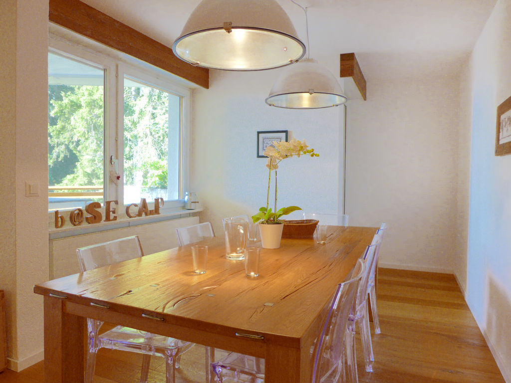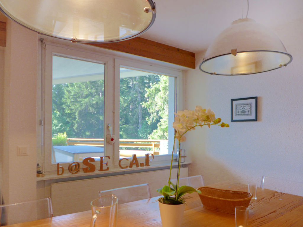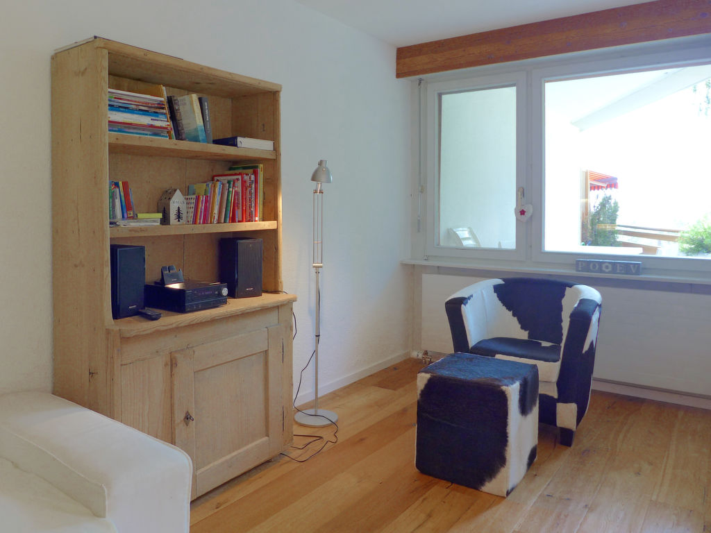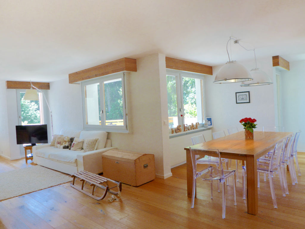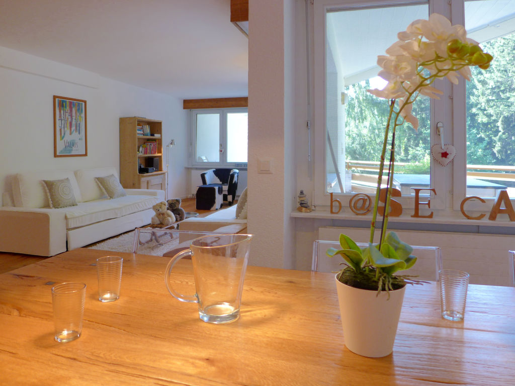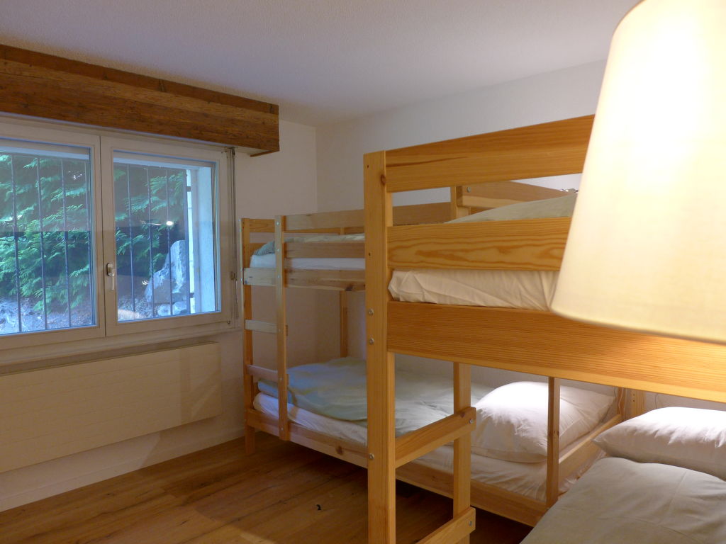 3-Zimmer-Wohnung 100 m2 im 2. Stock. Geräumig, komfortabel eingerichtet: grosses Wohn-/Esszimmer mit 1 Diwanbett, Bad/WC, Doppelwaschbecken und Kabel-TV. Ausgang zur Terrasse, Richtung Westen. 1 Zimmer mit 1 franz. Bett (140 cm, Länge 200 cm). 1 Zimmer mit 2 x 2 Etagenbetten (90 cm, Länge 200 cm). Offene Küche (Backofen, Geschirrspüler, 4 Glaskeramikherd Platten, Toaster, Wasserkocher, Mikrowelle, elektrische Kaffeemaschine, Kapseln für die Kaffeemaschine (Nespresso / Delizio) extra, Racletteofen, Fondue Set (Käse)). Dusche/WC. Grosse Terrasse. Terrassenmöbel, Liegestühle (2). Sicht auf den Wald. Zur Verfügung: Bügeleisen, Haartrockner. Internet (Wireless LAN, gratis). Garage Nr. 73, Höhe 200 cm, Breite 220 cm. Bitte beachten: Nichtraucher-Unterkunft.