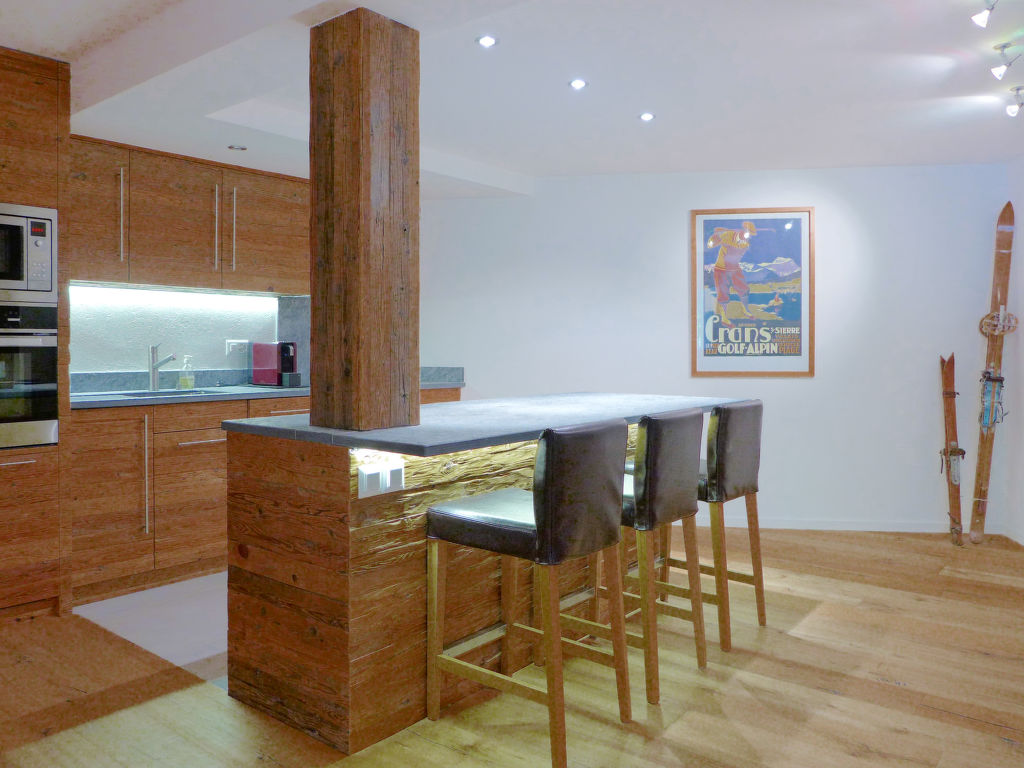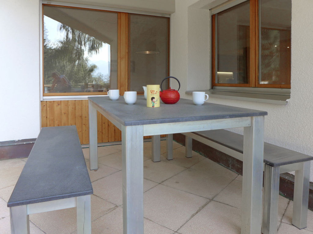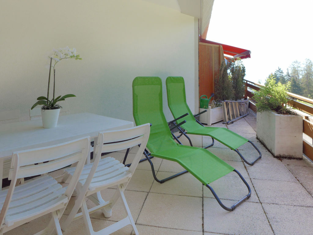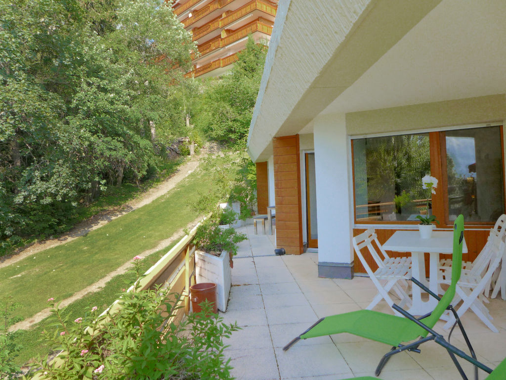 Terrassenhaus "Terrasse des Alpes". Im Ortsteil Marigny, 400 m vom Zentrum von Montana, sonnige Lage. Zur Mitbenutzung: Hallenbad beheizt (12 x 5 m, saisonale Verfügbarkeit: 01.Jan.-31.Okt. und 01.Dez.-31.Dez. Öffnungszeiten Schwimmbad: 08:00-20:00). Sprudelbad, Terrasse. Im Hause: Aufenthaltsraum, Fahrstuhl, Skiraum, Waschmaschine, Wäschetrockner (zur Mitbenutzung, extra). Einkaufsgeschäft, Supermarkt, Restaurant, Bar, Café 400 m, Bushaltestelle "Montana Poste" 300 m. Golfplatz (18 Loch) 3.8 km, Skisportanlagen 1.5 km. COVID-Messungen: Zugang zum Pool mit 2G+. Schwimmbad (ca. 26°) und Sprudelbad (ab 16 Jahre alt) im November geschlossen. Das Gebäude wurde auf einem geneigten Grundstück erbaut. Die Stockwerke werden als Ebenen betrachtet, die ab Residenzboden nummeriert sind. Bei starkem Schneefall, ist es gemäss den Anweisungen des Administrators untersagt, die Terrassen vom Schnee zu räumen.