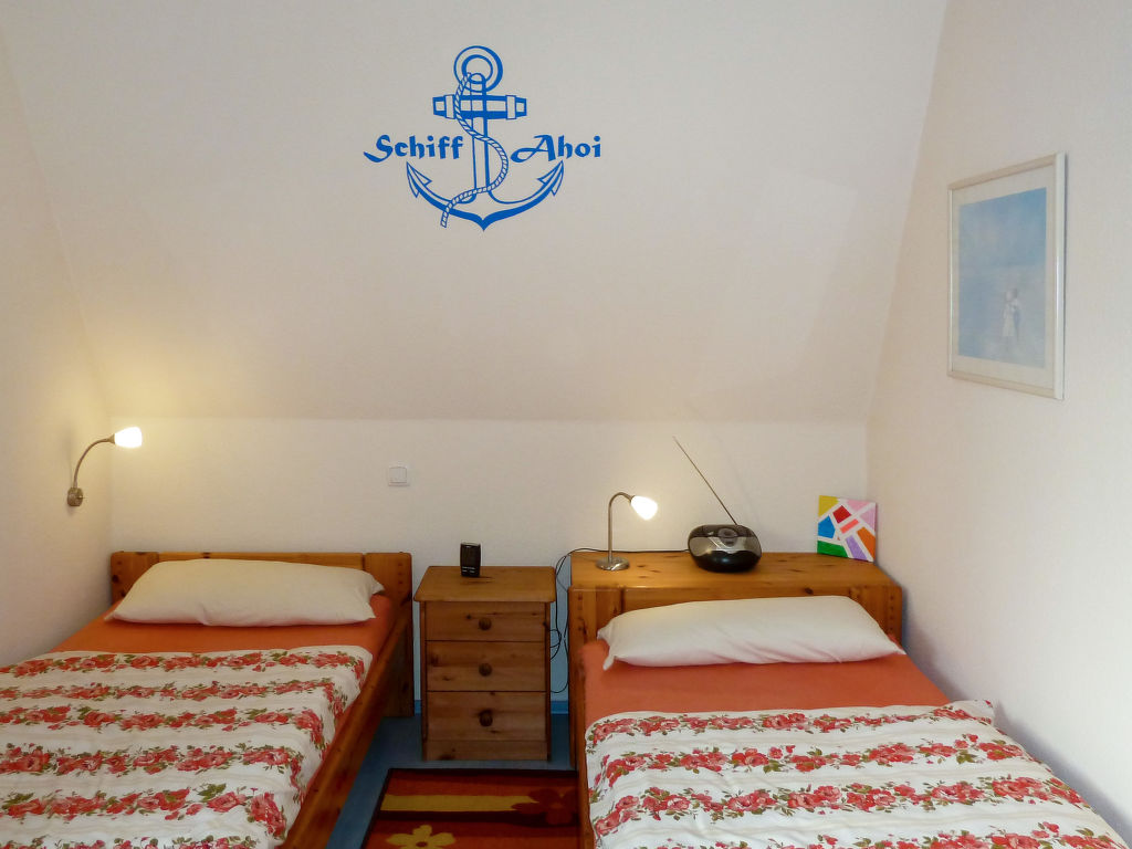 "Kapitänskajüte", 3-Zimmer-Wohnung 58 m2 im 1. Stock. Komfortabel und stilvoll eingerichtet: Wohn-/Esszimmer mit Esstisch, Sat-TV, Radio, CD und DVD. Ausgang zum Balkon. 1 Zimmer mit 1 Doppelbett. 1 Zimmer mit 2 Betten. Offene Küche (Backofen, Geschirrspüler, 4 Glaskeramikherd Platten, Toaster, Wasserkocher, Mikrowelle, elektrische Kaffeemaschine). Dusche/WC. G-Heizung. Balkon. Balkonmöbel, Abstellkammer. Zur Verfügung: Kinderhochstuhl, Babybett. Garage (1 Auto), Höhe 200 cm. Bitte beachten: Nichtraucher-Unterkunft. Rauchmelder, Feuerlöscher.