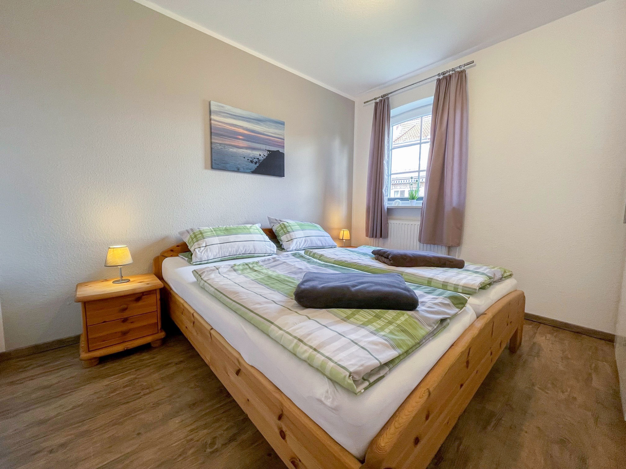4-Zimmer-Haus 95 m2 auf 2 Stockwerken, im Erdgeschoss. Modern und geschmackvoll eingerichtet: Wohn-/Esszimmer mit Schwedenofen und Sat-TV (Flachbildschirm), CD, Stereoanlage und DVD. Ausgang zur Terrasse. 1 Zimmer mit 1 Doppelbett (2 x 90 cm, Länge 200 cm). Kochnische (Backofen, Geschirrspüler, 4 Glaskeramikherd Platten, Toaster, Wasserkocher, Mikrowelle, elektrische Kaffeemaschine). Dusche/WC. Obergeschoss: 1 abgeschrägtes Zimmer mit 1 Doppelbett (2 x 90 cm, Länge 200 cm), Sat-TV (Flachbildschirm). 1 abgeschrägtes Zimmer mit 2 Betten (90 cm, Länge 200 cm). Dusche/WC. Terrassenmöbel, Gartengrill (mobil), Liegestühle (2), Abstellkammer. Zur Verfügung: Waschmaschine, Bügeleisen. Internet (Wireless LAN, gratis). Bitte beachten: Nichtraucher-Haus.