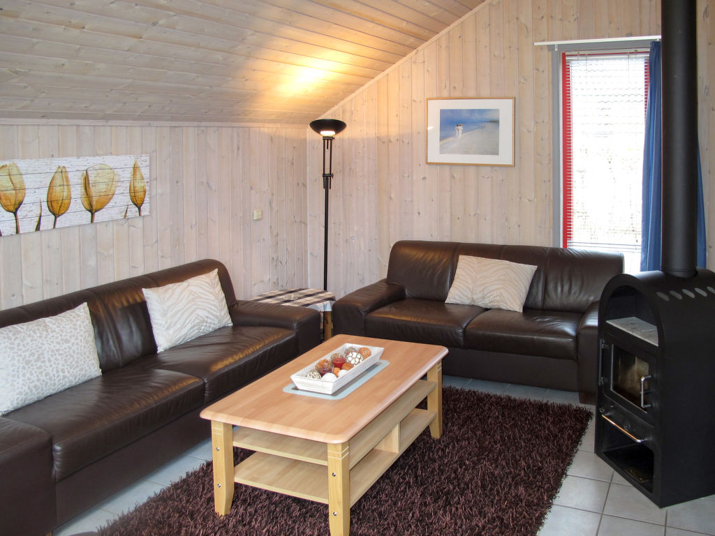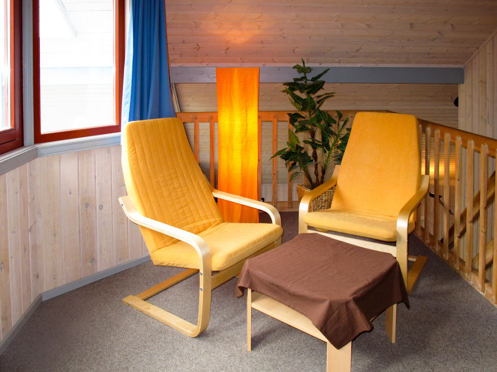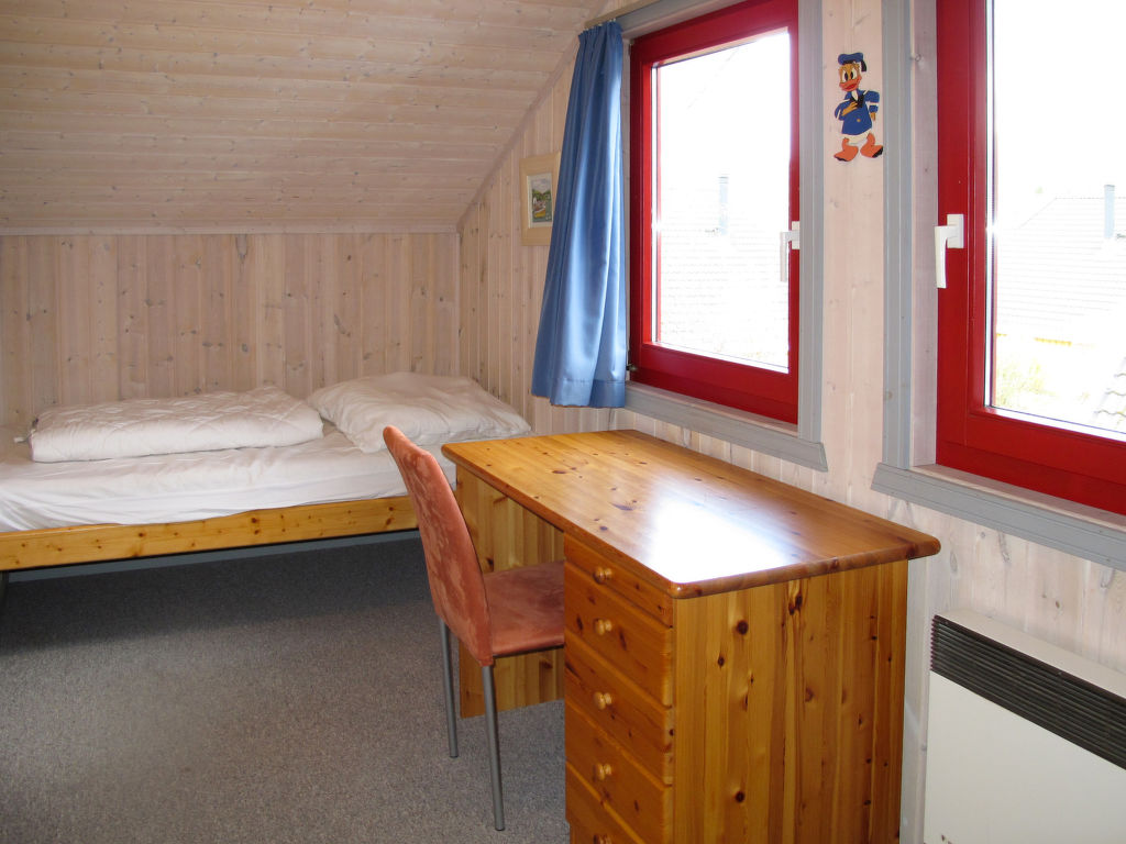 "Wildgans", 3-Zimmer-Doppelhaushälfte 80 m2 auf 2 Stockwerken. Gemütlich und mit viel Holz eingerichtet: Wohn-/Esszimmer mit Schwedenofen, Kabel-TV und Radio. Ausgang zur Terrasse. 1 Doppelzimmer. Kochnische (4 Kochplatten, Backofen, elektrische Kaffeemaschine). Dusche/WC, Sauna. E-Heizung. Obergeschoss: abgeschrägte, offene Galerie mit 2 Schlafmöglichkeiten. 1 abgeschrägtes Zimmer mit 2 Betten. Terrasse, Rasen 300 m2. Terrassenmöbel, Abstellkammer. Zur Verfügung: Kinderhochstuhl, Babybett (extra). Internet (Wireless LAN, gratis). Parkplatz beim Haus. Bitte beachten: Rauchmelder.