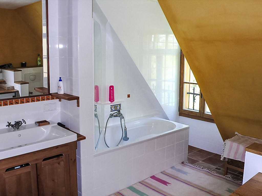 3-Zimmer-Haus 110 m2 auf 2 Stockwerken, im Erdgeschoss. Geschmackvoll und gemütlich eingerichtet: Wohnzimmer mit Kabel-TV (Flachbildschirm), Video, Stereoanlage, DVD und Holzofen. Ausgang zum Garten, zur Terrasse. Offene Küche (Backofen, Geschirrspüler, Mikrowelle, elektrische Kaffeemaschine) mit Esstisch. Bodenheizung. Obergeschoss: (Wendeltreppe) 1 abgeschrägtes Zimmer mit 1 x 2 Etagenbetten. 1 abgeschrägtes Doppelzimmer. Bad/WC. 2 Terrassen 50 m2. Terrassenmöbel, Gartengrill. Zur Verfügung: Waschmaschine, Kinderhochstuhl. Internet (Wireless LAN, gratis). Bitte beachten: Nichtraucher-Unterkunft. Videosammlung mit Kinderspielfilmen. Einrichtung zum Teil mit antiken Möbeln.