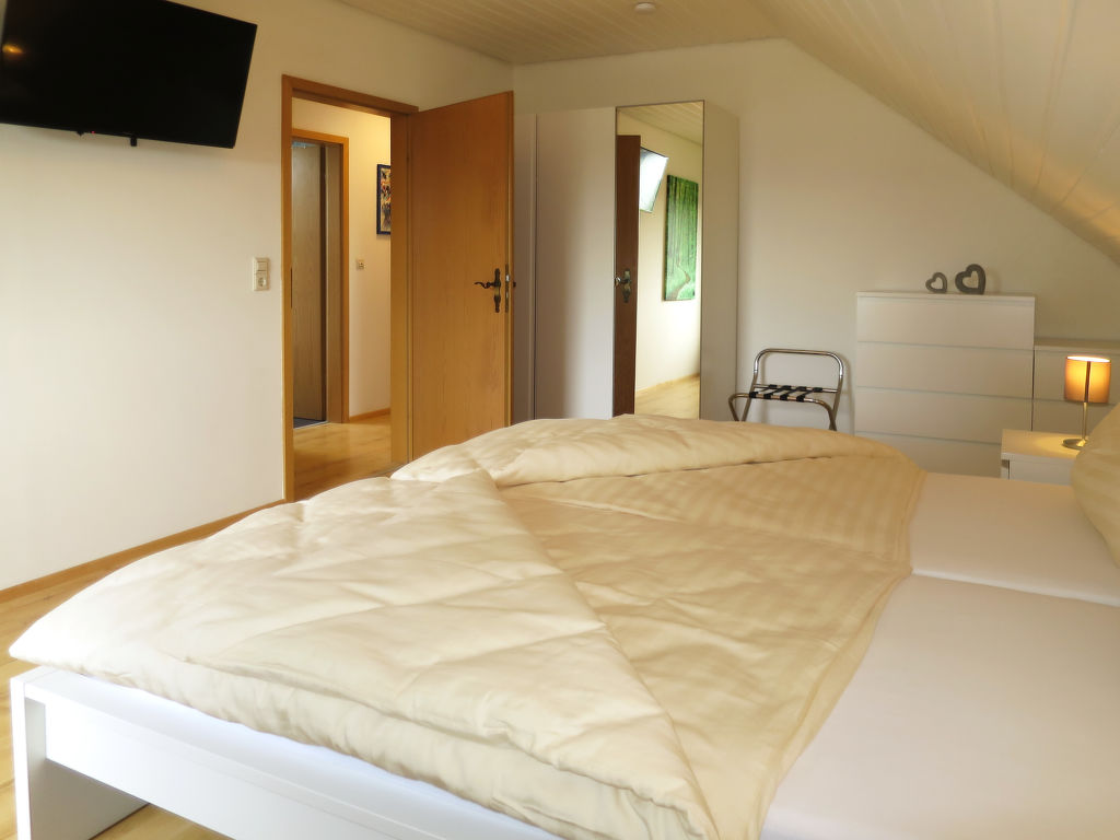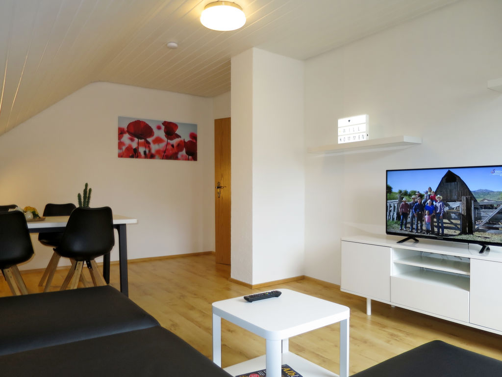 "Land in Sicht", 2-Zimmer-Wohnung 60 m2 im 1. Stock. Schön und geschmackvoll eingerichtet: Wohn-/Schlafzimmer mit 1 Doppeldiwanbett (160 cm), Esstisch und Sat-TV. 1 Zimmer mit 1 Doppelbett. Küche (Backofen, Geschirrspüler, 4 Glaskeramikherd Platten, Mikrowelle, elektrische Kaffeemaschine). Ausgang zum Balkon. Dusche/WC. Heizung. Balkon. Balkonmöbel. Zur Verfügung: Kinderhochstuhl, Babybett. Internet (Wireless LAN, gratis). Parkplatz. Bitte beachten: Nichtraucher-Unterkunft. Rauchmelder. Achtung: niedrige Türrahmen (1,75-1,80m) und niedrige Deckenhöhe (1,80-2,00m).