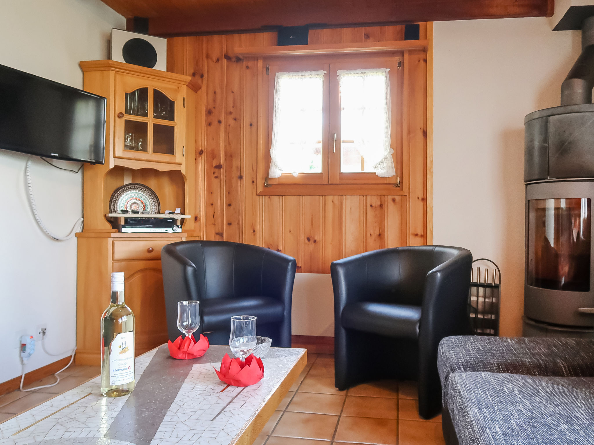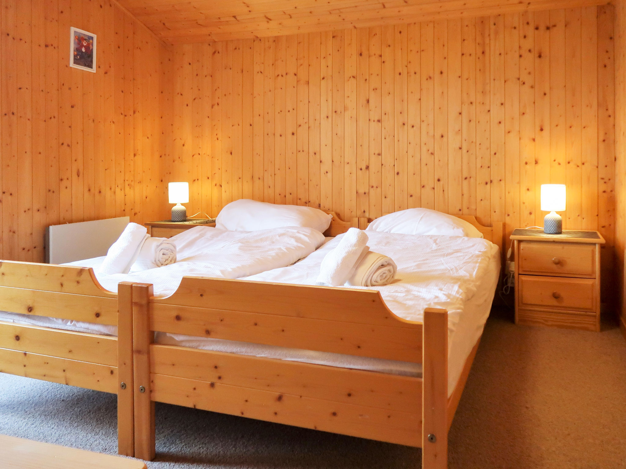 "Joseva", 4-Zimmer-Chalet 85 m2 im 2. Stock. Zweckmässig und schön eingerichtet: Eingang. Wohn-/Esszimmer mit Schwedenofen und Sat-TV. Ausgang zur Terrasse, Richtung Norden. Offene Küche (Backofen, Geschirrspüler, 4 Glaskeramikherd Platten, elektrische Kaffeemaschine, Kapseln für die Kaffeemaschine (Delizio) extra, Racletteofen, Fondue Set (Käse)). Dusche/WC. Obergeschoss: 1 Zimmer mit 1 franz. Bett (160 cm, Länge 200 cm). Ausgang zum Balkon. 1 Zimmer mit 2 Betten (90 cm, Länge 200 cm). Ausgang zum Balkon. 1 kleines Kinderzimmer mit 1 x 2 Etagenbetten (90 cm, Länge 190 cm). Bad/WC. Balkon, Nordlage, Terrasse, Nordlage und Westlage. Terrassenmöbel. Zur Verfügung: Waschmaschine, Wäschetrockner, Haartrockner. Internet (Wireless LAN, gratis). Parkplatz, Garage beim Haus, Höhe 240 cm, Breite 200 cm. Bitte beachten: Nichtraucher-Unterkunft. 1 Haustier/Hund erlaubt.